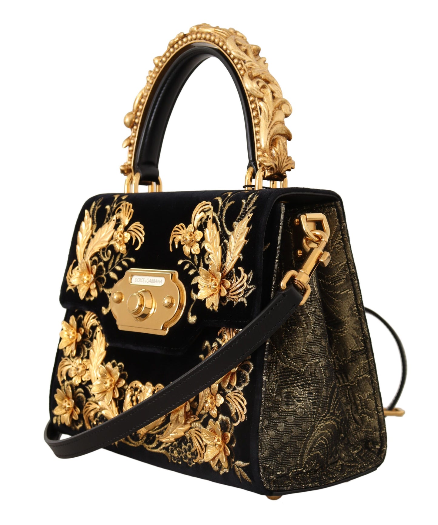 - Details: Gold metal hardware, Brocade and baroque detailing