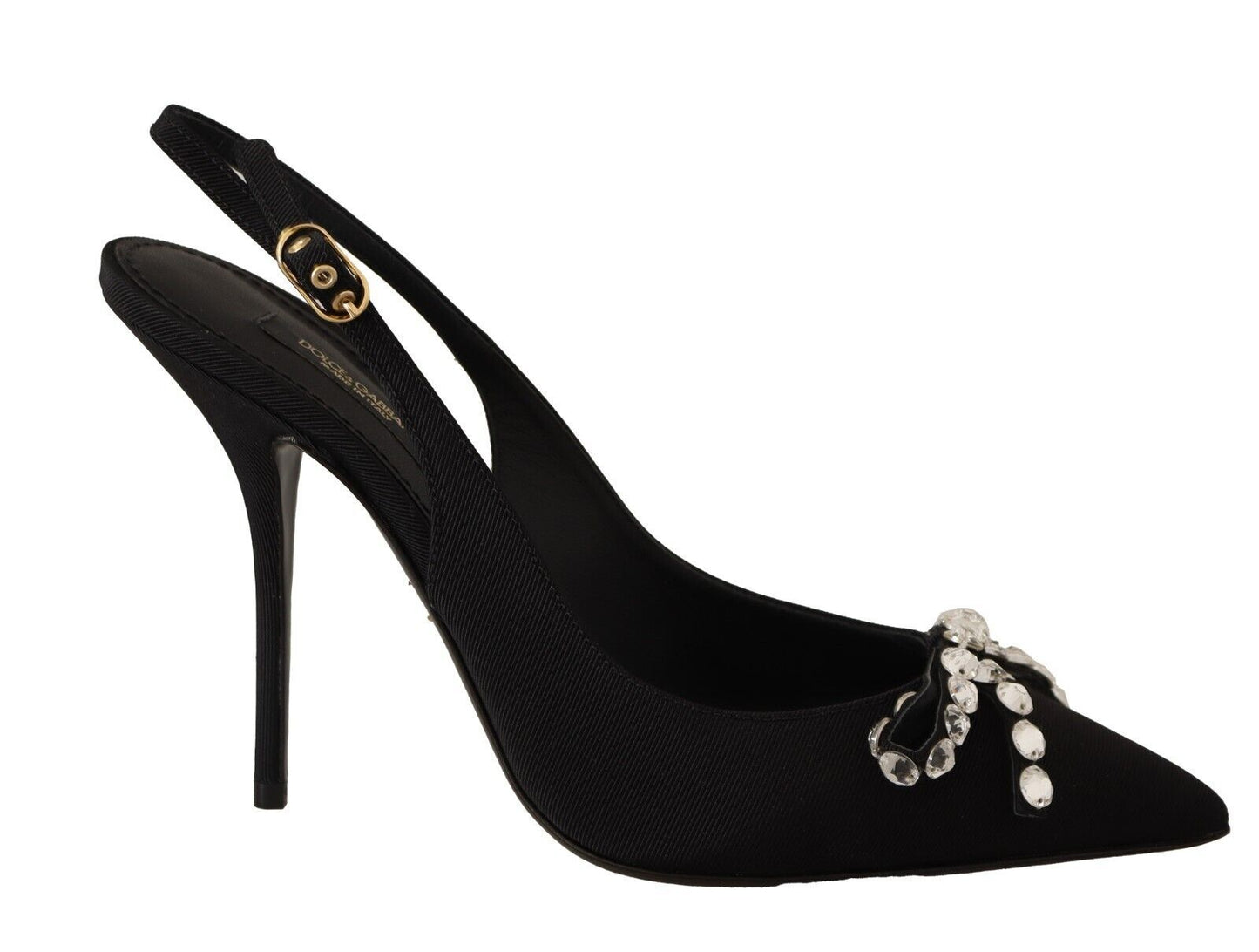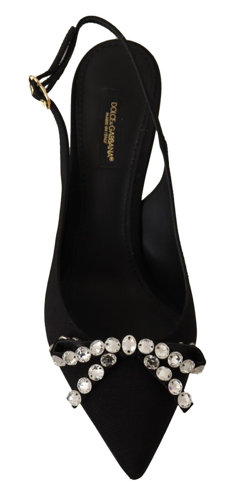 Step into a world of elegance with these stunning slingback heels from Dolce & Gabbana. Adorned with eye-catching clear crystals, these heels are brand new with tags, ensuring their authenticity and top-tier status. Made in Italy, they epitomize luxury with every step. The sleek black color and premium viscose material promise to complement any high-fashion ensemble, making them a must-have in your wardrobe.