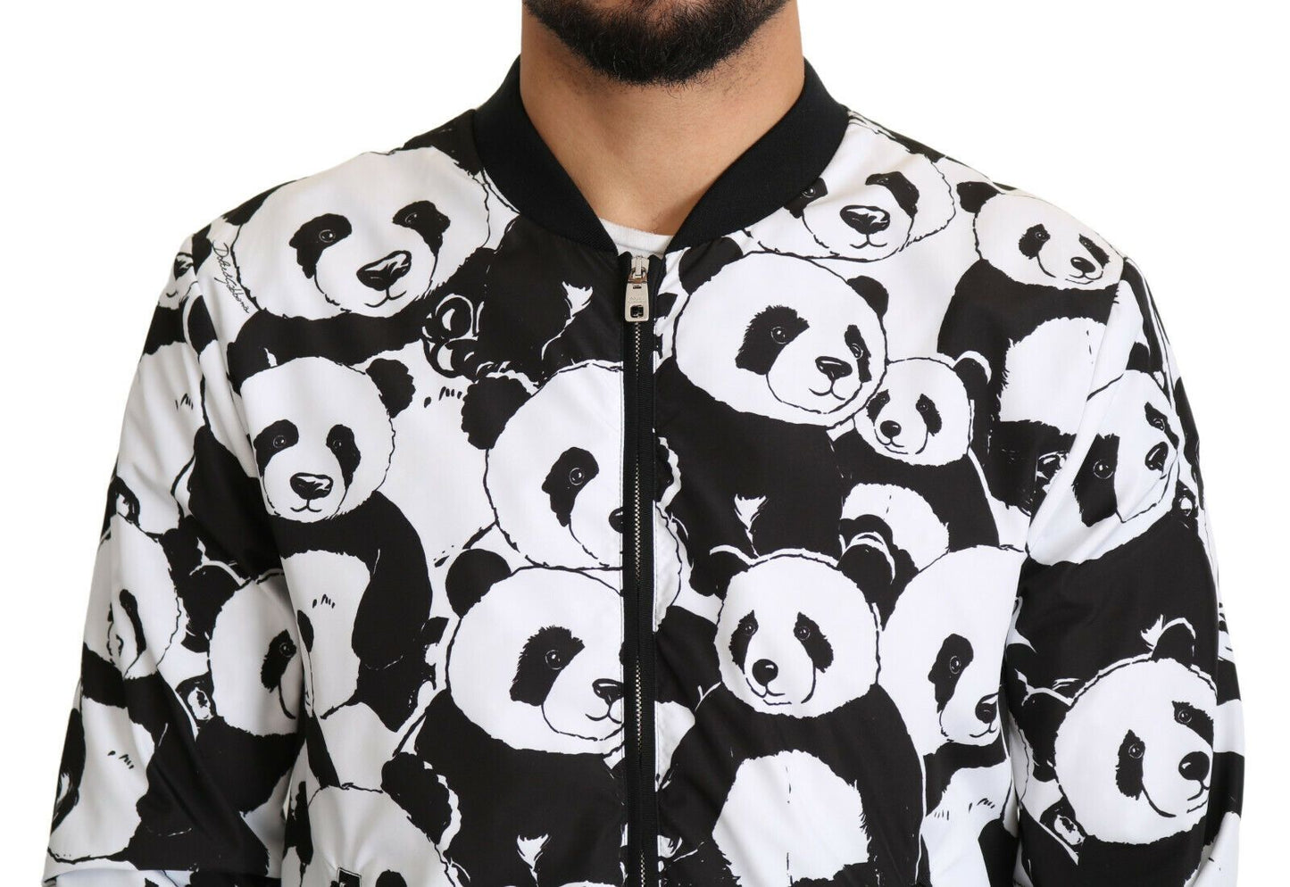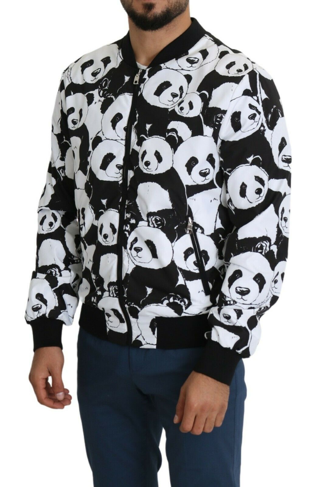 Envelop yourself in the epitome of Italian luxury with this stunning Dolce & Gabbana bomber jacket, showcasing a unique Panda print with chic DG logo accents. Crafted with meticulous attention to detail, this jacket features a comfortable knitted elastic collar, cuffs, and hem, complemented by two handy vertical zip pockets for your essentials. The full zipper closure ensures a seamless fit, making it an exceptional addition to your high-fashion repertoire.