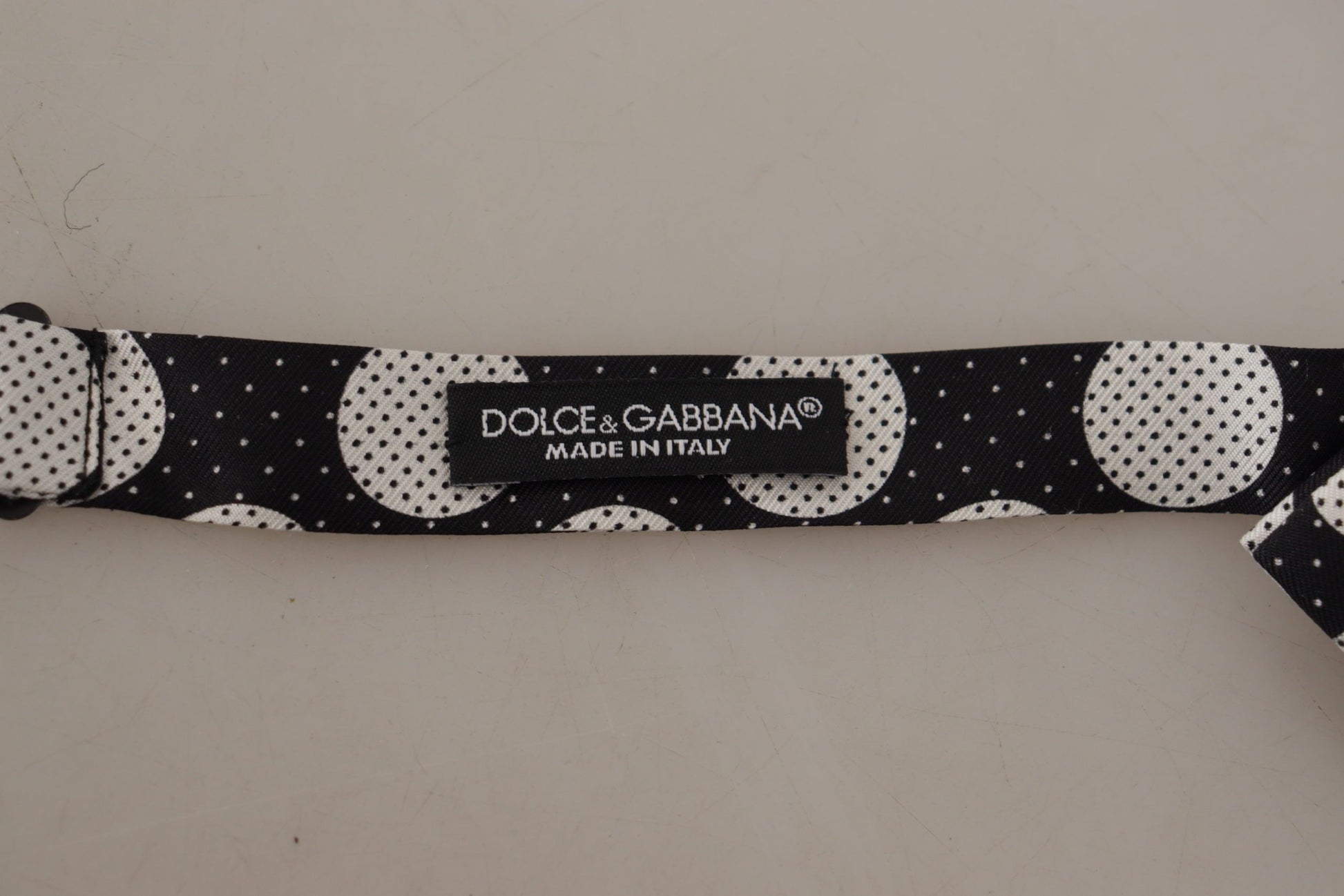 Step up your formal attire with this absolutely stunning, 100% authentic silk bow tie from Dolce & Gabbana. Designed with black and white polka dots for that classic, yet playful look, it’s the perfect accessory for any distinguished gentleman. Pre-tied for convenience, it features an adjustable neck strap to ensure a comfortable fit. Crafted in Italy, this piece exudes luxury and sophistication.