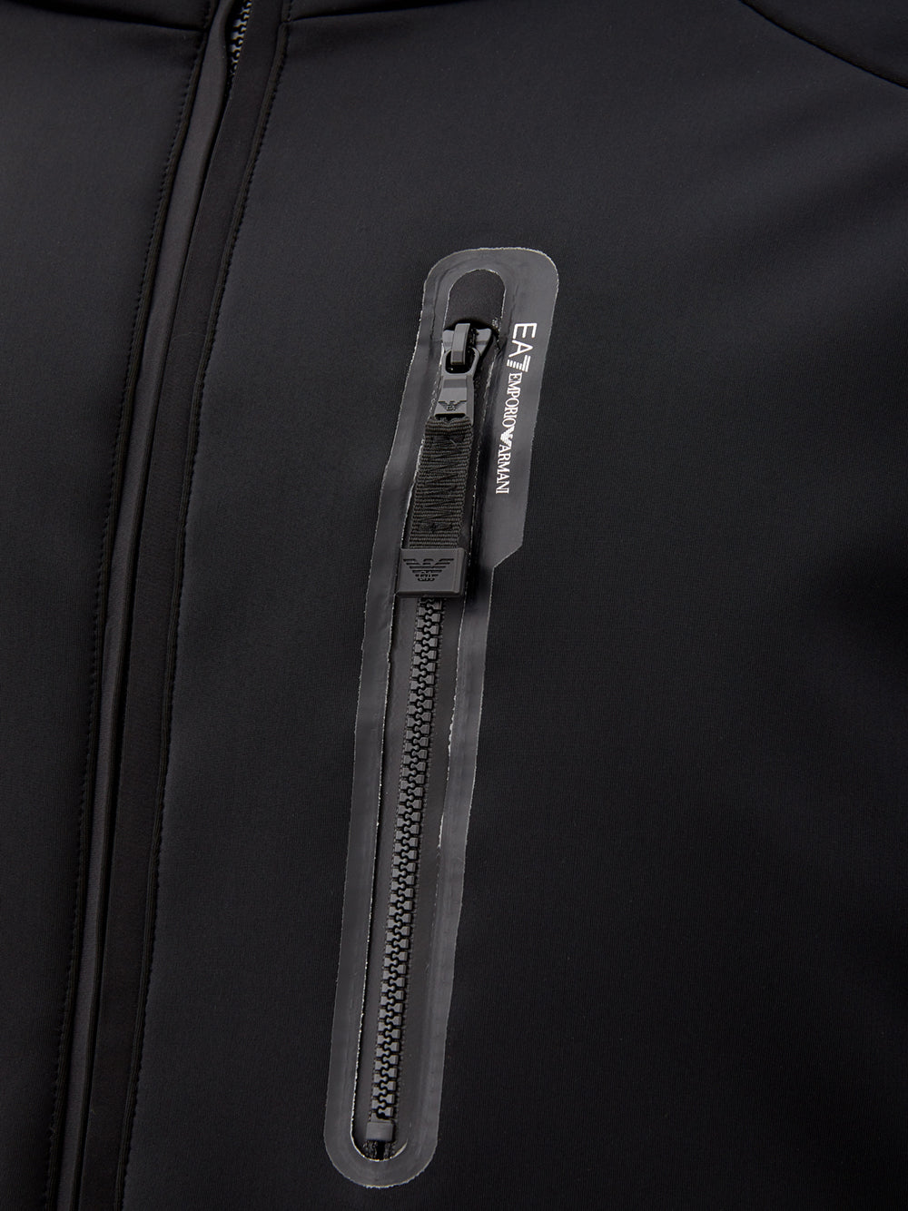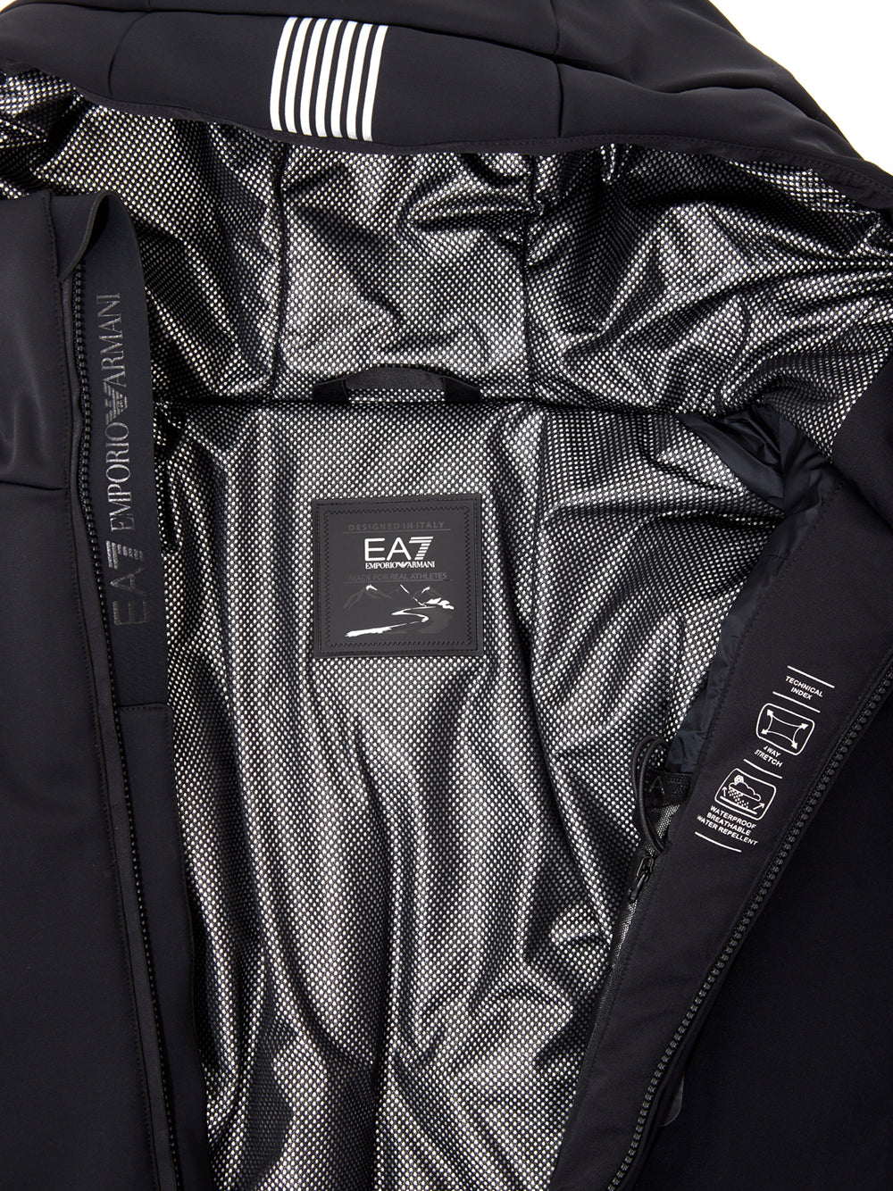 Embrace the epitome of sleek winter style with this elegant black technical jacket from EA7 Emporio Armani. This high-performance piece is engineered to shield you from the elements, boasting a waterproof and windproof design that doesn’t compromise on fashion. The quilted construction paired with an adjustable hood ensures warmth and versatility, while the multiple zipped pockets add practicality to its sophisticated silhouette. Created for those who seek a blend of luxury and functionality, it’s the perfect addition to your alpine adventures or city escapades.