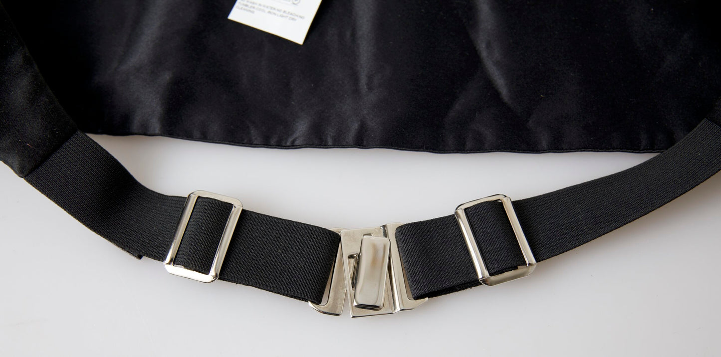 Indulge in the epitome of sophistication with our exclusive black cummerbund, a must-have accessory for the discerning gentleman’s formal attire. Carefully crafted from sumptuous 100% silk, this Dolce & Gabbana piece epitomizes luxury and elegance, elevating any ensemble with its timeless appeal and Italian finesse. Featuring an adjustable hook clip closure and a comfortable stretch band, it promises a flawless fit for any special occasion.