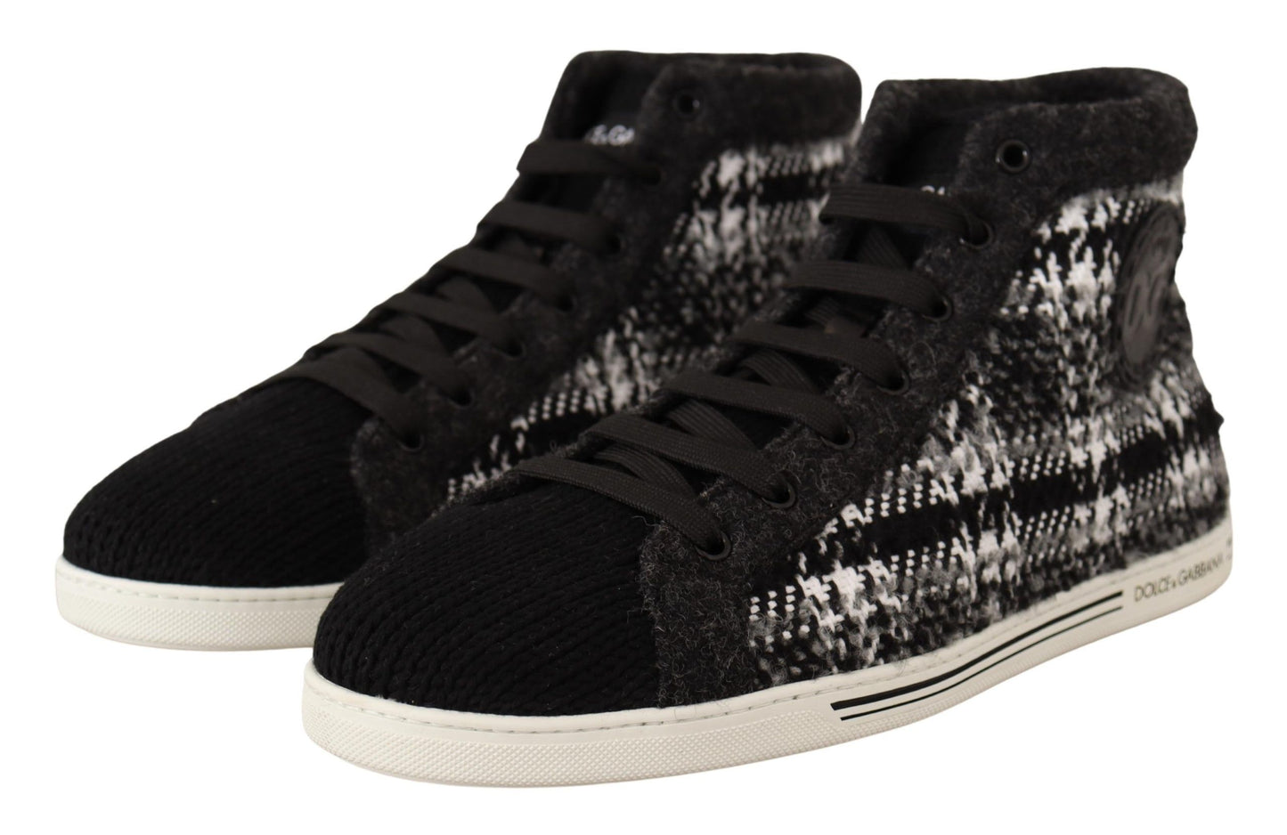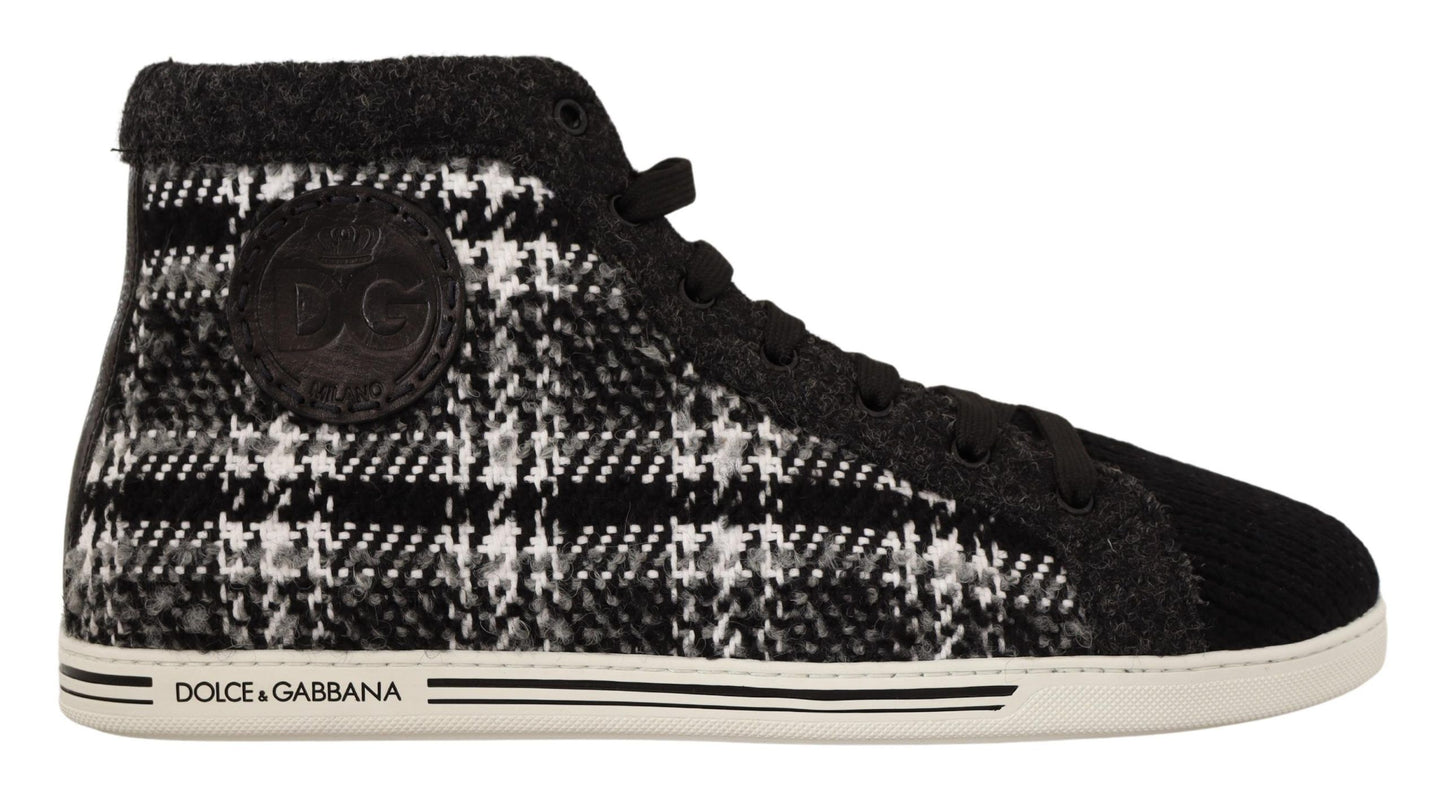 Step up your footwear game with the latest 100% Authentic sneakers from Dolce & Gabbana. These high-top sneakers, featuring a contemporary black and gray check design, blend classic style with modern sophistication. Made in Italy, they are crafted from the finest cotton and wool, ensuring both comfort and durability. The iconic logo detail adds a touch of luxury, while the sturdy rubber sole offers practicality for everyday wear.