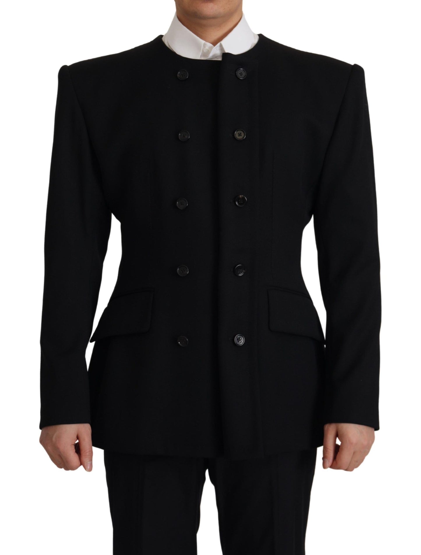 Exude timeless sophistication with this absolutely stunning slim-fit double-breasted blazer from Dolce & Gabbana. Crafted to perfection in Italy, this black blazer jacket is a true testament to classic style and modern tailoring. Featuring a sleek five-button closure, this piece will elevate your formal wardrobe to new heights. The luxurious blend of virgin wool and elastane guarantees sublime comfort with a hint of stretch for a flawless fit.