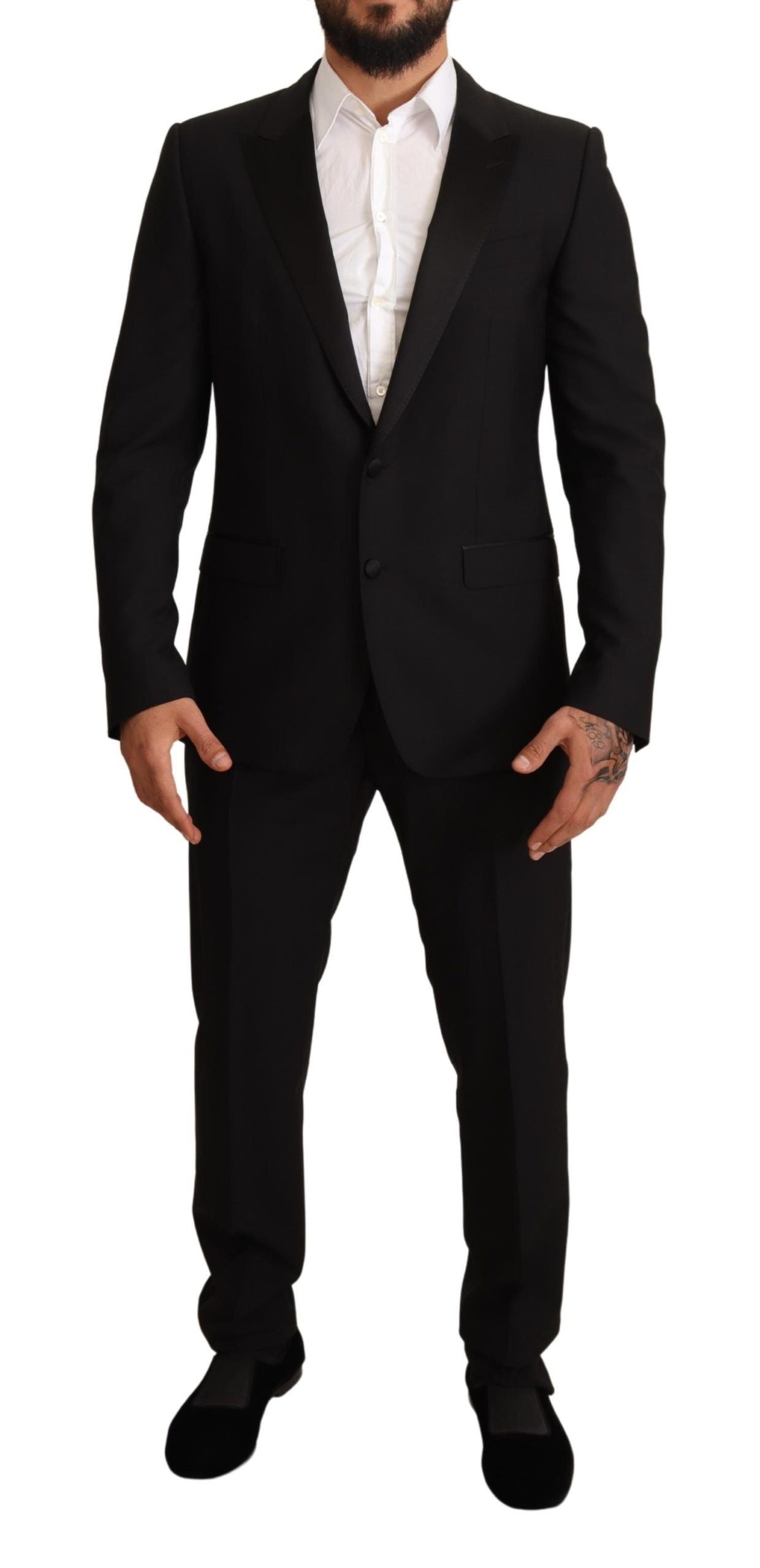 Indulge in the epitome of luxury with this stunning Martini 2-piece suit by Dolce & Gabbana. Impeccably tailored for a slim fit, this ensemble is perfect for those seeking sophistication and elegance. Crafted from a blend of virgin wool, silk, and polyester, the suit features a sleek black color that exudes timeless style. The jacket is designed with a notched lapel, a structured shoulder, and a two-button closure, complemented by functional button cuffs and multiple pockets for utility. Accompanied by trousers cut to a regular length, they feature convenient pockets and a modern zipper closure. The lining ensures comfort, while the single-breasted design and one open vent at the back showcase Italian craftsmanship at its finest.
