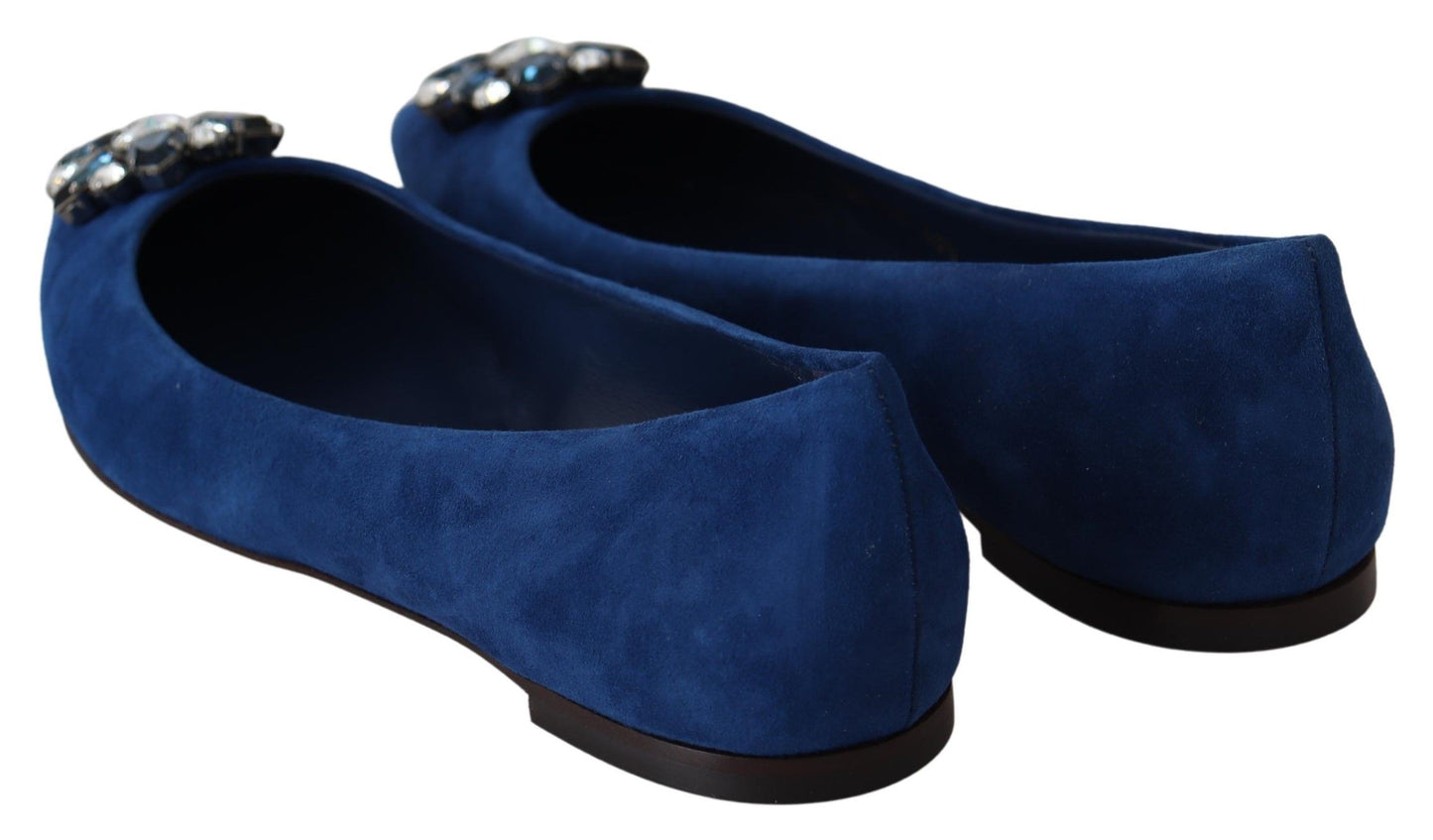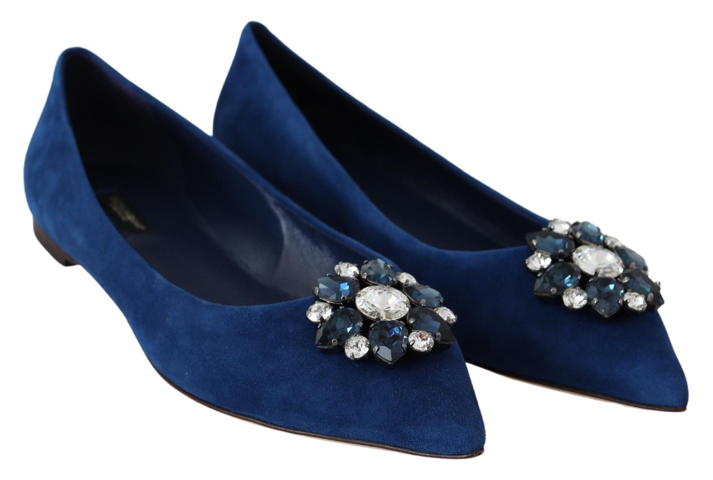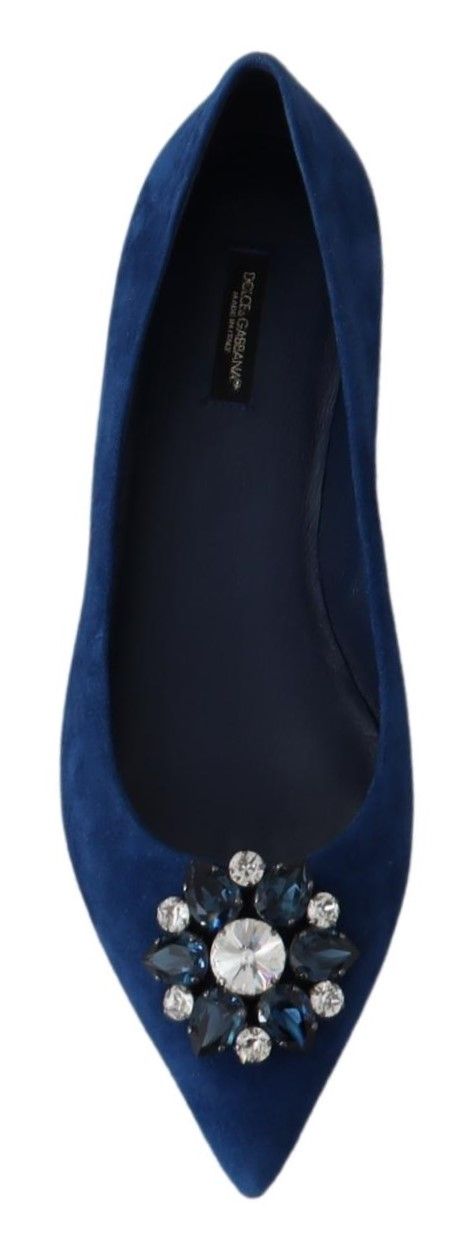 Step into luxury with these stunning Dolce & Gabbana flats. These shoes are a striking addition to your footwear collection, boasting a dazzling array of embellished crystals on sumptuous blue suede. With a sleek pointed toe and comfortable leather sole, these flats effortlessly combine fashion with function.