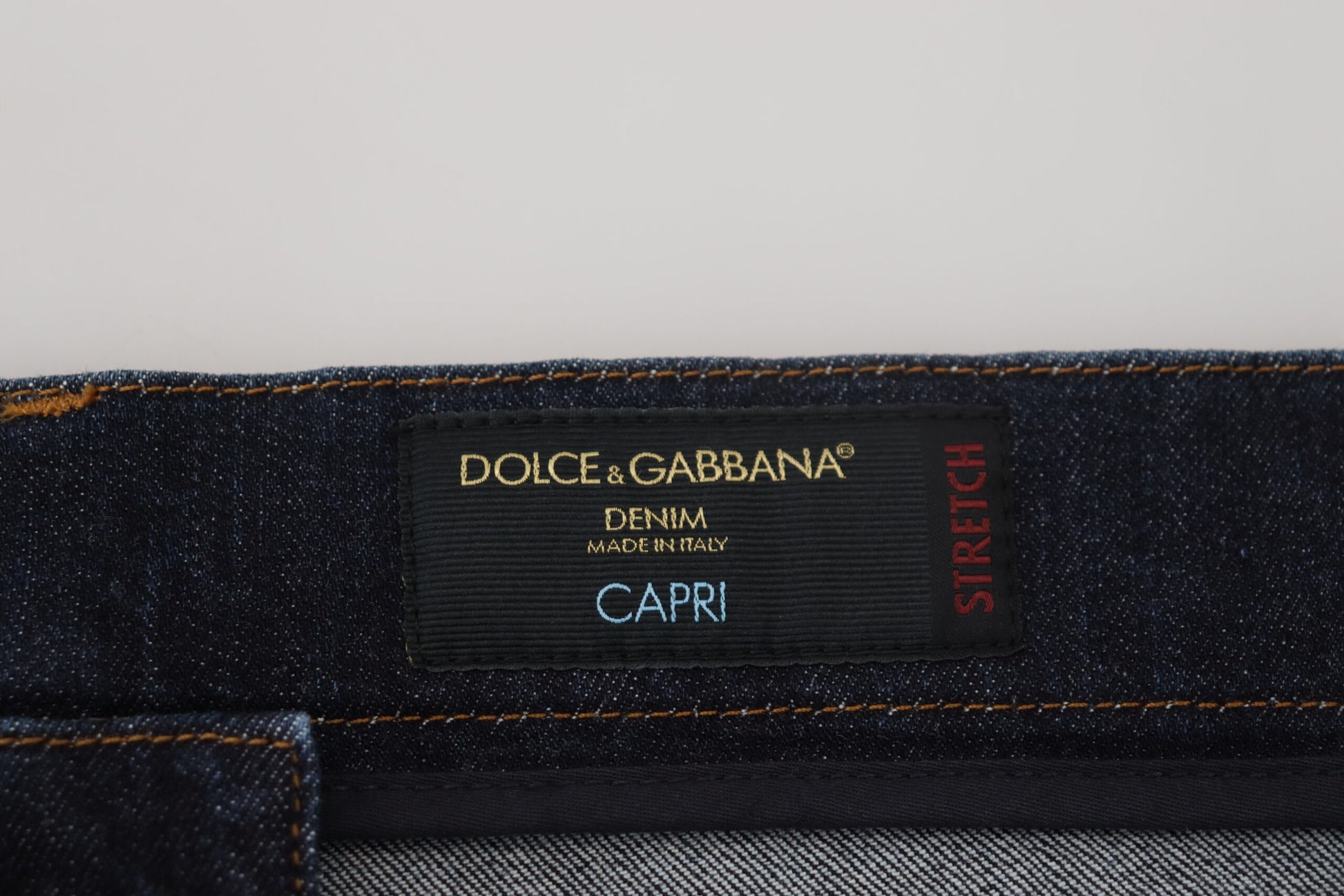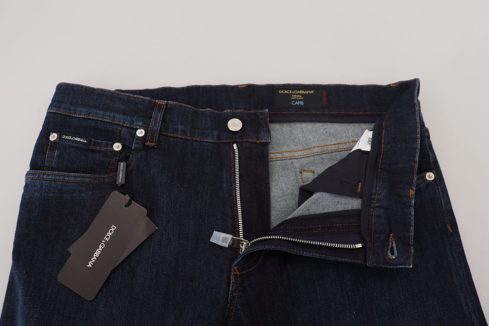 Step into luxury with these exquisite Capri denim jeans from Dolce & Gabbana. These premium jeans come brand new with tags, showcasing unparalleled craftsmanship and authentic Italian design. The combination of 98% cotton and 2% elastane ensures both comfort and a perfect fit, accented with a classic blue hue that elevates any ensemble. They feature a sleek zipper and button closure for ease of wear, complemented by subtle logo details that reflect the brand’s iconic status. Invest in these timeless jeans for a touch of elegance in your denim collection.