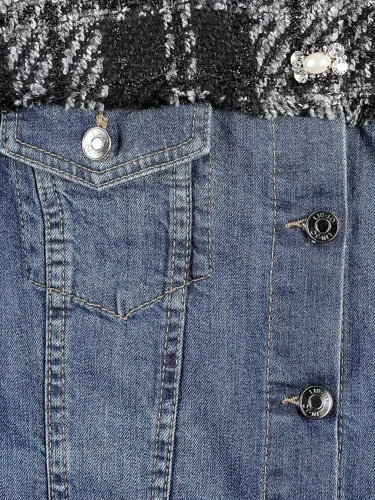 Elevate your wardrobe with this sophisticated denim jacket, boasting a unique upper part adorned with shimmering lurex accents and an elegant checked pattern. The standout feature of this piece is its dazzling jewelled buttons, adding a touch of glamour to any outfit.