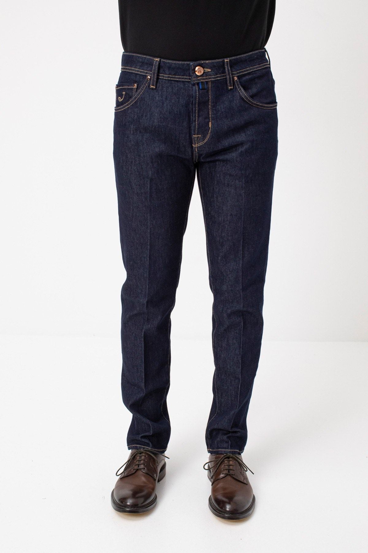 Experience the perfect blend of luxury and comfort with our carefully crafted denim jeans. In a serene blue hue, these jeans feature a classic five-pocket design, enhanced with a chic suede patch on the back for a touch of elegance. The front button closure ensures a secure and flattering fit, making them an ideal choice for regular wear. Proudly made in Italy, these jeans embody both sophistication and durability.
