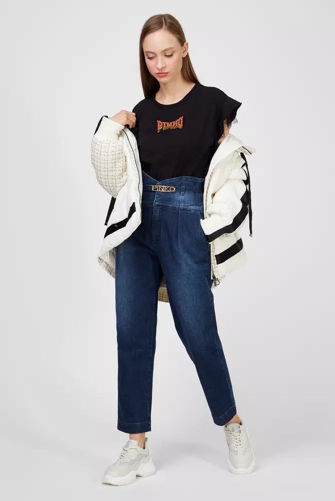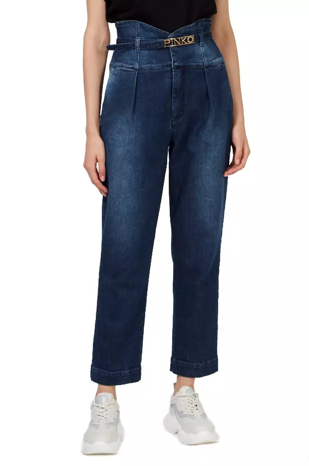 Step into style with these sophisticated high-waist jeans, featuring a unique bustier structure that effortlessly flatters the silhouette. The slim belt adorned with a signature logo buckle cinches the waist, while practical French front pockets and chic welt back pockets add functionality and flair. Crafted in Italy, these jeans blend classic denim comfort with a touch of elastane for that perfect fit.