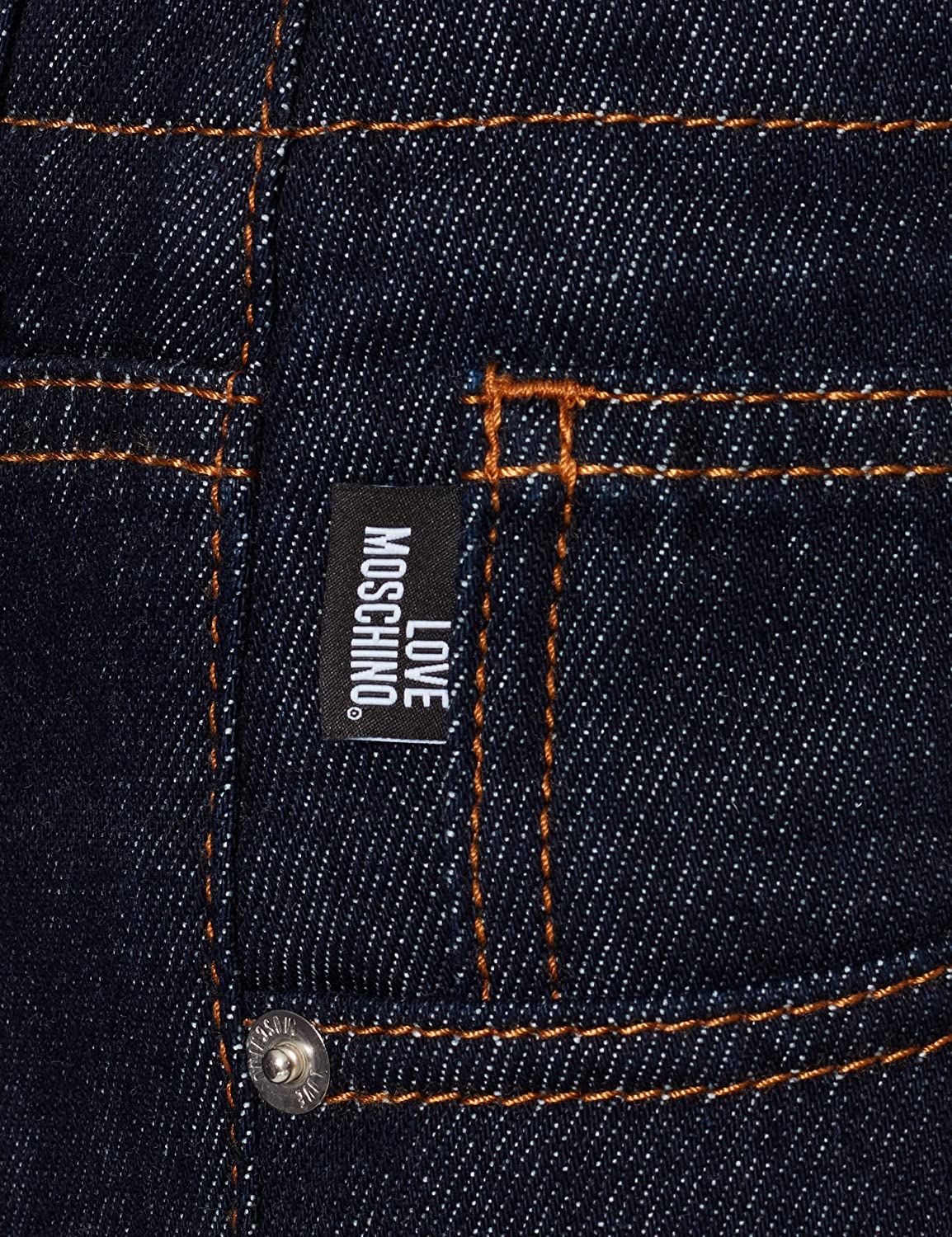 Step into comfort and style with these wide five-pocket jeans from Love Moschino. Crafted from premium 100% cotton denim and featuring a unique back in soft fleece cotton. These jeans boast a distinctive Love Moschino leather patch on the back for that touch of luxury. The rolled cuffs reveal a sleek black jacquard logo, adding a dash of elegance to your casual wear.