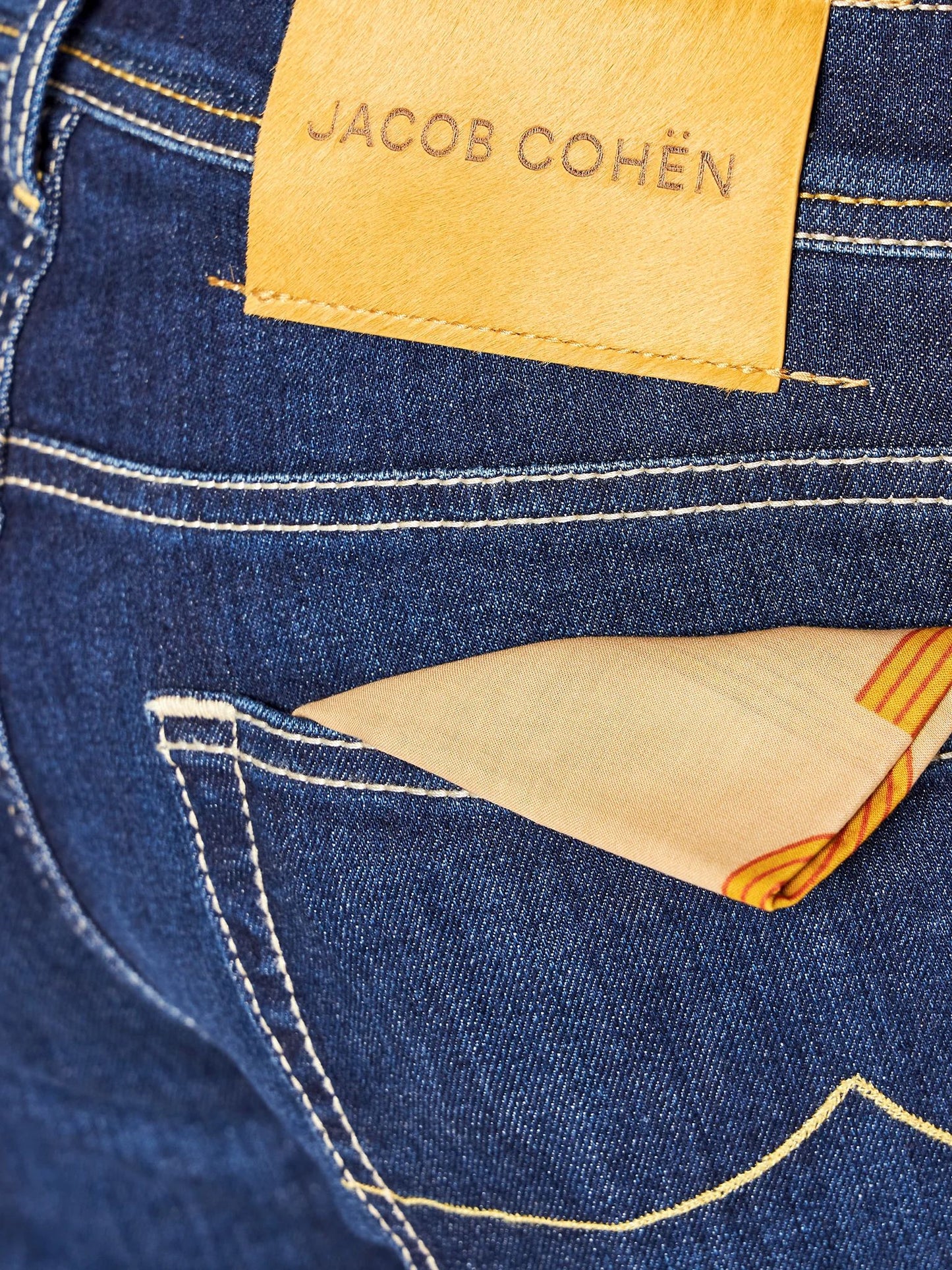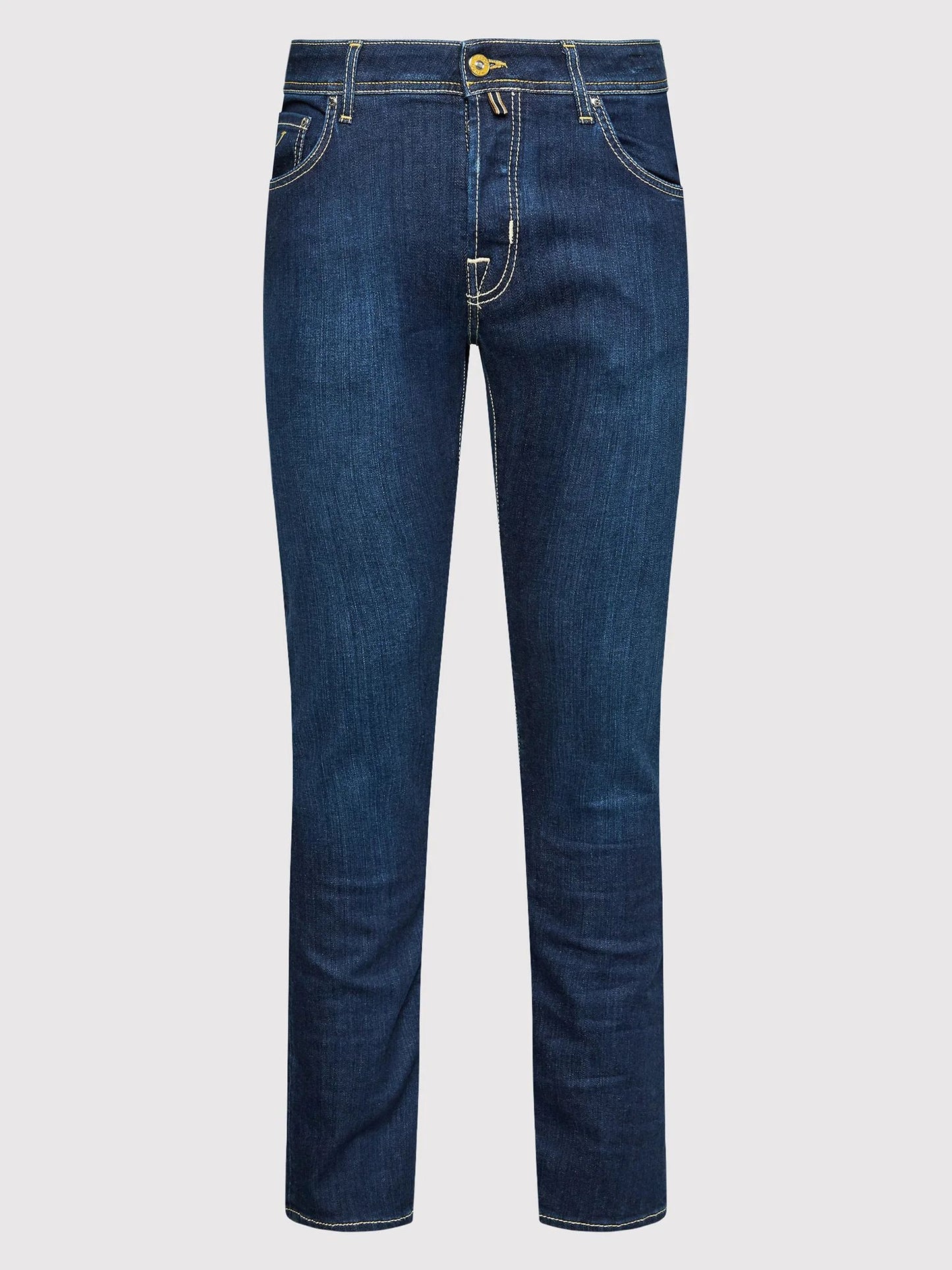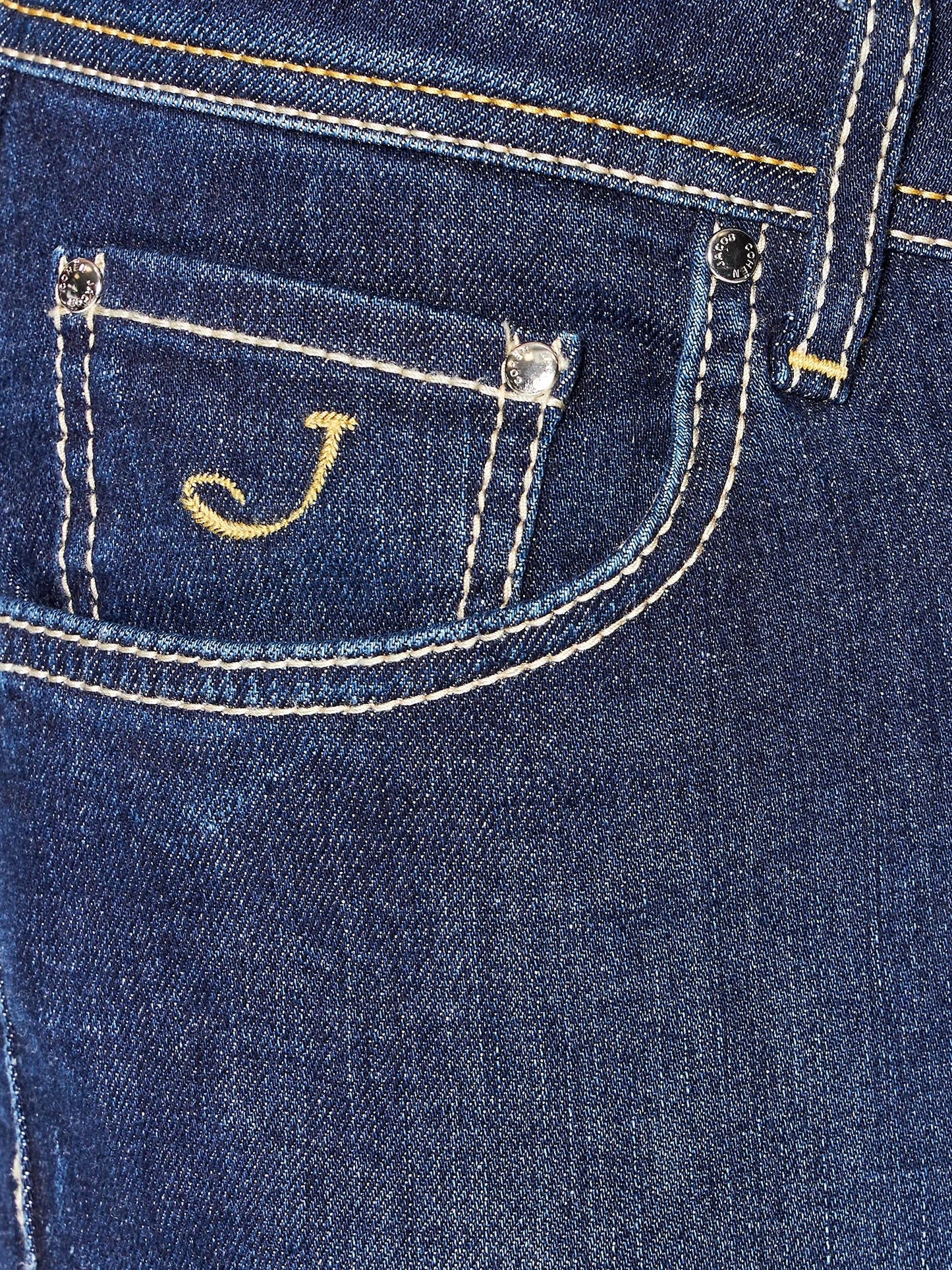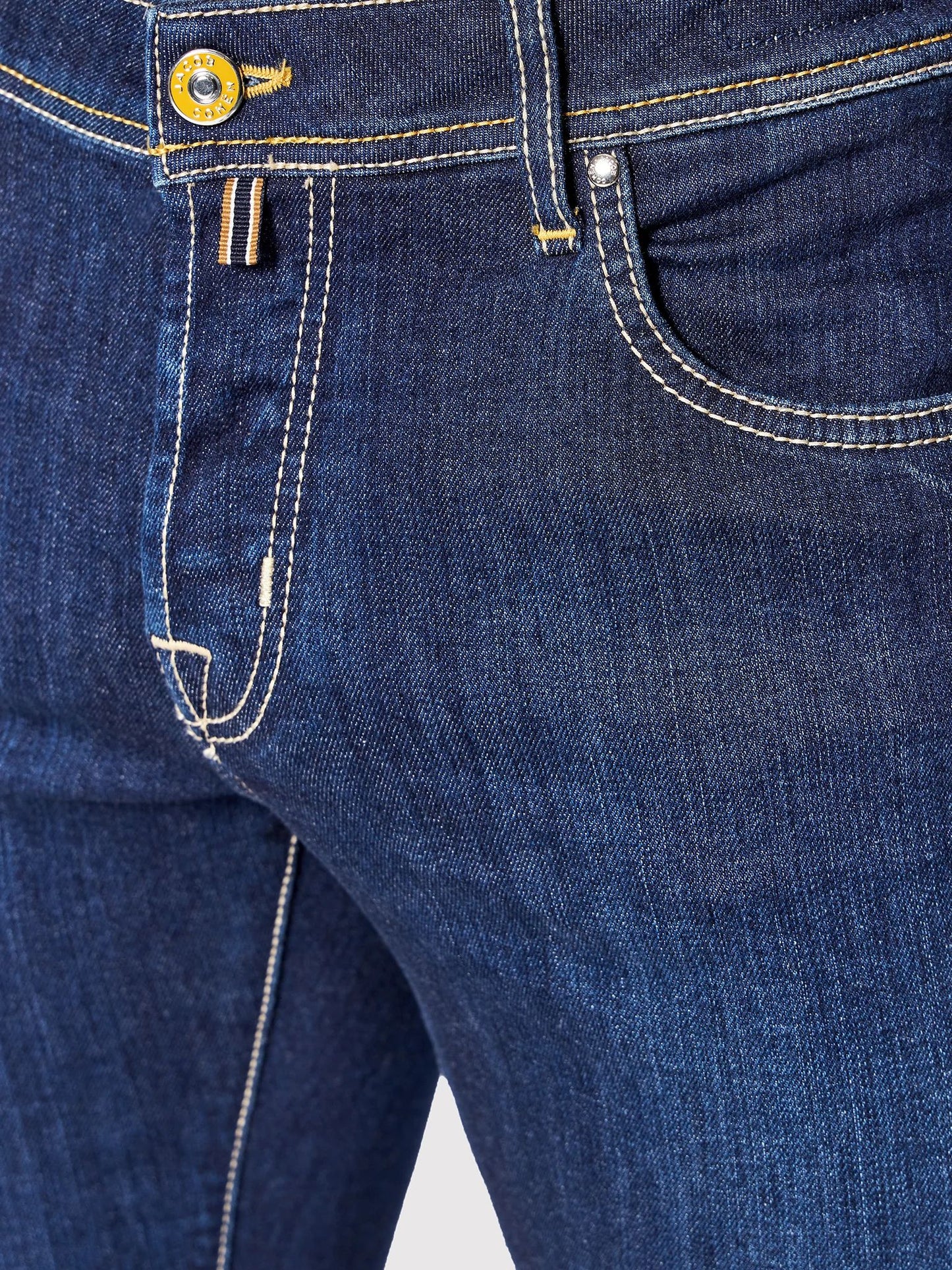Discover the embodiment of high-end comfort and impeccable style with our sophisticated dark blue jeans. Designed in a flattering slim-fit, these jeans feature unique yellow stitching details that complement the classic five-pocket silhouette. A distinctive yellow pony patch adds an exclusive touch of luxury, while a chic beige handkerchief peeks out from the back pocket, exuding an air of discreet elegance.