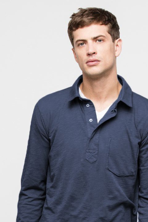 Embrace casual sophistication with this stylish blue jersey tee featuring a classic polo neck and long sleeves. Elegantly accented with a unique ripped pocket on the chest, this piece blends comfort with a touch of edginess, perfect for updating your off-duty look.