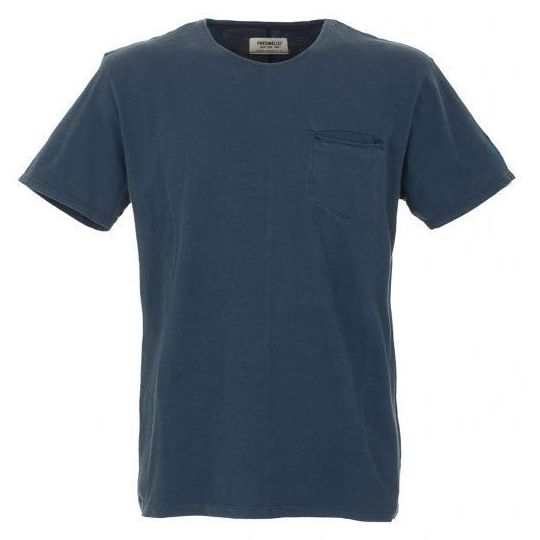 Embrace casual elegance with our vintage-inspired blue crew neck T-shirt, crafted from premium cotton for unparalleled comfort. The unique used effect jersey and a convenient chest pocket combine style with practicality, perfect for your everyday wardrobe essentials.