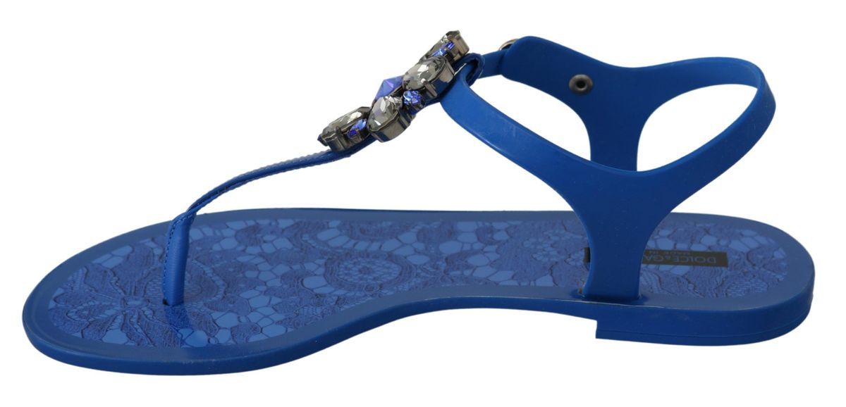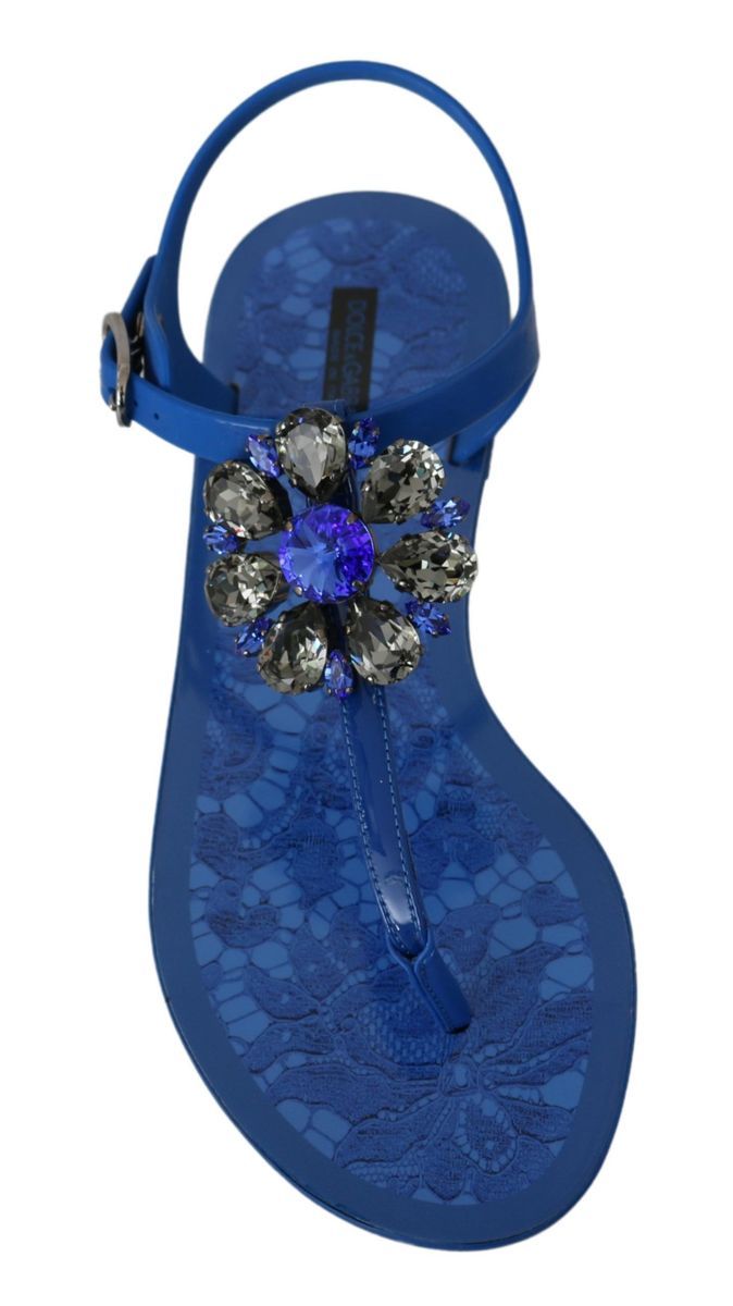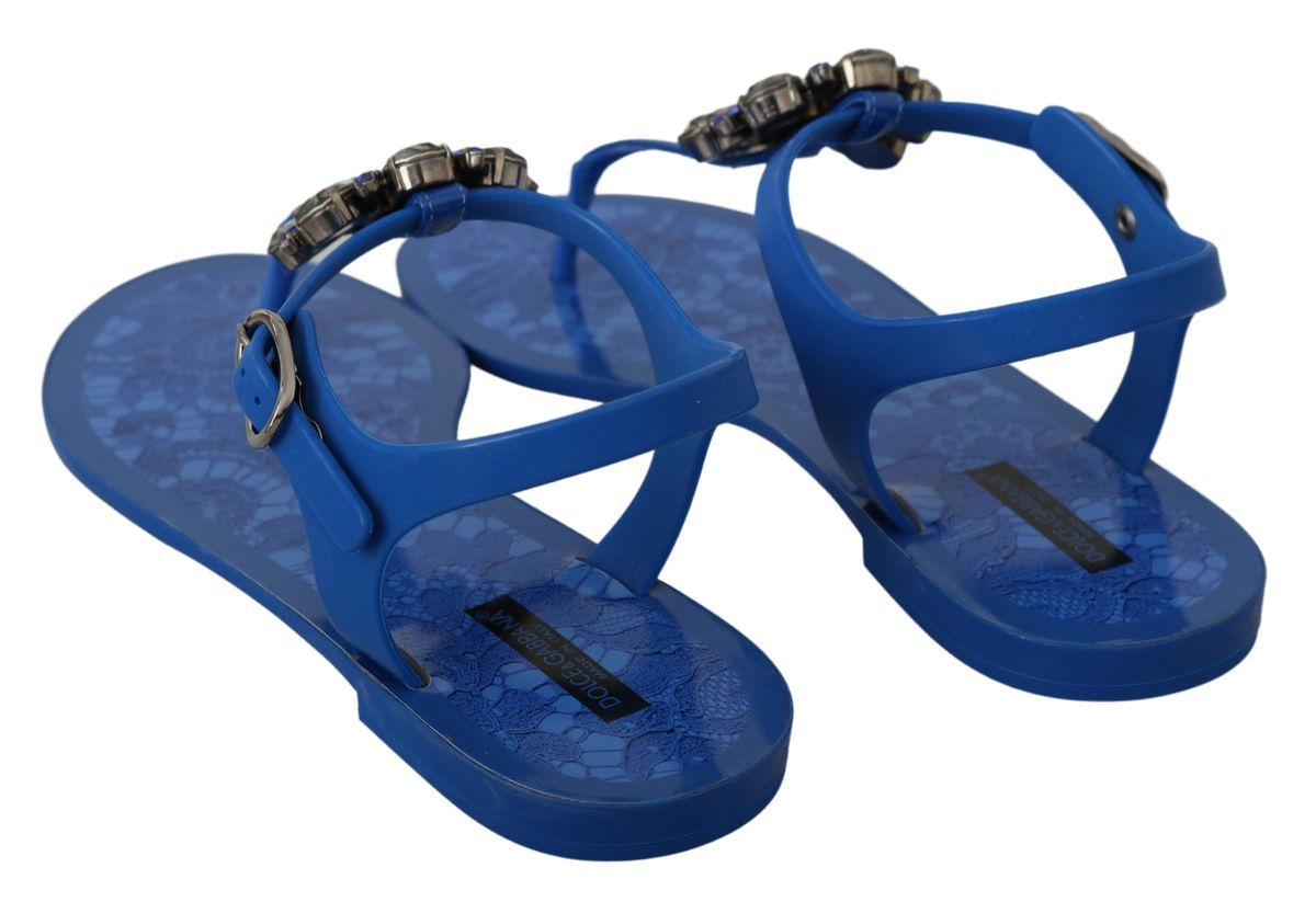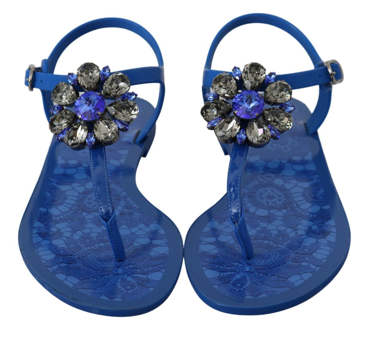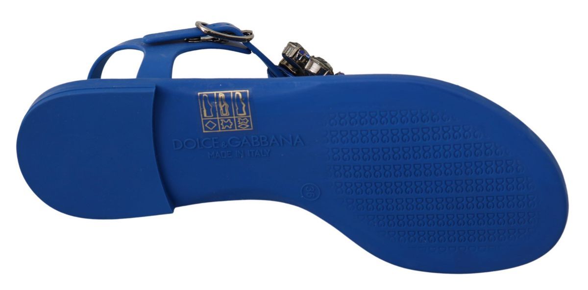 Step out in style with these exquisite Dolce & Gabbana beachwear sandals. Crafted with a blend of leather and rubber, they feature a vibrant blue color complemented by chic gray metal detailing. Adorned with blue and gray crystals, these flats are perfect for adding a touch of luxury to your summer wardrobe. The lace pattern innersole provides a unique touch, while the durable rubber sole ensures long-lasting wear. Perfect for beach outings or casual strolls, these made-in-Italy sandals offer both comfort and high-end fashion.