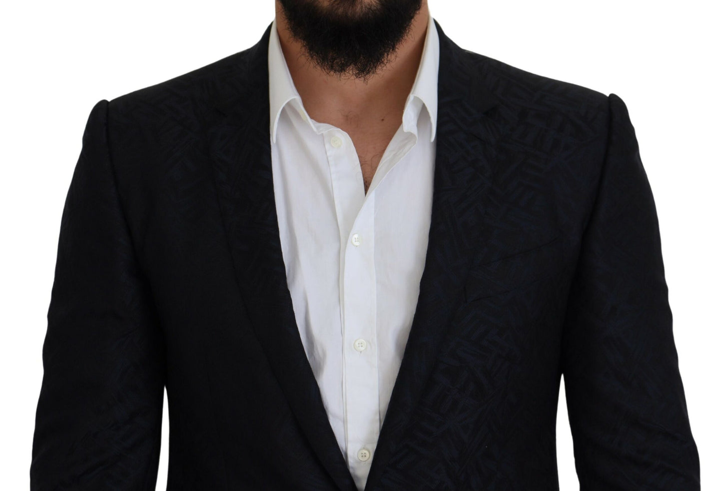 Step into sophisticated elegance with the Dolce & Gabbana Martini Suit. This dark blue, single-breasted two-piece suit exudes luxury and refined craftsmanship, perfect for the modern gentleman seeking a sharp slim-fit silhouette. Enhanced by a two-button blazer closure, it includes functional interior pockets and a back vent for ease of movement. The trousers feature a convenient 3-way zipper closure, ensuring a seamless fit. Crafted in Italy with a sumptuous blend of wool and silk, the suit offers both warmth and a silky-smooth finish, while the inner lining gives you an extra layer of comfort.