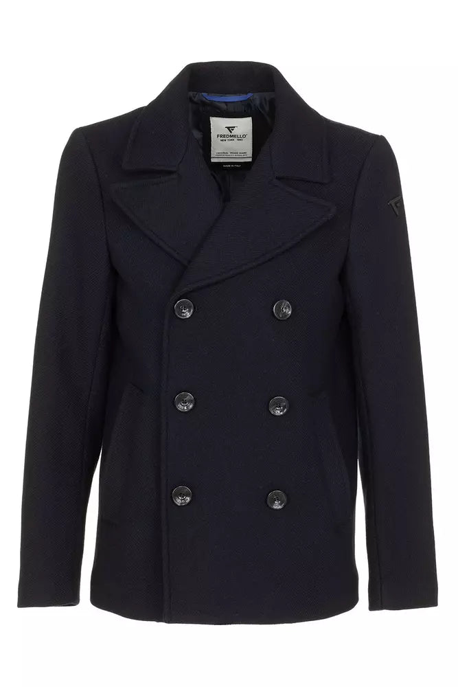 Step out in style with this refined Fred Mello men’s short coat, perfect for elevating your outerwear collection. This Italian-made coat features a sophisticated double-breasted three-button closure and a clean, structured design. Boasting an inside breast pocket for your essentials, and open side pockets for added convenience, this coat melds functionality with fashion effortlessly.