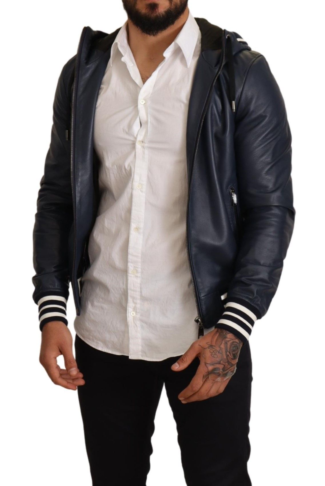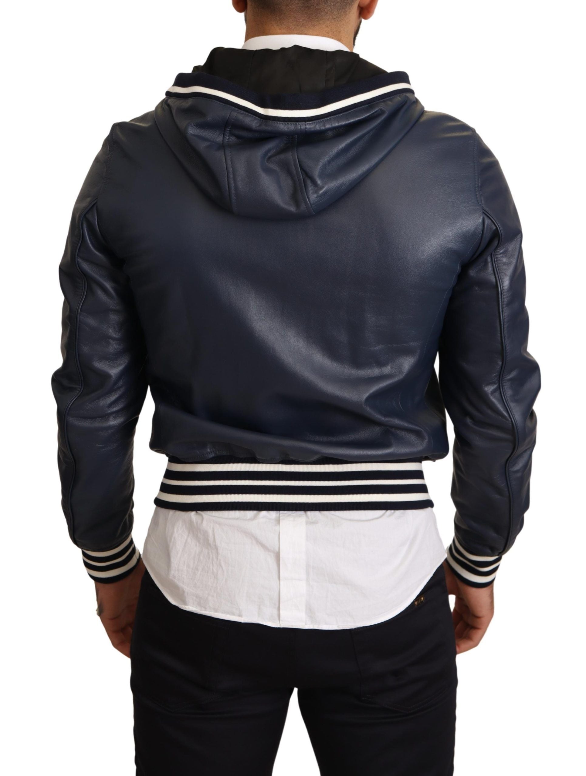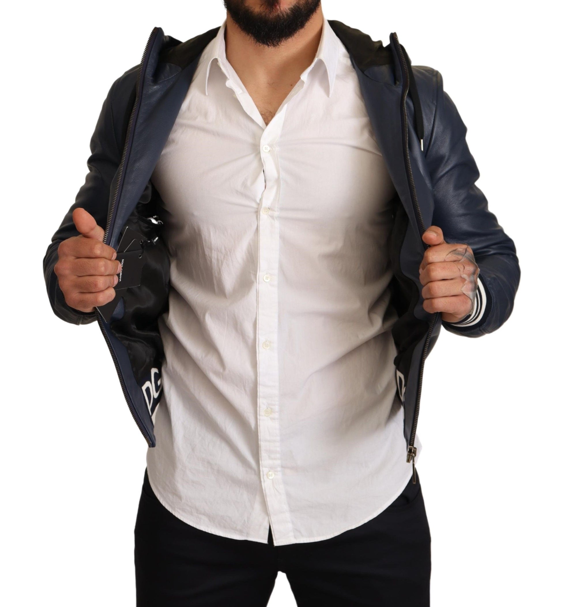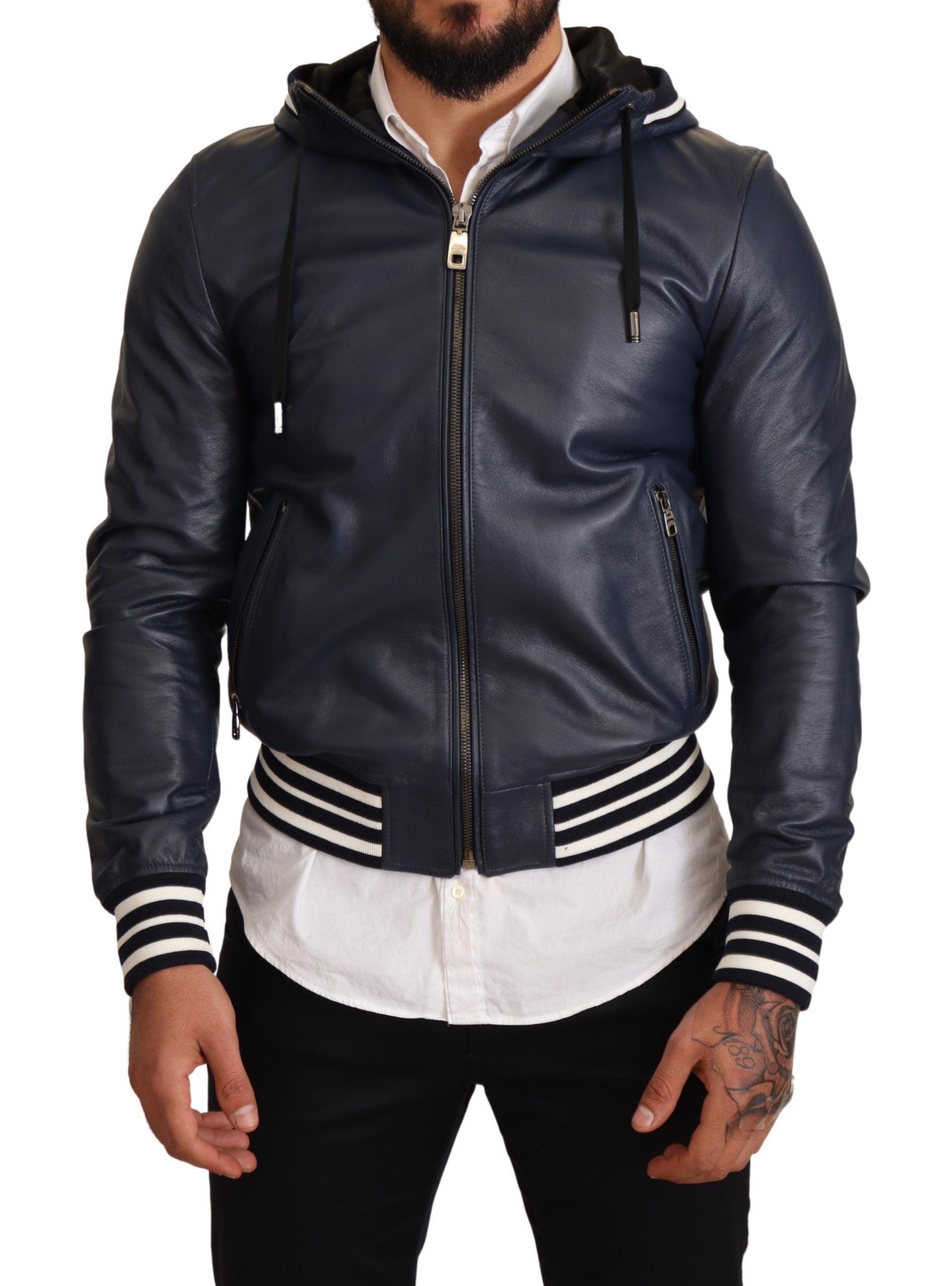 Indulge in the epitome of sophistication with this sumptuous Dolce & Gabbana leather bomber jacket. Designed for the fashion-forward individual, this jacket boasts a sleek blue hue complemented by a hood, long sleeves, and ribbed edges. The jacket is equipped with a full zip front closure and adjustable hood strap, providing both comfort and a custom fit. The elegant design is finished with distinctive logo details, ensuring you make a statement wherever you go.