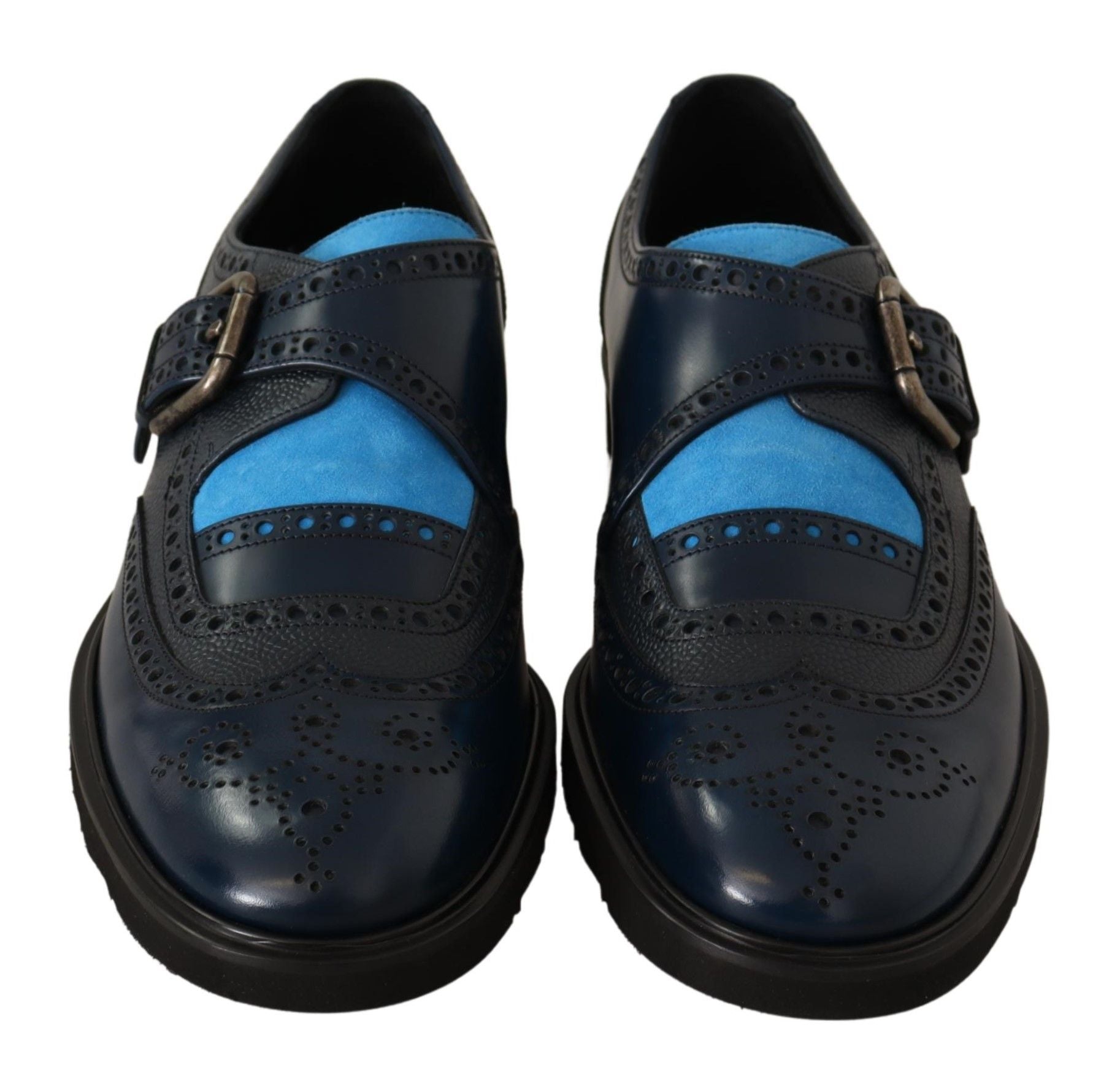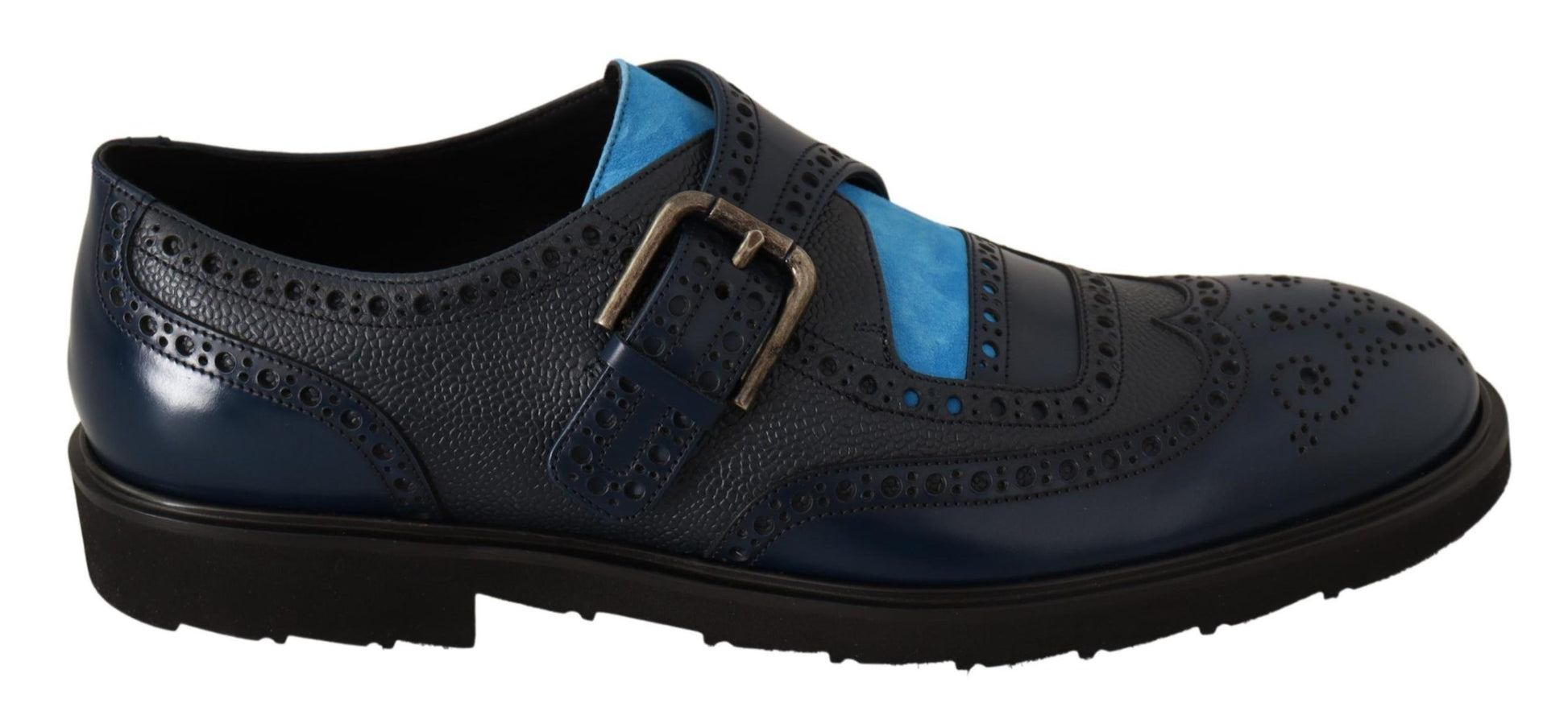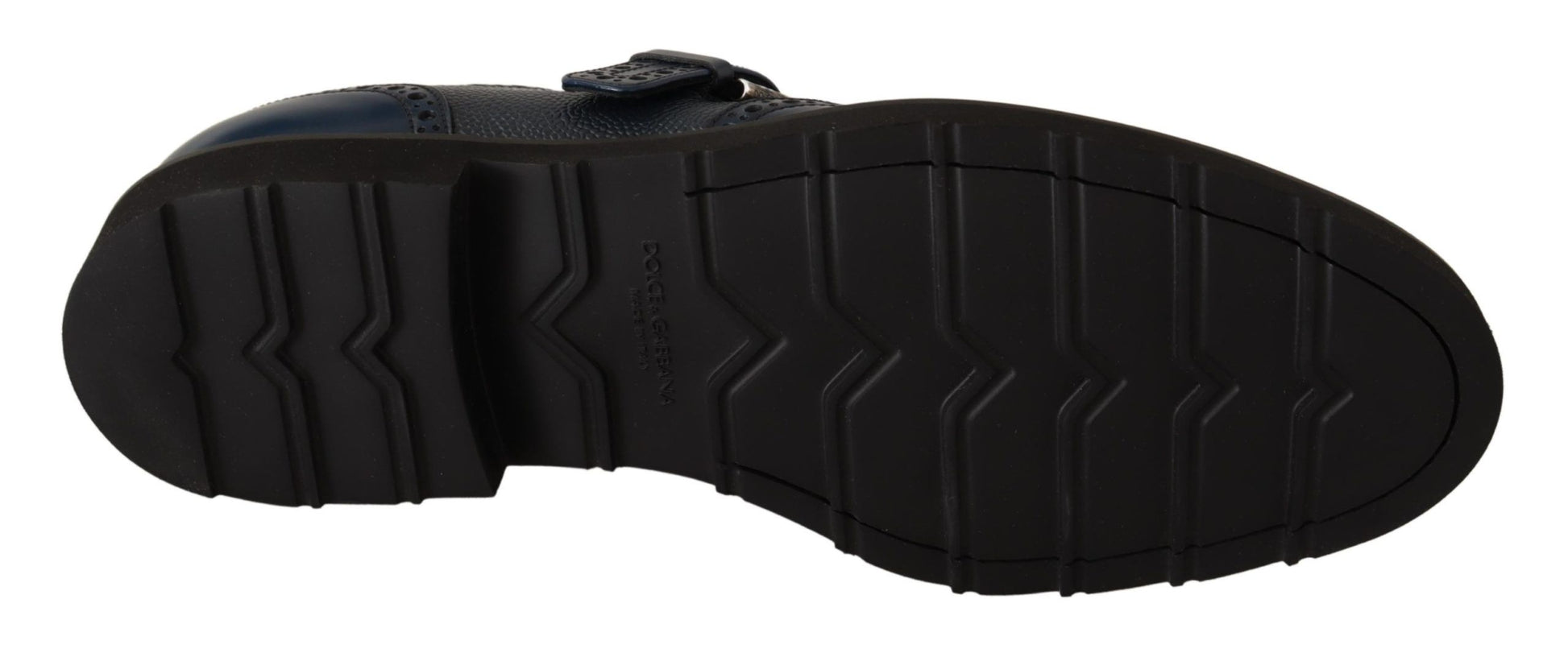 Step into luxury with these exquisite blue leather monk shoes for men. Impeccably crafted by the renowned Dolce & Gabbana, these shoes showcase a distinguished buckle detail that complements their refined style. The premium leather construction promises unmatched quality and comfort, while the durable rubber sole ensures you stride with confidence. Perfect for formal events or elevating your everyday attire, these shoes are crafted in Italy, evoking exclusivity and high craftsmanship.