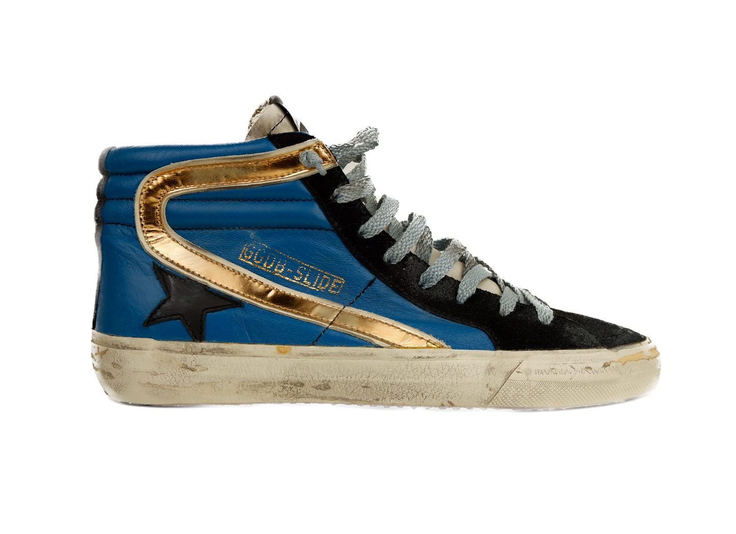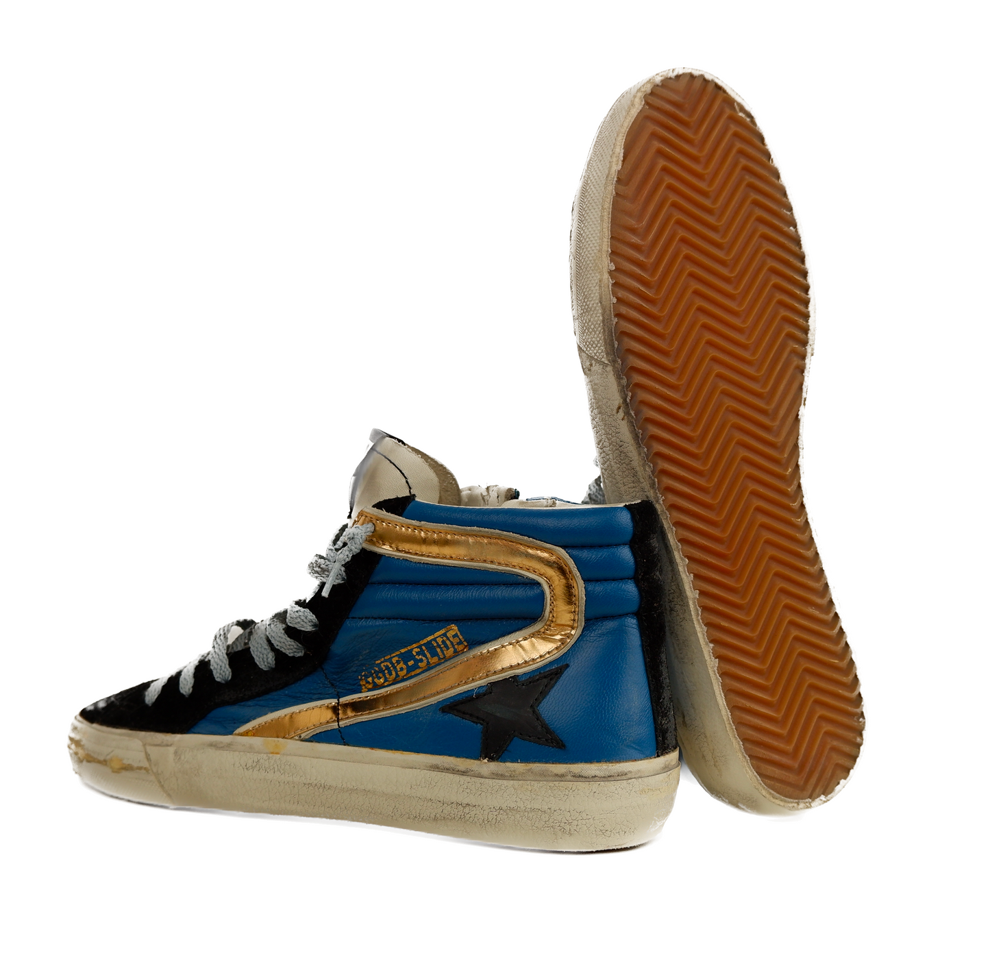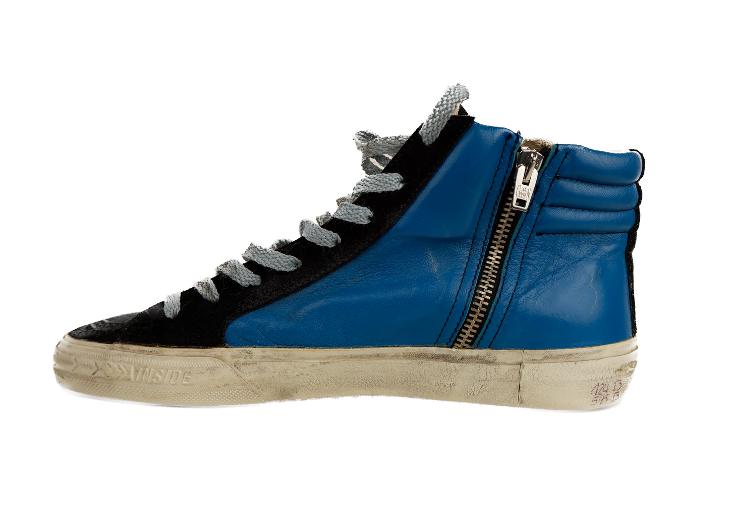 Discover the epitome of chic comfort with these iconic leather sneakers, masterfully crafted in the heart of Italy. Featuring a stylish black, blue, and white palette, this pair stands out with its unique zipper detailing on the side, harmoniously blending function and high-fashion. Perfect for any trendsetter seeking to elevate their sneaker game.