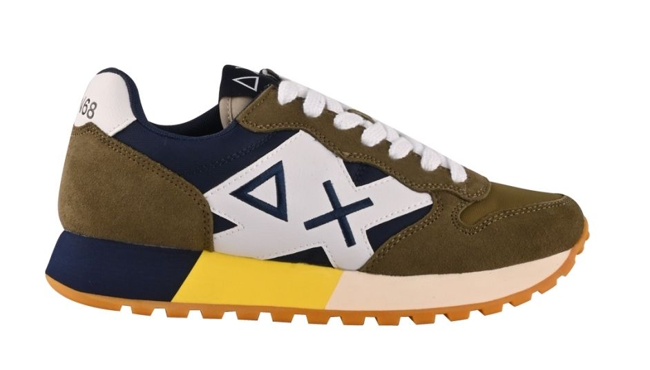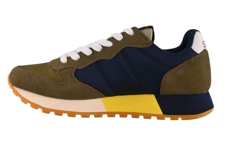 Step up your sneaker game with these eye-catching men’s sneakers, dressed in a stylish army green and blue palette, featuring sleek leather inserts. The design is accentuated by the distinct brand logo adorning the side, exuding casual elegance and contemporary charm. Perfect for adding a touch of sophistication to your off-duty looks.