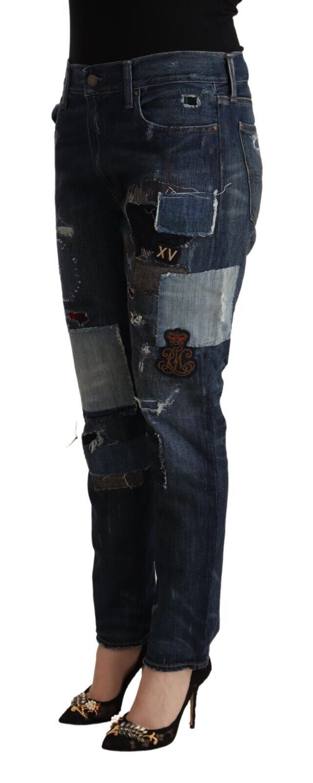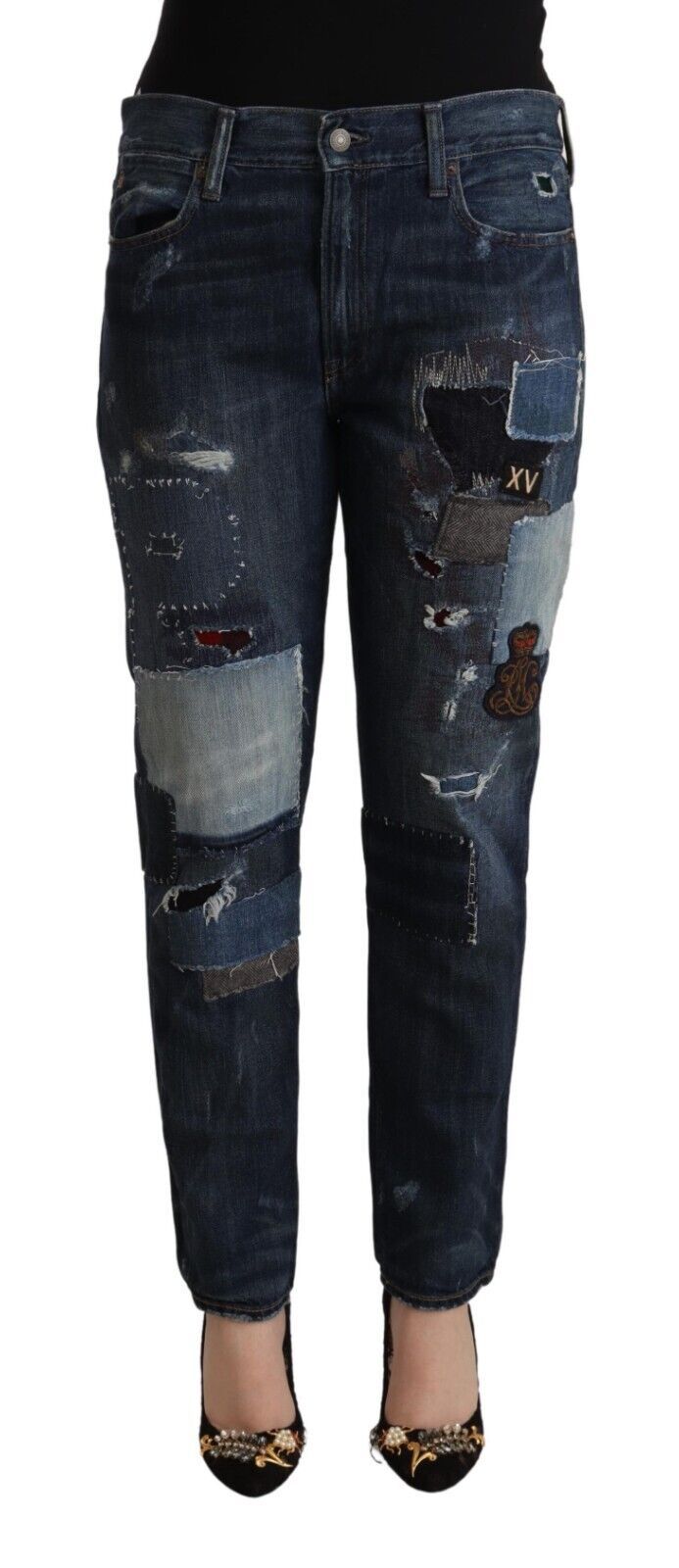 Indulge in the blend of classic style and modern flair with these Gorgeous Ralph Lauren jeans. Brand new with tags, these mid waist denims are meticulously crafted from 100% cotton, ensuring both comfort and durability. The unique patchwork design, combined with a tasteful blue washed color, exudes a trendy yet timeless charm. Complete with a zipper and button closure, these jeans also feature subtle logo details for an extra touch of luxury.