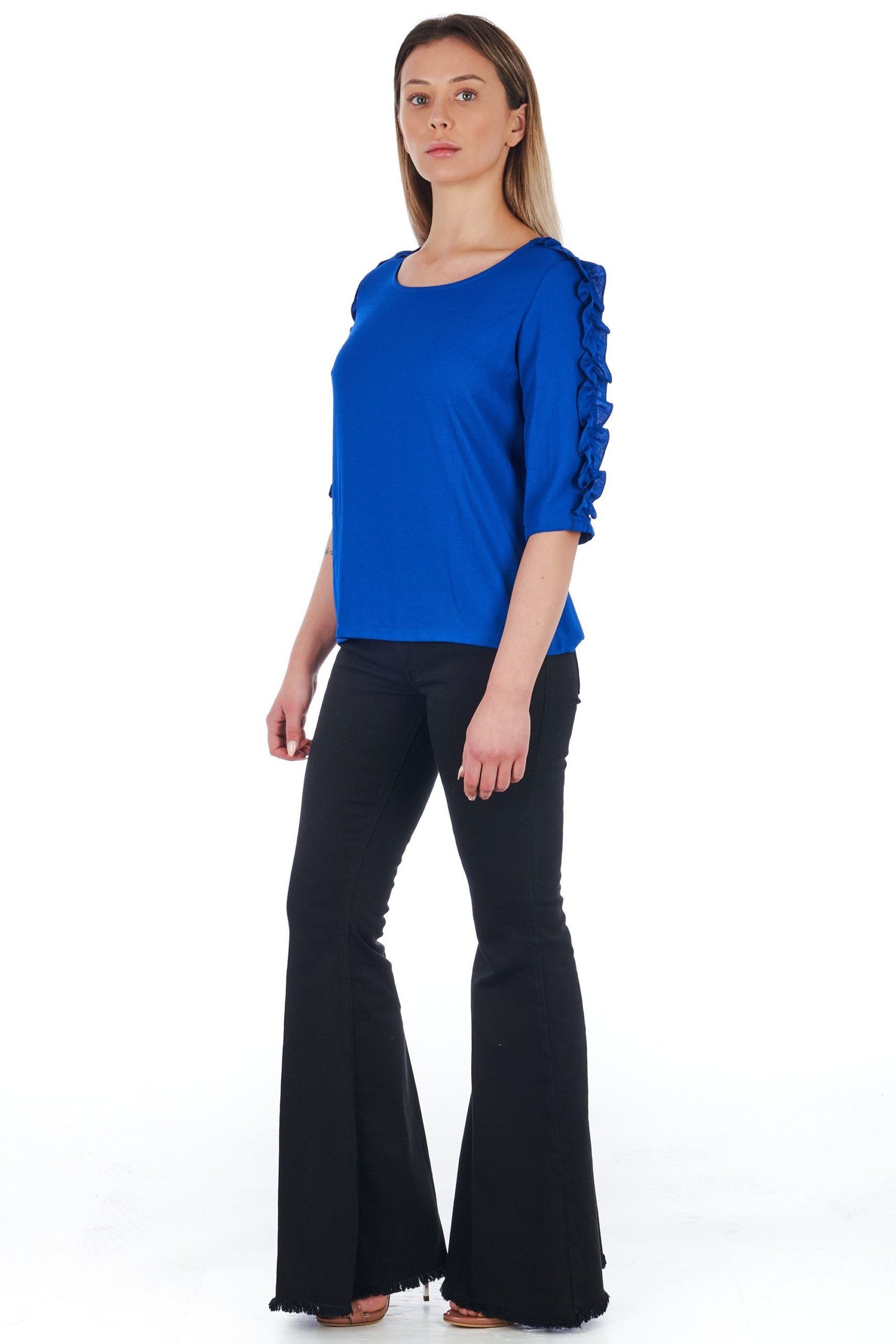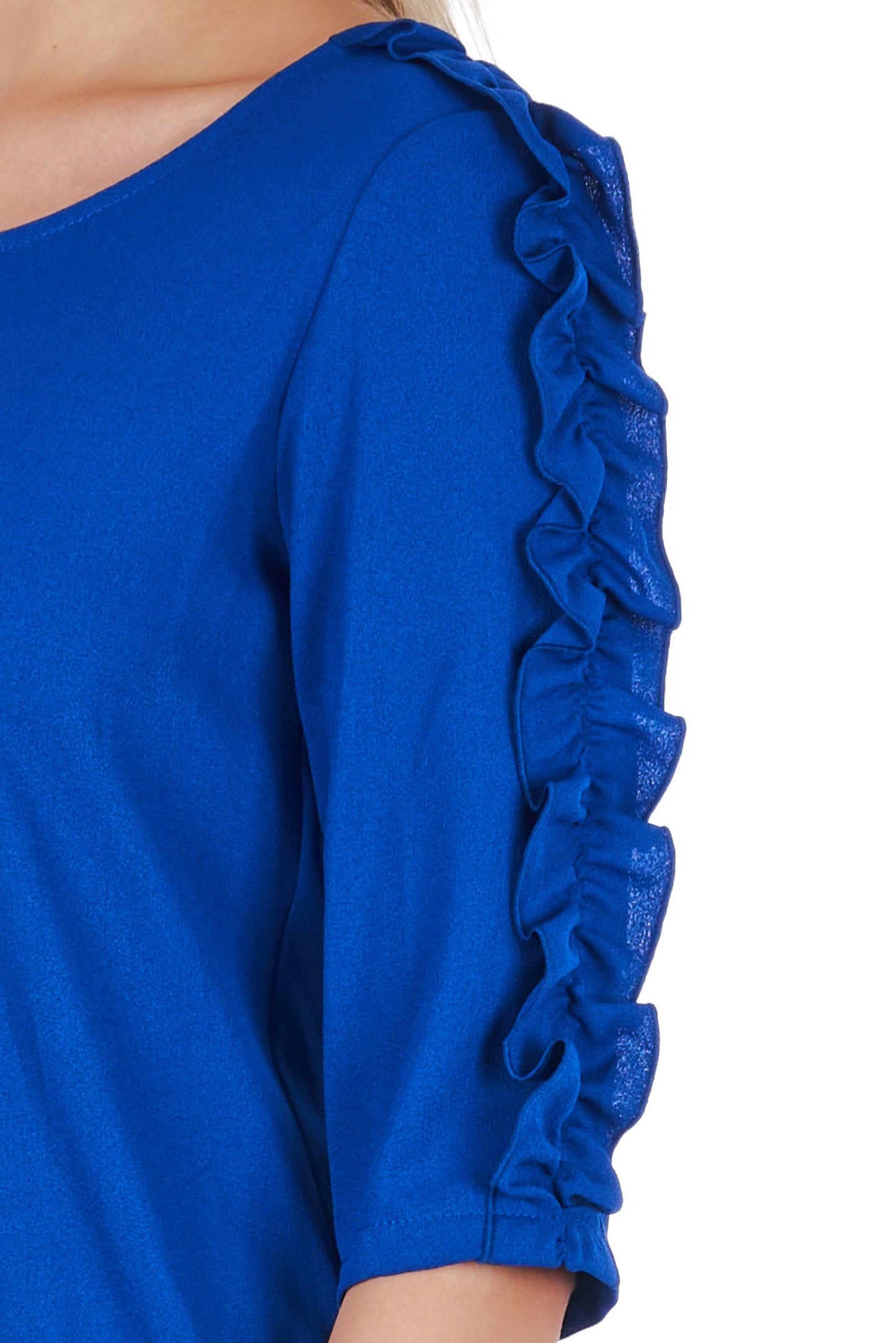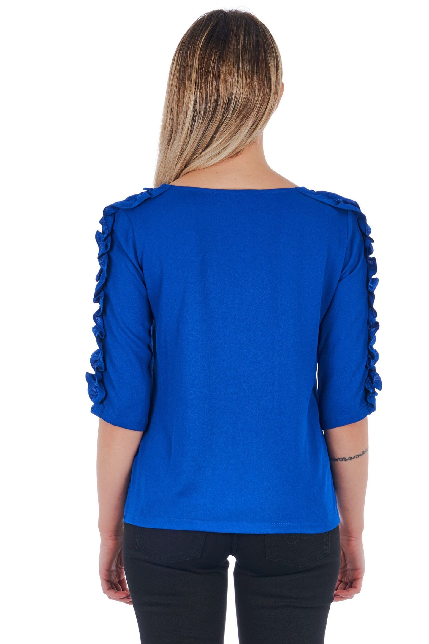 Exude sophistication with this Frankie Morello blouse, featuring delicate 3/4 sleeves and graceful rouges. Its vibrant blue color makes it a standout piece for any wardrobe, ensuring a look that’s as stylish as it is comfortable. Perfect for various occasions, from a day at the office to an evening out with friends.