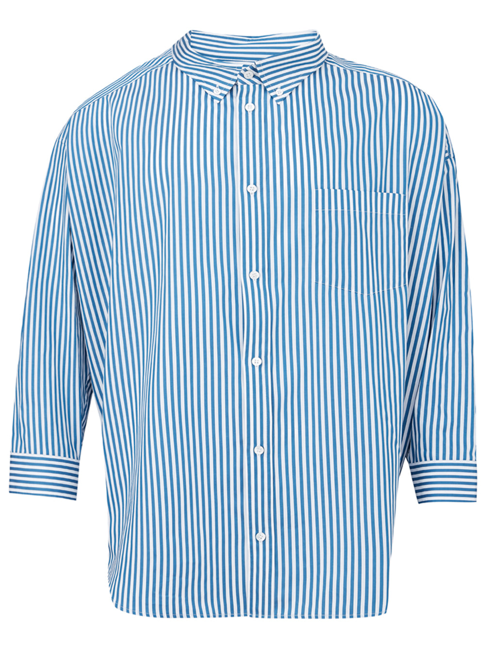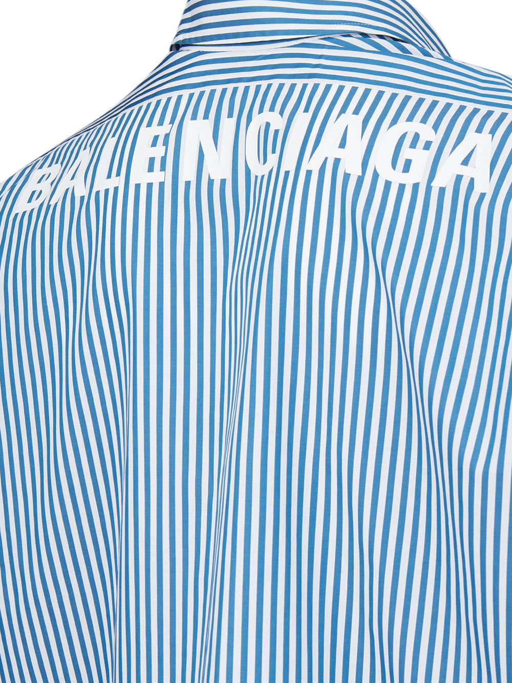 Step out in style with this luxurious Balenciaga Blue Striped Over Fit Shirt. A true fashion statement, perfect for those who appreciate high-quality craftsmanship and standout design. The shirt features a relaxed collar and front white button closure, complemented by an eye-catching, maxi printed Balenciaga logo on the back, and three-quarter sleeves. Crafted from 100% Cotton, this shirt ensures comfort and durability alongside its stylish appearance. Designed and made in Italy, it offers a regular fit that is both contemporary and flattering.