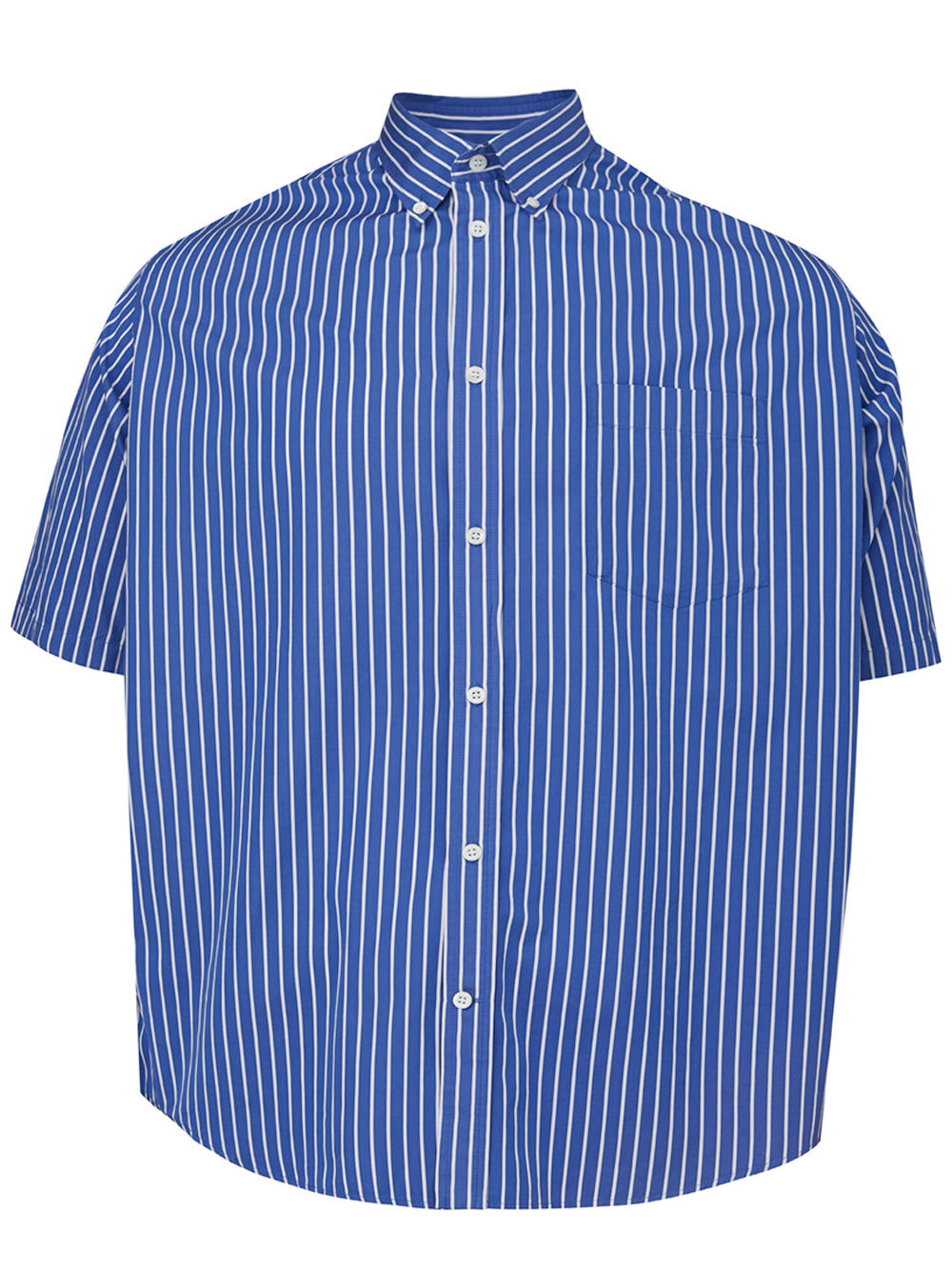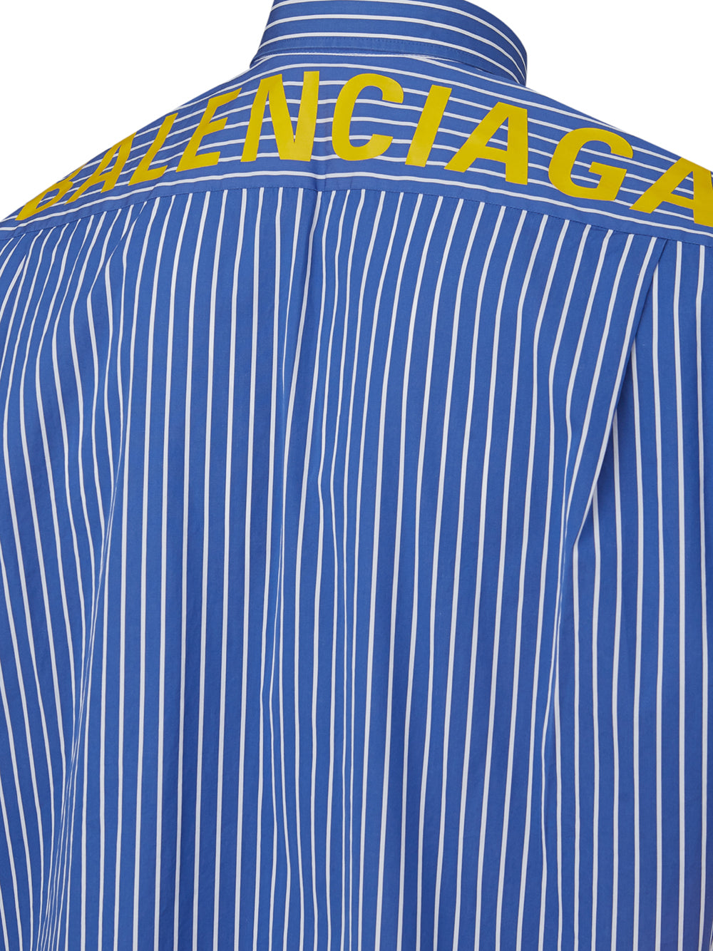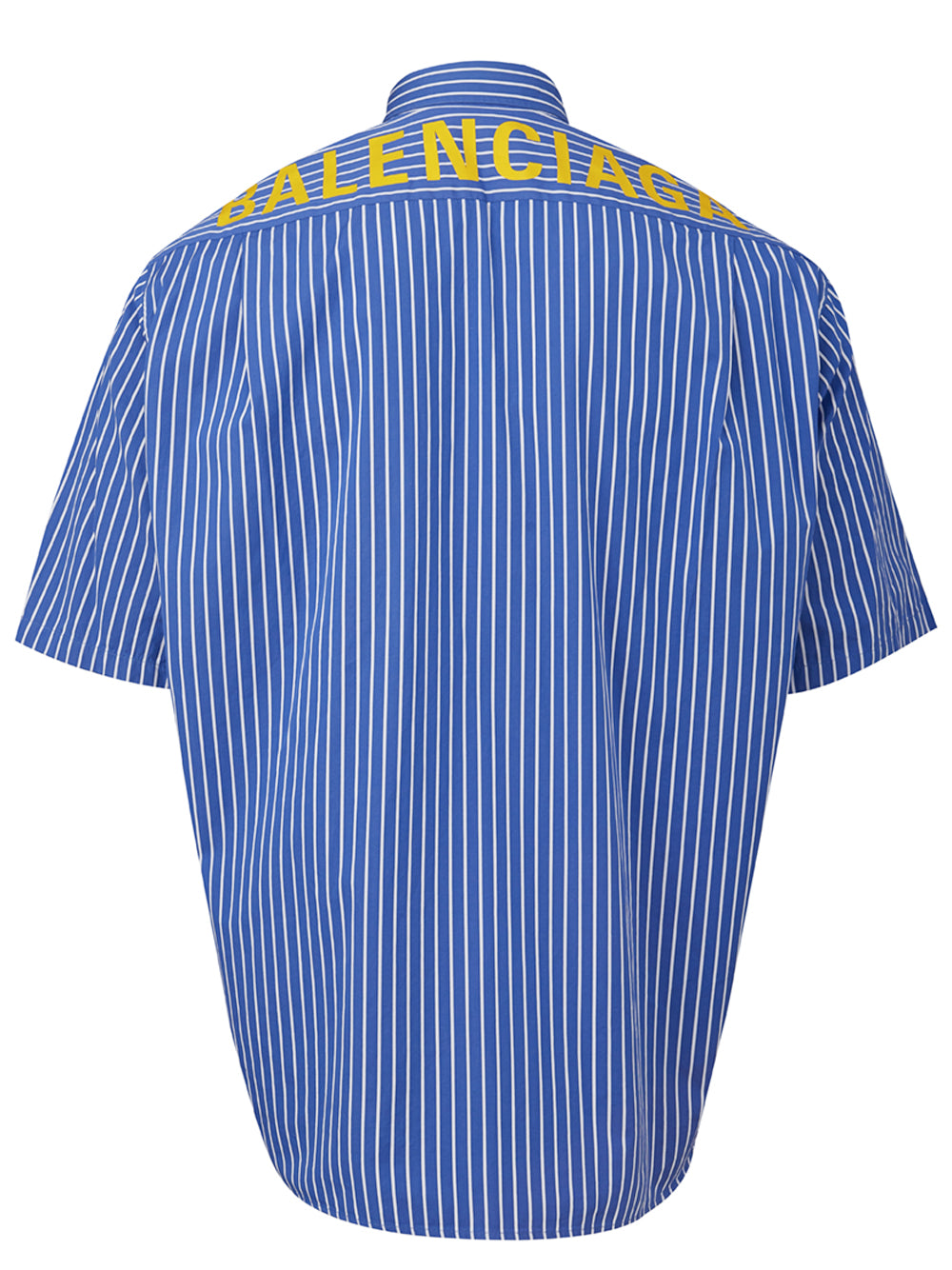 Gorgeous brand new with tags, 100% Authentic Balenciaga. This blue striped shirt features a crisp front button closure, a neatly attached pocket on the front side, and short sleeves for a regular fit. The design is elegantly rounded off with a printed yellow logo on the back, showcasing the brand’s iconic touch. Crafted in Italy with meticulous attention to detail, it’s a perfect blend of style and comfort.
