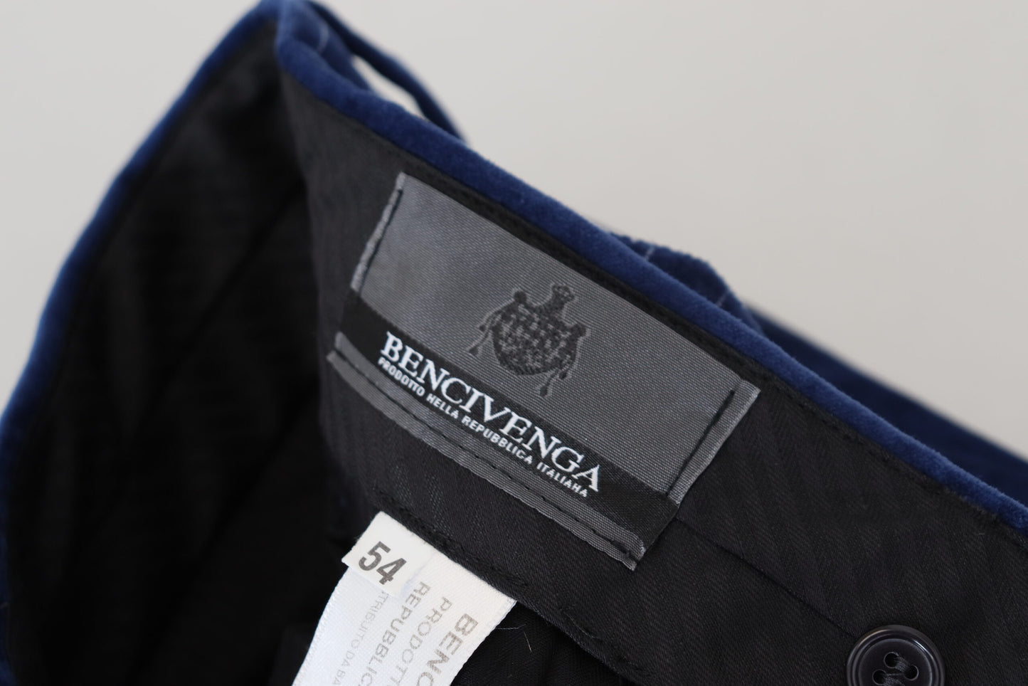 Indulge in the epitome of Italian craftsmanship with our impeccably-tailored, BENCIVENGA Couture men’s blue striped dress pants. These trousers are a testament to classic style combined with modern comfort, thanks to their luxurious cotton blend fabric that offers a touch of elastane for ease of movement. Perfect for elevating your formal attire, these pants feature exquisite details and the prestigious BENCIVENGA logo.