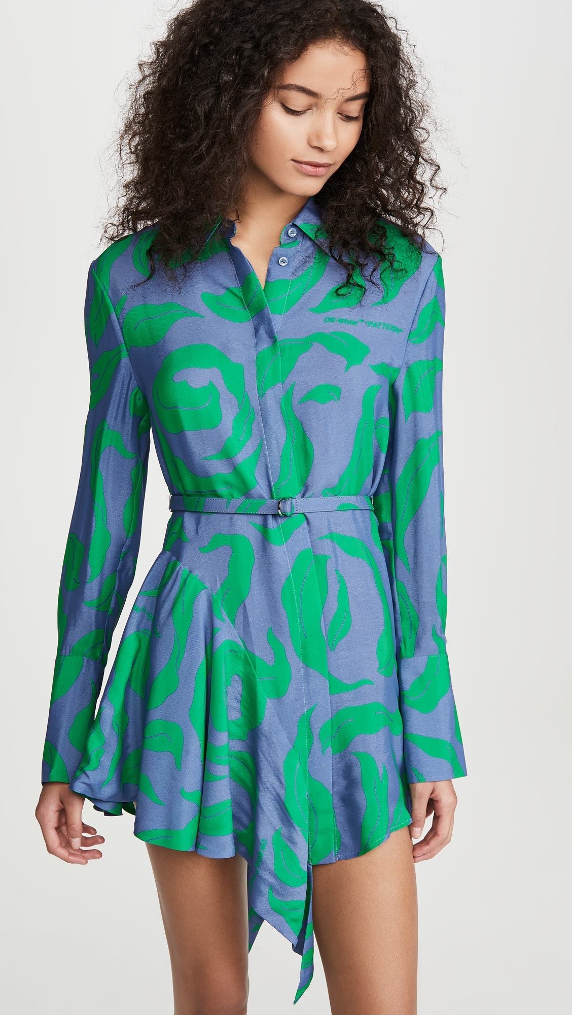 An enchanting leaf print dress that encapsulates femininity with its relaxed silhouette and graceful asymmetrical hem. The included belt cinches at the waist to showcase your figure, all while the button closure adds a touch of classic charm. Crafted from a blend of fine viscose and silk, this piece is a testament to Italian craftsmanship.