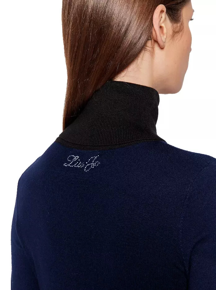 Embrace elegance with this captivating midi turtleneck dress that makes a statement with its sophisticated two-tone design. Featuring cosy long sleeves and a subtle glitter logo accent on the back, this dress showcases a seamless blend of comfort and style. Ideal for both daytime allure and evening sophistication.