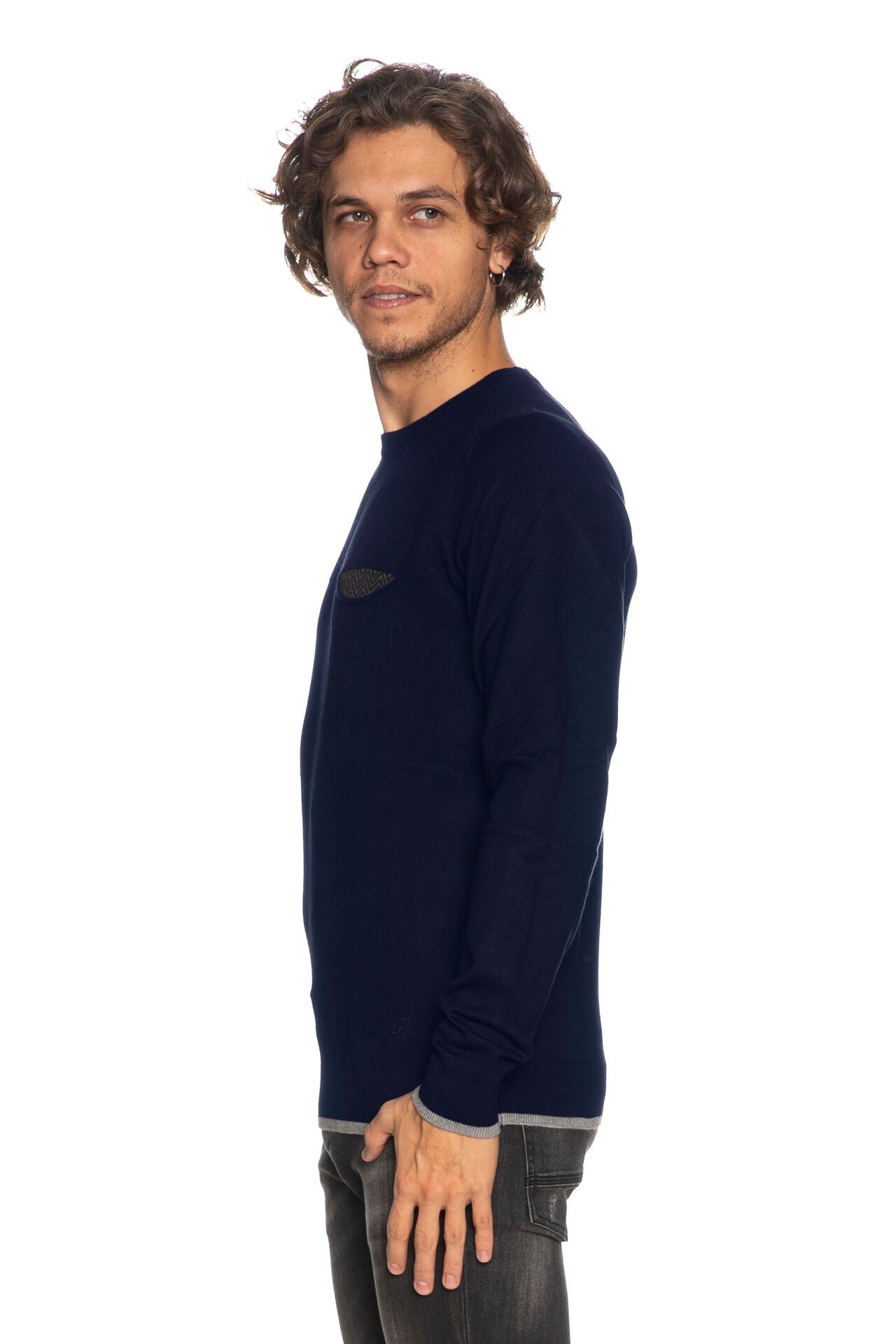 Infuse sophistication into your wardrobe with this exquisite crewneck sweater, perfect for men who enjoy a touch of elegance in their everyday wear. The sumptuous blend of materials offers a luxurious feel, while the unique welt pocket on the chest unveils a two-tone jacquard zig zag interior, adding a discrete yet captivating contrast that sets this sweater apart.