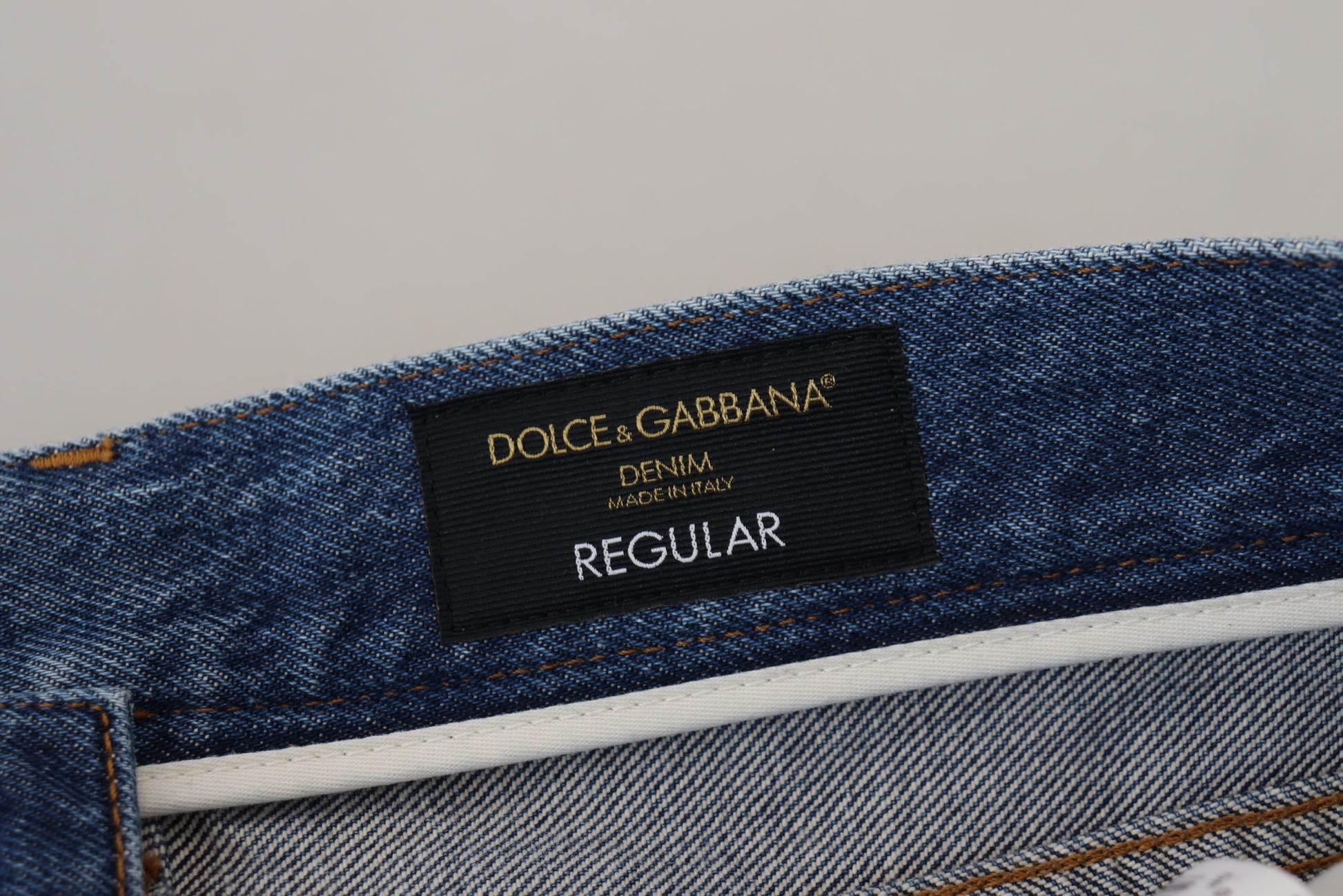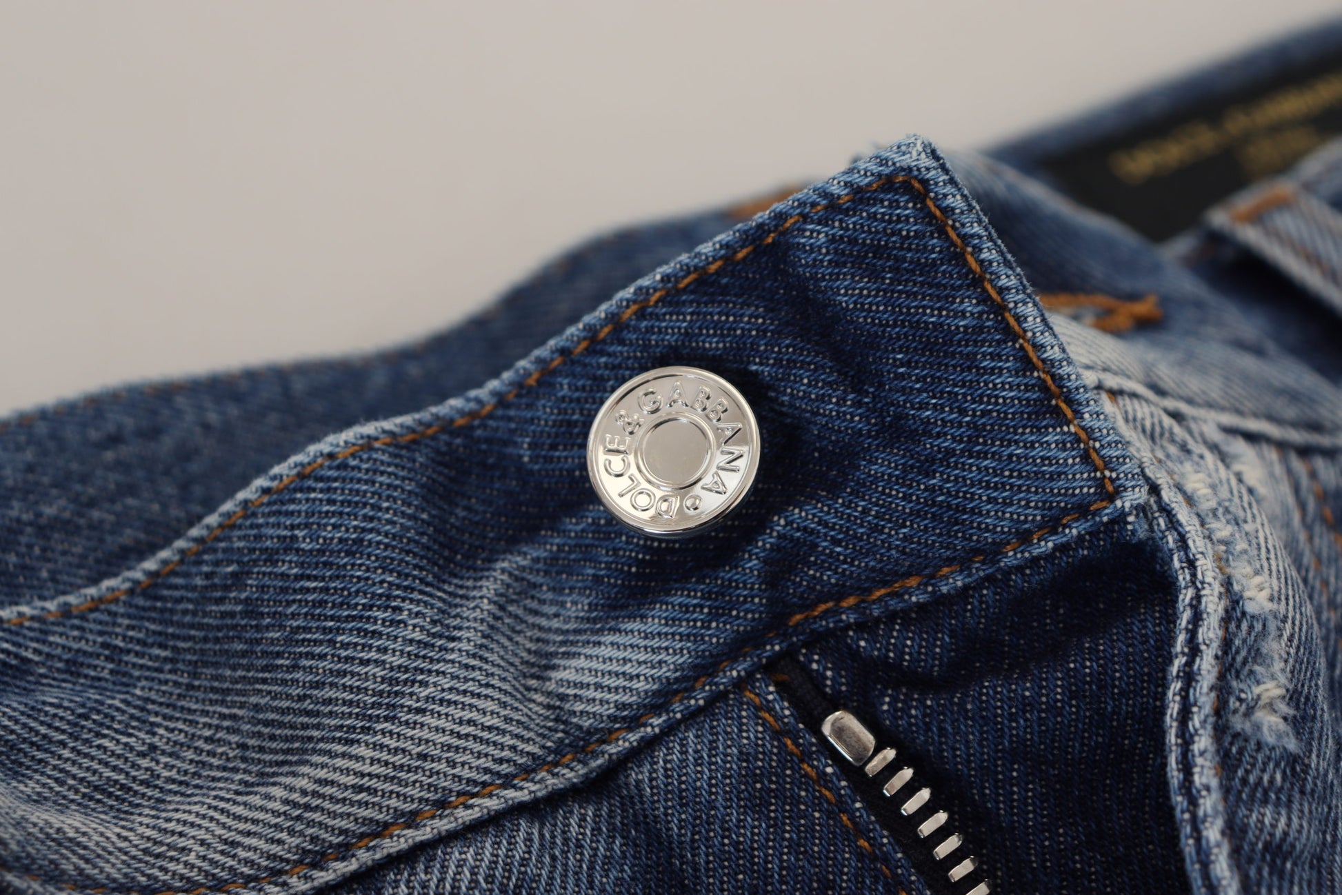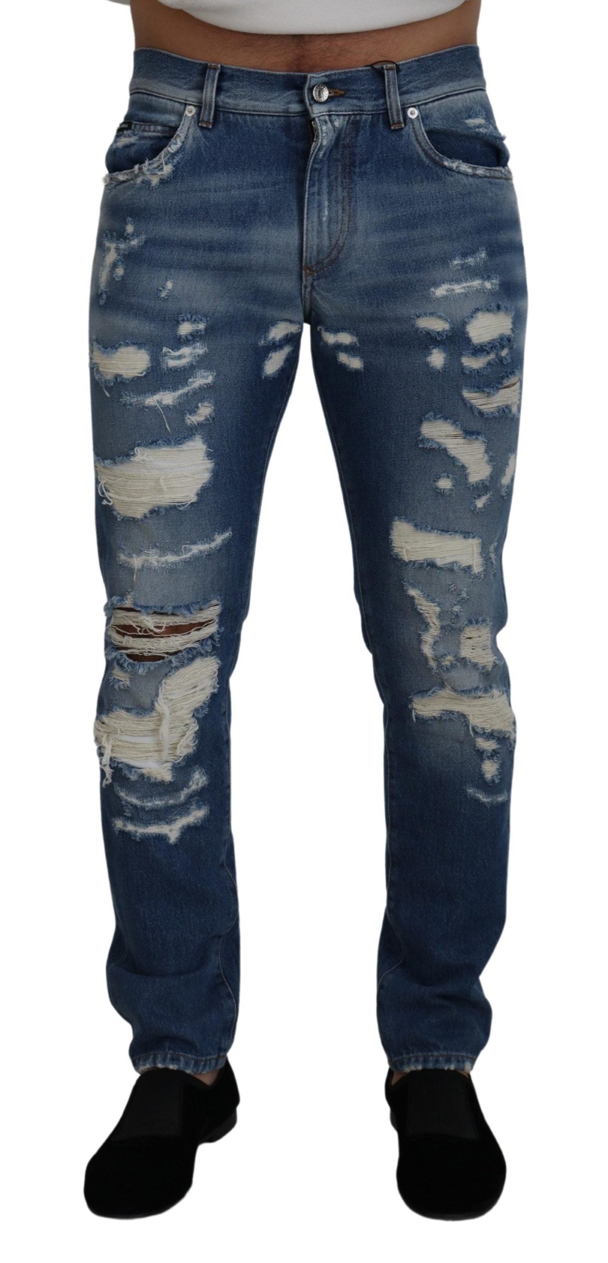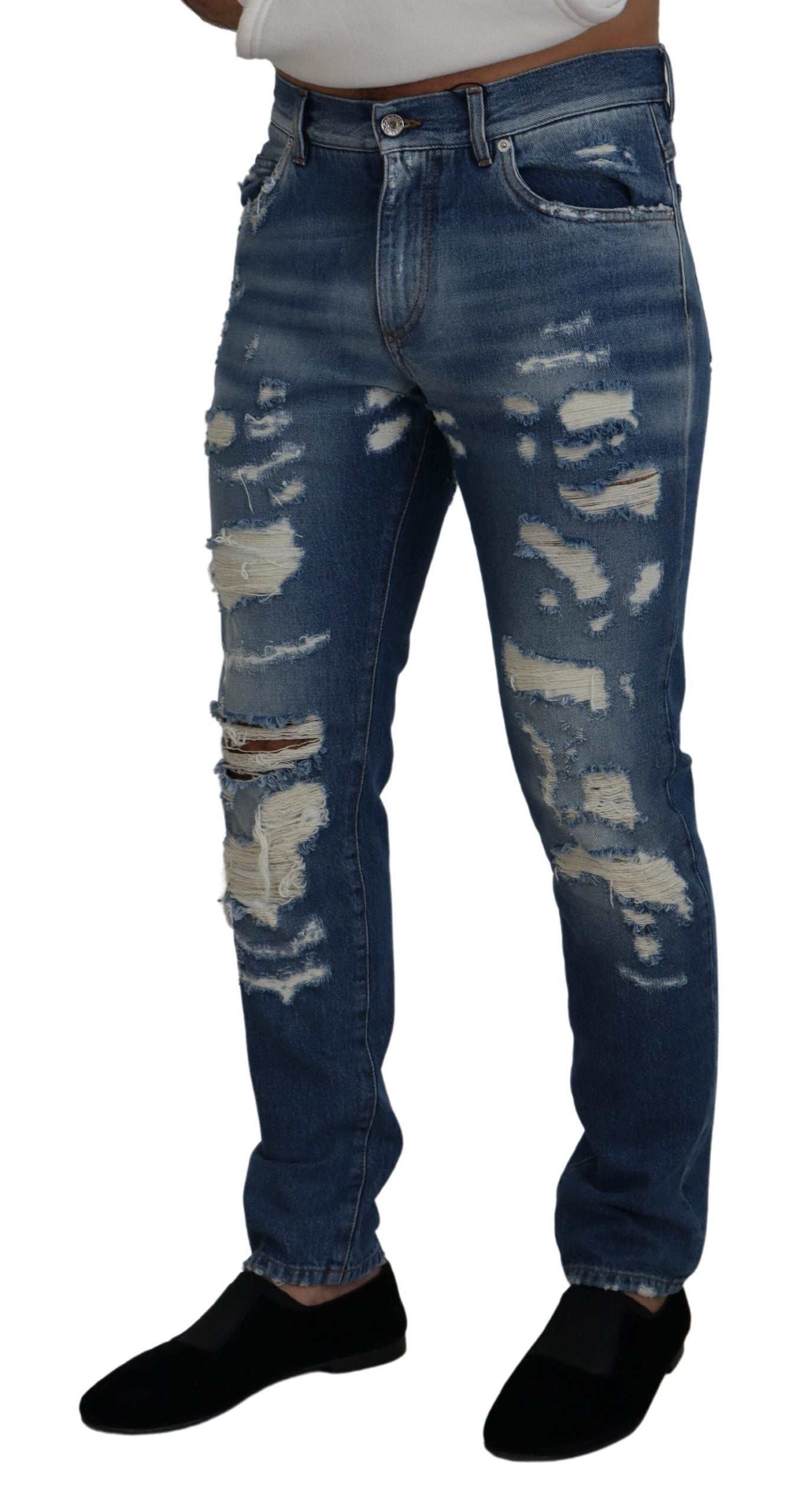 Unleash your stylish edge with these exquisite Dolce & Gabbana Distressed Denim Jeans. Expertly crafted and brand new with tags, these jeans are a testament to timeless style mixed with modern flair. The tattered detailing adds character to the blue-washed 100% cotton, ensuring both luxury and comfort. Perfect for a fashion-forward wardrobe, these jeans come straight from the heart of Italy.