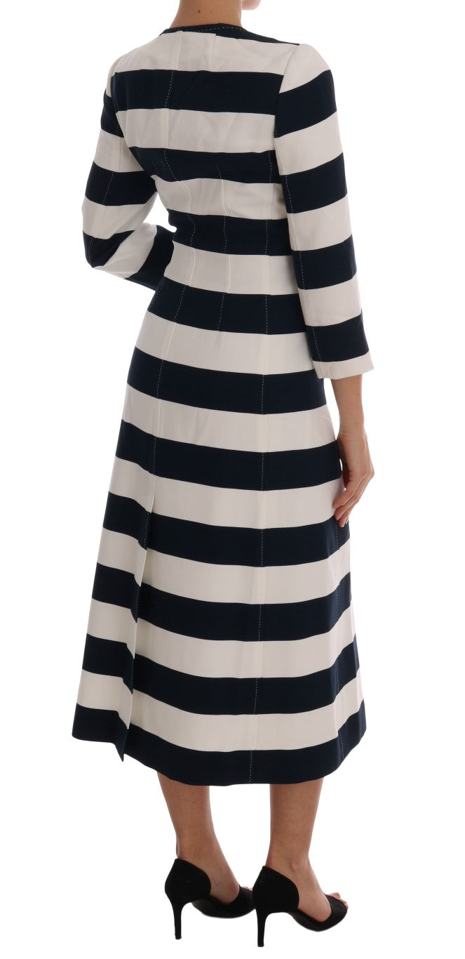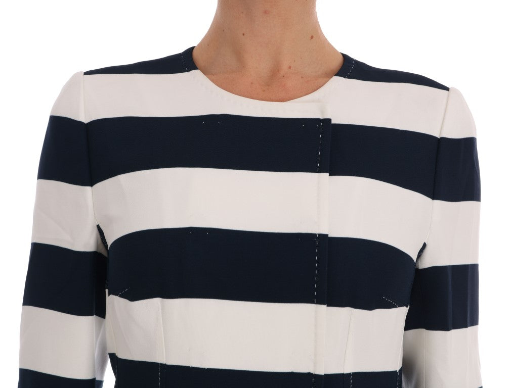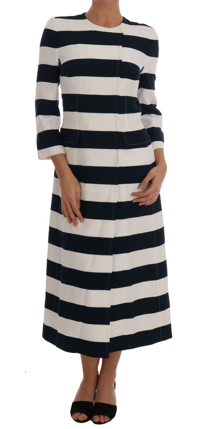 Embrace the luxurious touch of Dolce & Gabbana with this stunning blue and white striped coat jacket. This brand new, tag-attached outerwear exemplifies high fashion with its chic 3/4 sleeves and sophisticated long coat silhouette. With a full button front closure and two convenient front pockets, this piece isn’t just about style but also functionality. Its exquisite white silk stretch inner lining ensures not only a lavish look but also a comfortable fit. Crafted in Italy, this coat is a testament to meticulous craftsmanship and the exclusivity that Dolce & Gabbana is renowned for.