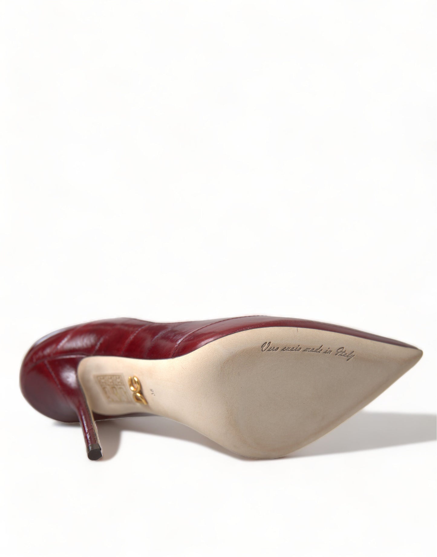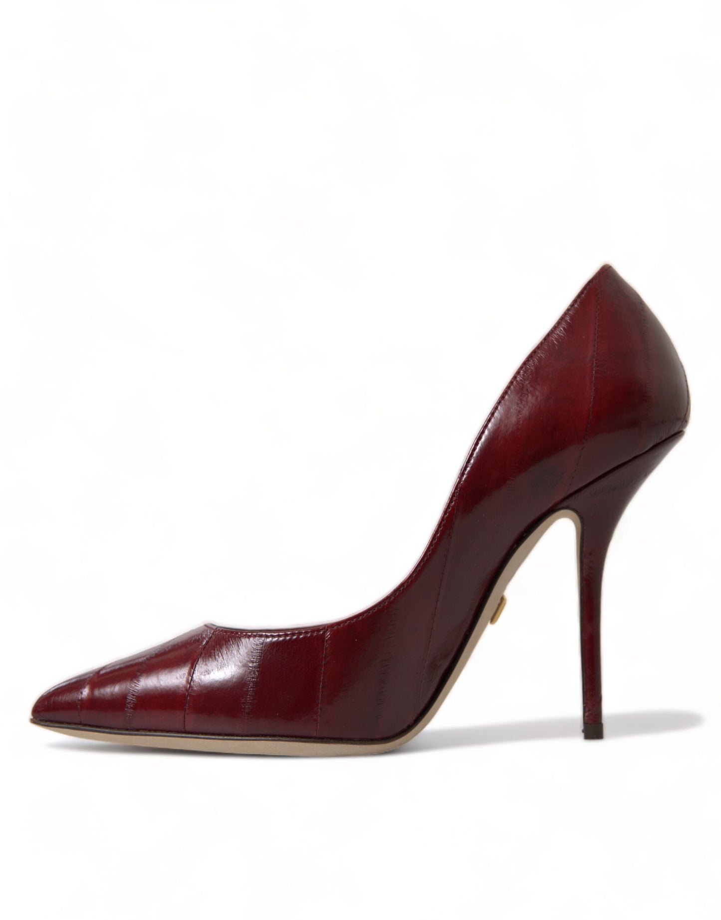 Indulge in the epitome of sophistication with these stunning high-quality pumps by Dolce & Gabbana. Crafted from luxurious 100% eel skin, these shoes boast a classic bordeaux color that exudes elegance. The comfort and style seamlessly blend together, making them a perfect choice for elevating your evening ensembles. Complete with a leather sole and delicate logo details, these pumps are a testament to Italian craftsmanship. Step into luxury and make a statement at any event.