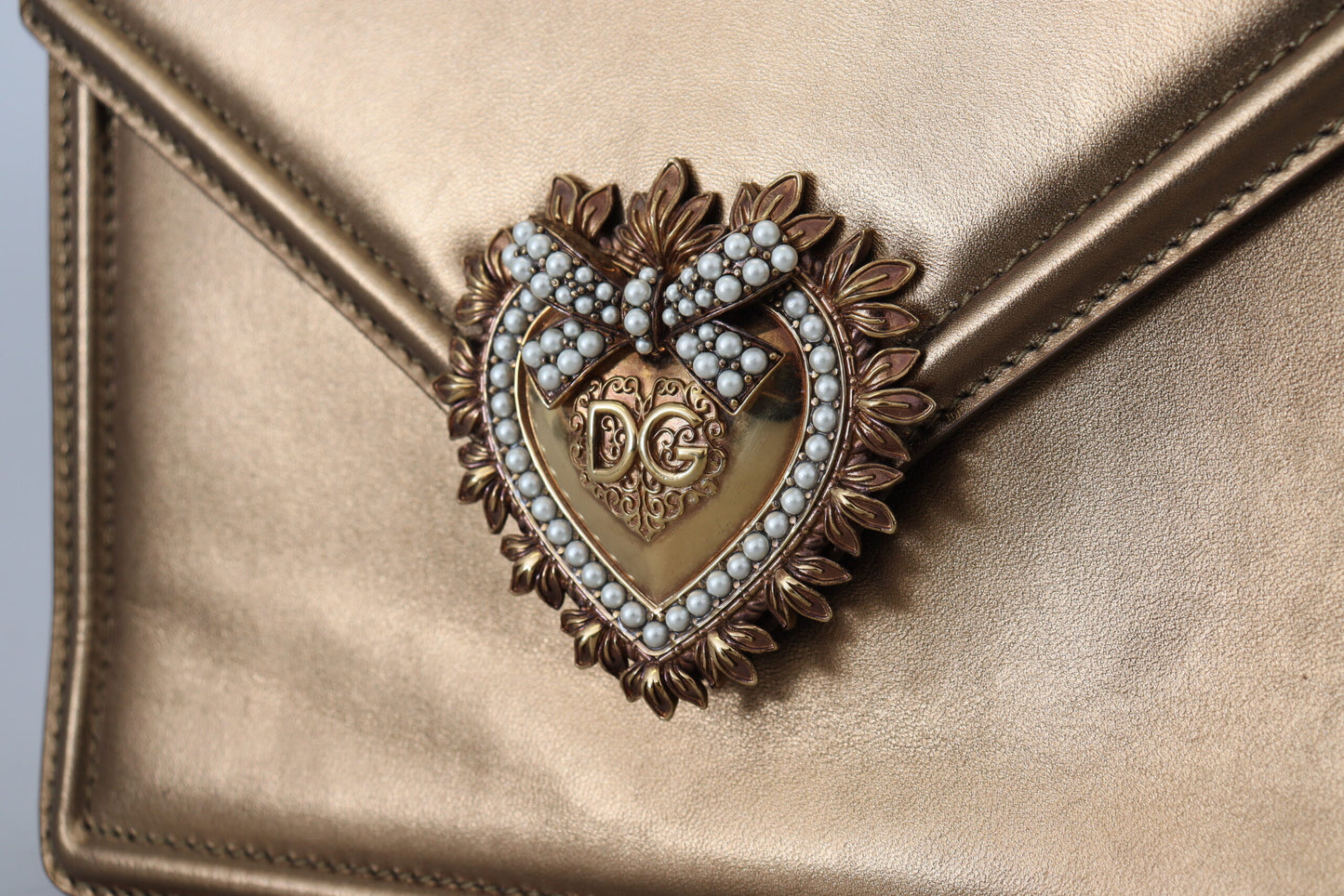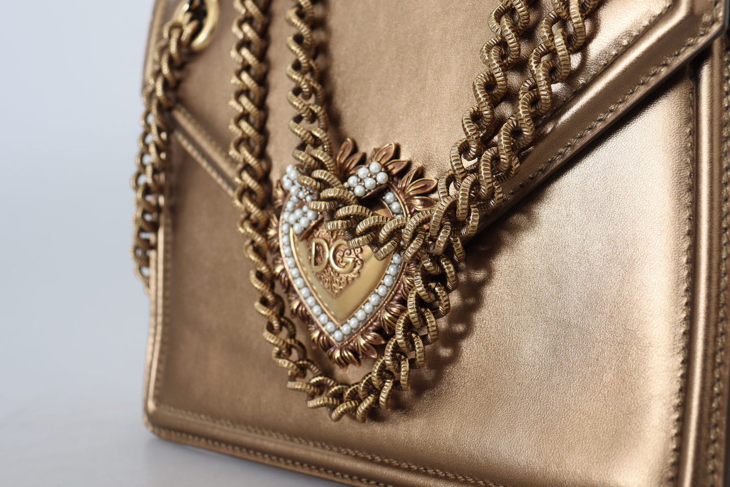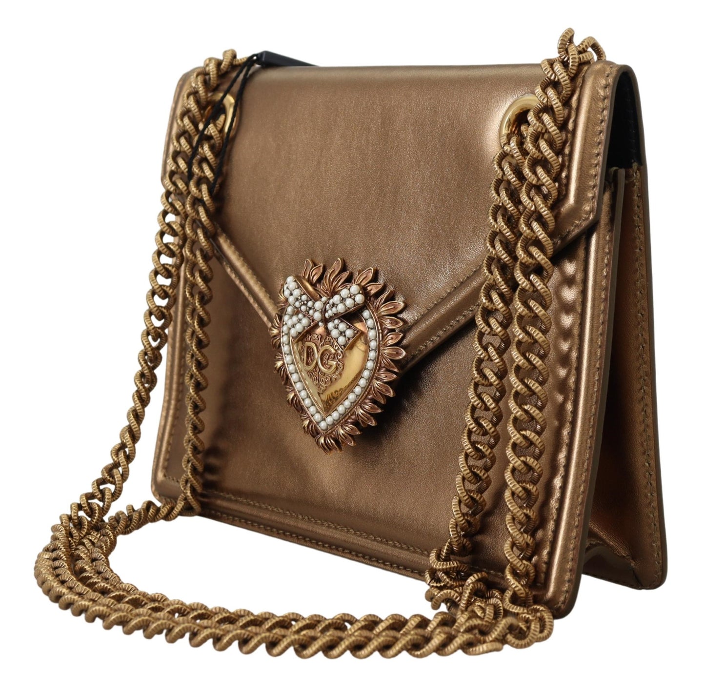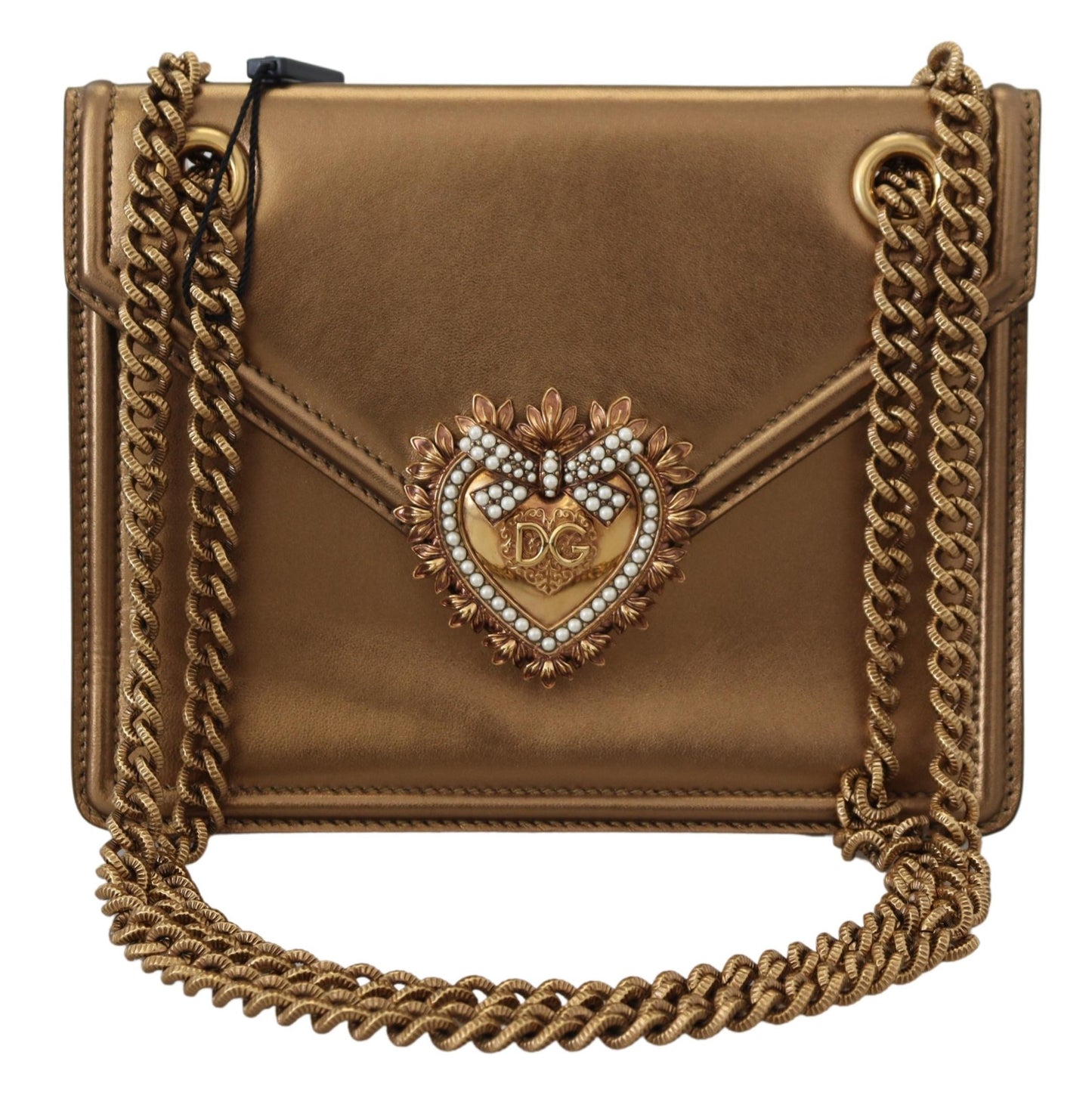 Indulge in the luxury of Italian craftsmanship with this stunning, authentic shoulder bag from Dolce & Gabbana. Featuring a sophisticated bronze hue complemented by gold metal detailing, this Devotion shoulder bag is a must-have accessory for those with an eye for elegance and style.