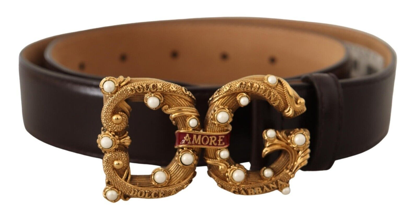 Adorn your waistline with the epitome of luxury with this Dolce & Gabbana Amore belt. This exquisite piece boasts not just impeccable craftsmanship but also a vintage-brass logo buckle. Its unique charm is further enhanced by an enameled red scroll and glossy artificial pearls, making it a statement accessory for any fashion connoisseur.