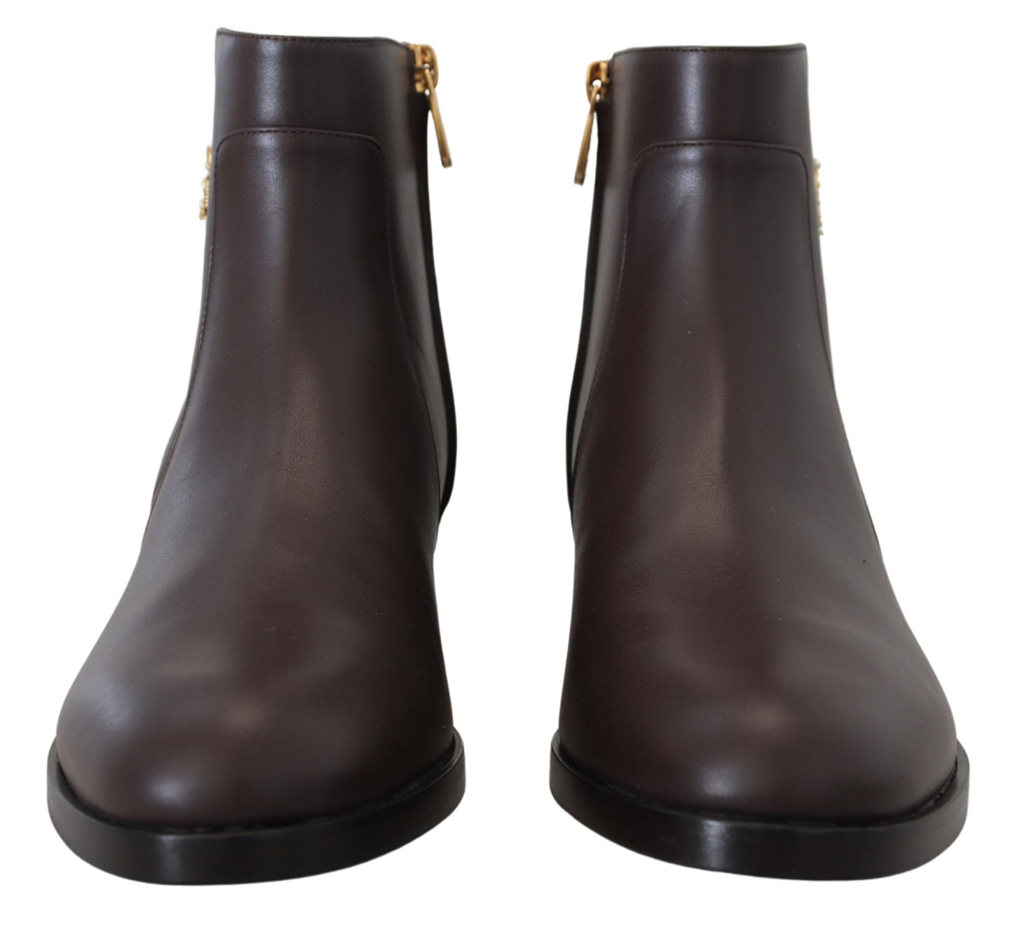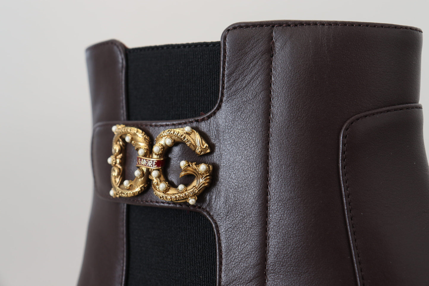 Step into luxury with these sophisticated, brand new Dolce & Gabbana women’s ankle boots. Exquisitely crafted in Italy, these boots flaunt a stunning gold DG pearl accent on the side, complementing the rich brown hue that encompasses the design. Designed with a sleek leather sole and featuring a convenient zipper along with a stretch band for ease of wear, these boots are a true testament to the elegance and craftsmanship Dolce & Gabbana is renowned for.