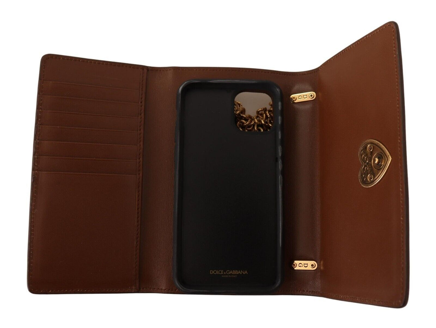 Indulge in the blend of luxury and functionality with this exquisite Dolce & Gabbana iPhone11 Pro clutch purse. This piece isn’t just a cover case; it doubles as a chic shoulder purse bag, perfect for safeguarding your device in style. Its devotion model is beautifully crafted from high-quality leather, boasting a rich brown hue paired with lustrous gold metal detailing. Keep your essentials organized with convenient inside card slots and secure everything with the magnet flap closure. The brown leather inner lining adds an extra touch of elegance, while the detachable chain strap offers versatile carrying options. Proudly made in Italy, this accessory delivers both fashion and practicality to your everyday ensemble.