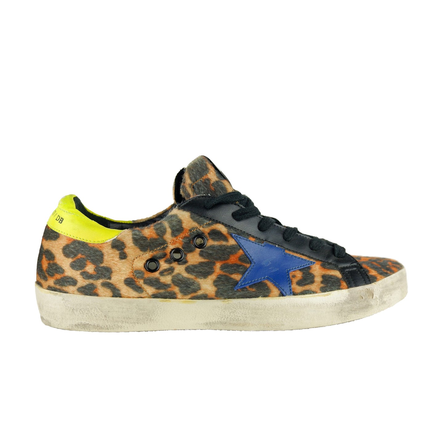 Step out in style with these opulent calf leather sneakers, boasting a trendy leopard print pony hair exterior. The vibrant yellow fluo leather heel counter adds a pop of color, while the iconic blue leather star logo gives these kicks a distinctive edge. Expertly crafted with a durable rubber sole, these shoes ensure both comfort and elegance. Made with impeccable Italian craftsmanship, they are the epitome of luxury casual wear.