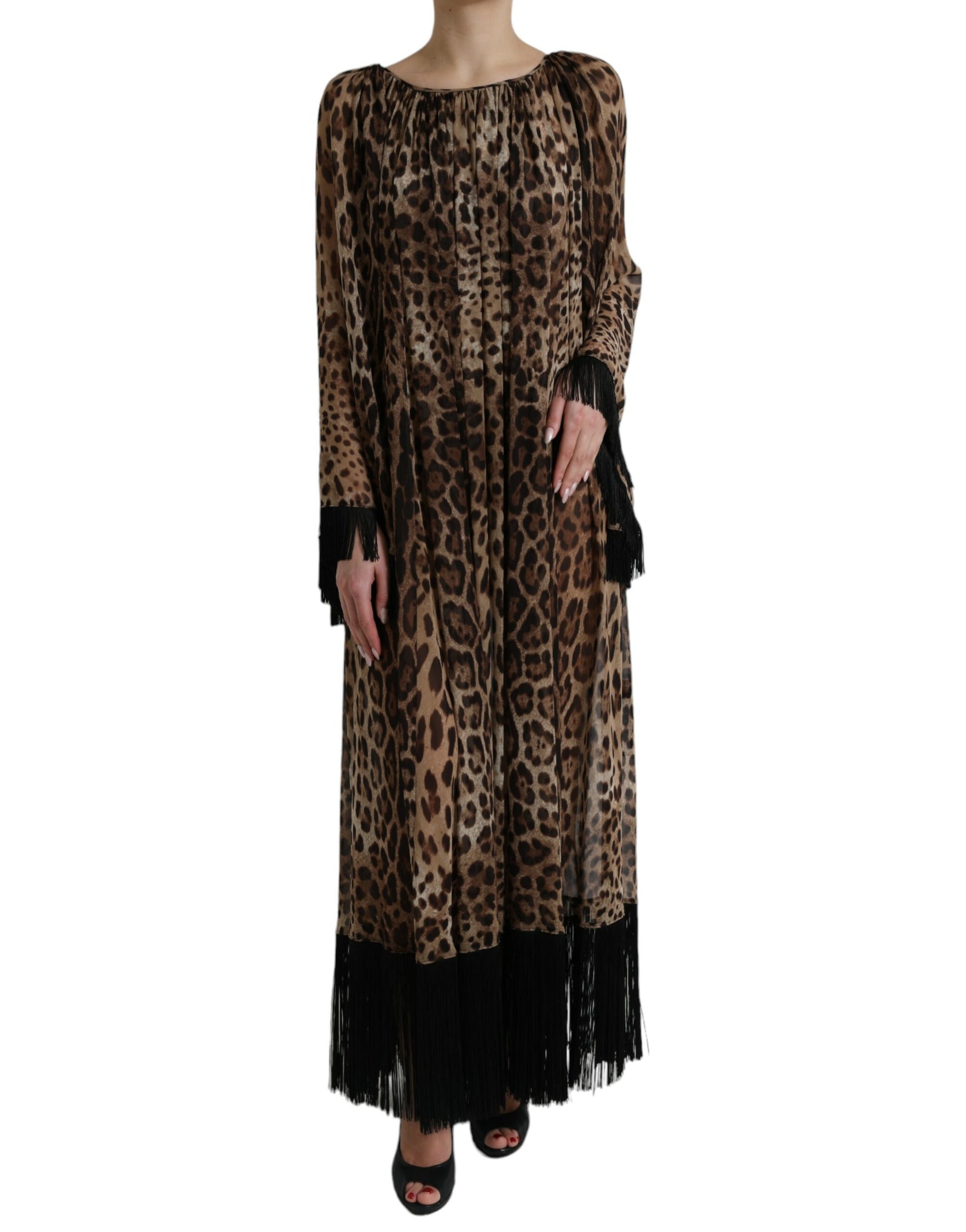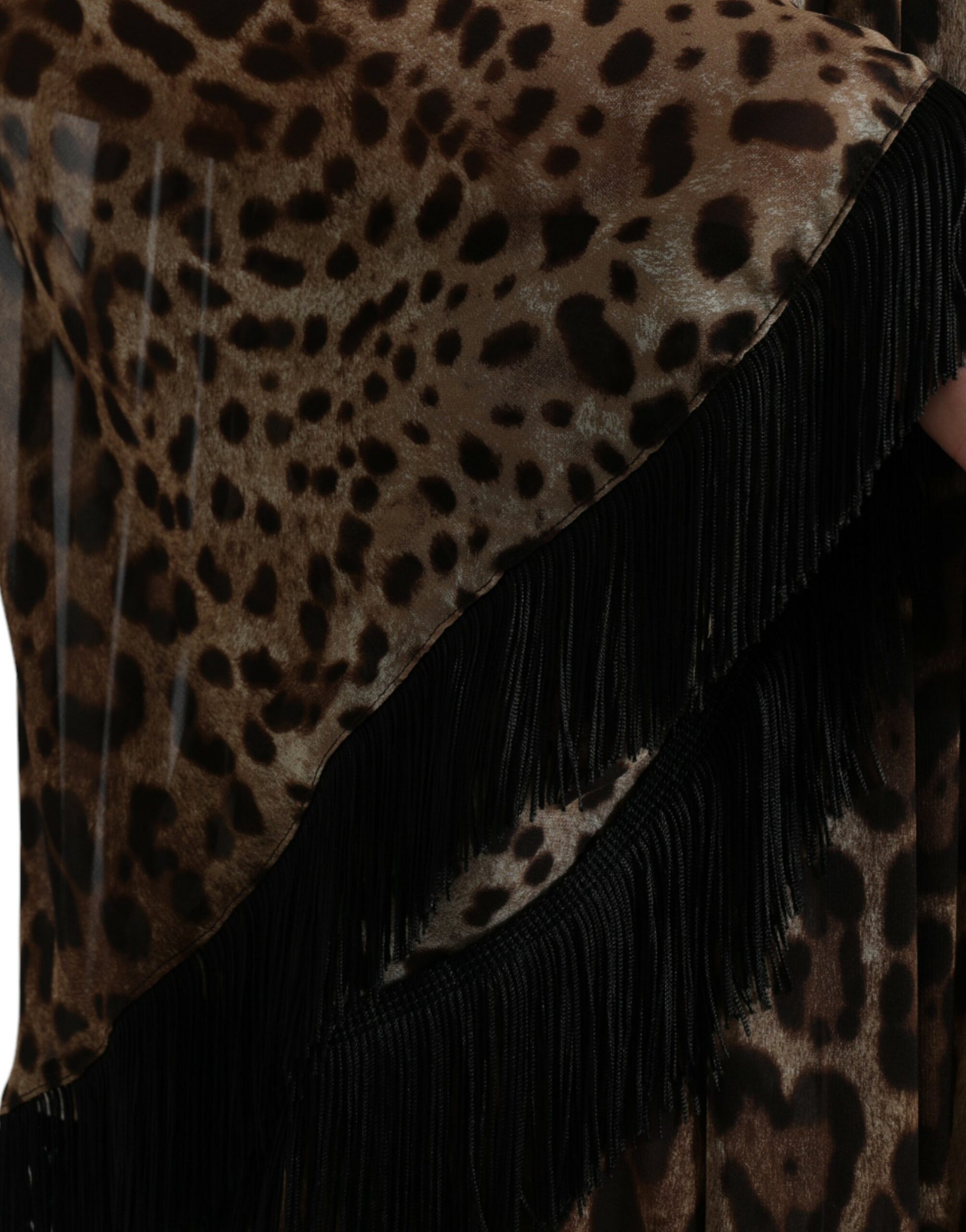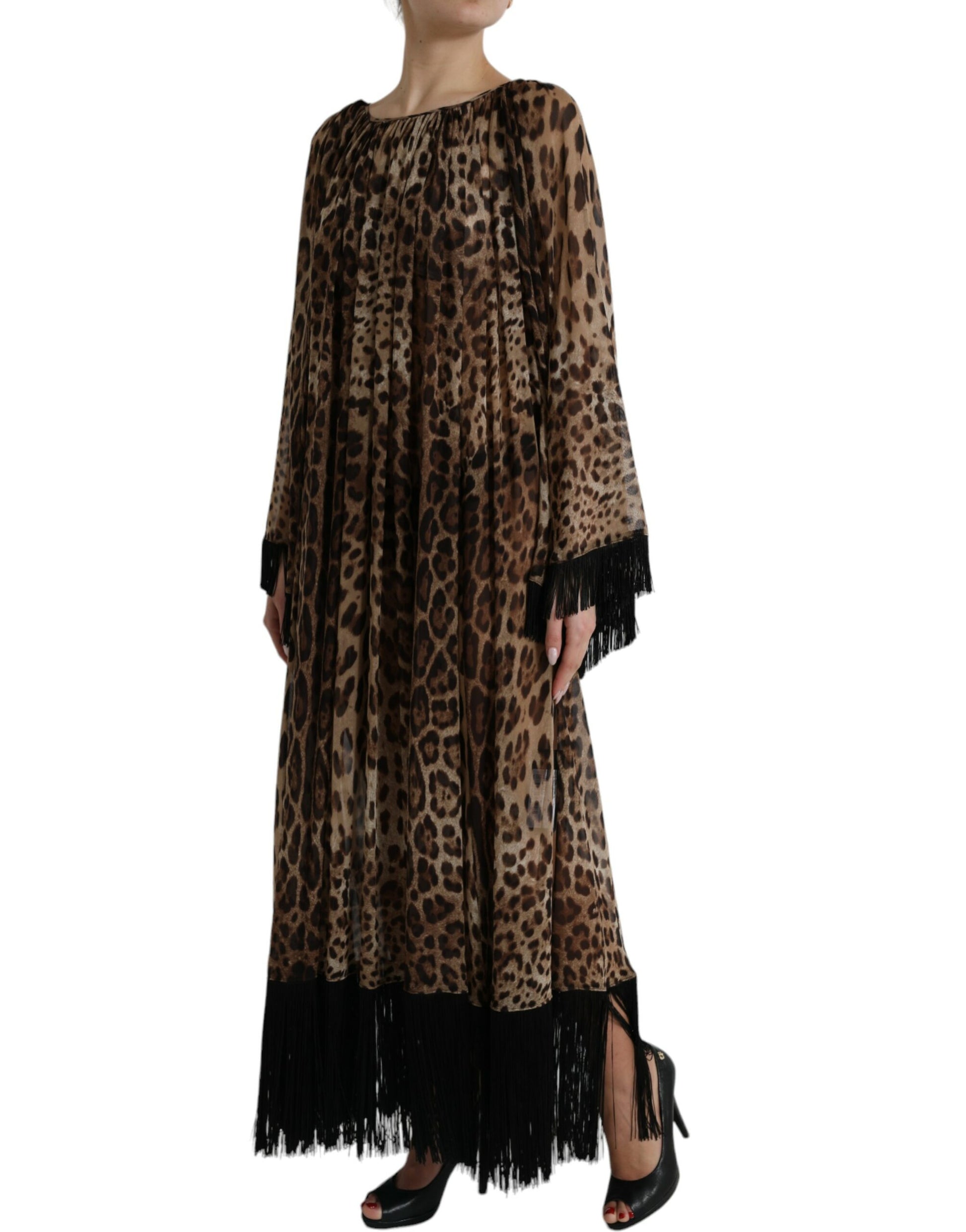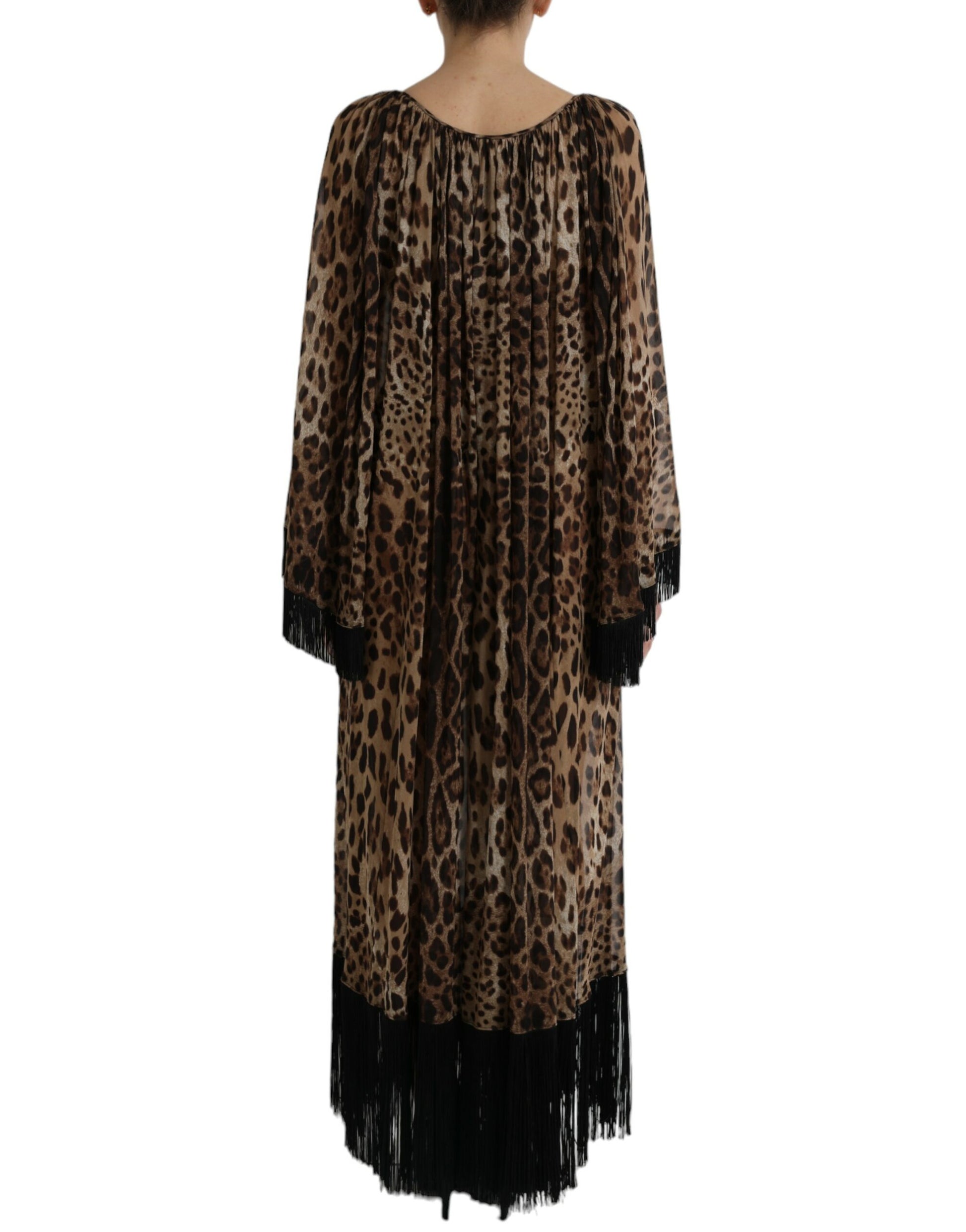 Brown Leopard Silk Kaftan Fringes Maxi Dress
