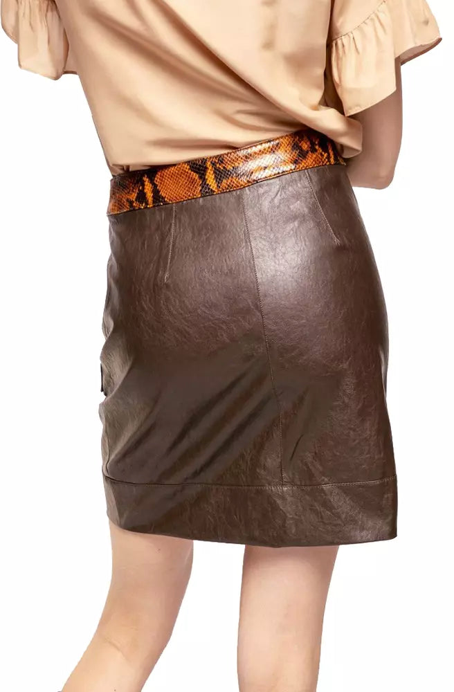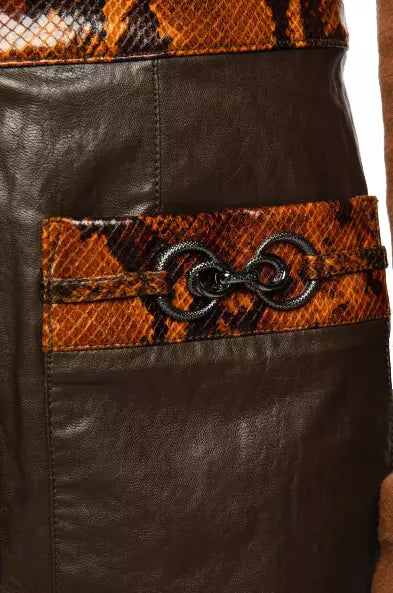 Embrace your edgy yet sophisticated style with this eco-leather skirt, designed to make a bold statement. This skirt features a sleek automatic button closure and is adorned with eye-catching python print details that exude luxury. The two front pockets are elegantly finished with metallic ring decorations for a touch of glamour. This skirt seamlessly blends functionality with high-end fashion, making it a versatile addition to your wardrobe.