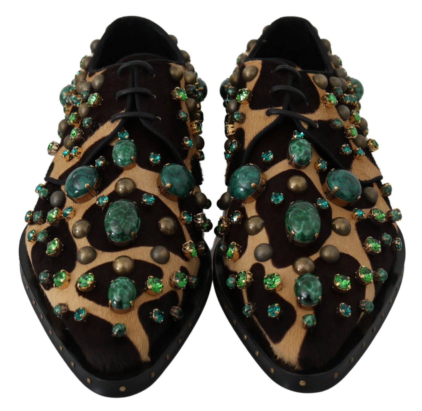 Exude elegance with these stunning Dolce & Gabbana dress shoes, perfect for adding a touch of glamour to any outfit. These shoes are brand new, come with tags, and feature a chic giraffe animal pattern. Embellished with multicolor crystals and crafted with high-quality pony hair, these shoes are a testament to exquisite craftsmanship. A luxurious leather sole completes the look, ensuring comfort without compromising style. Step into Italian luxury and make a statement with shoes that are as unique as you are.