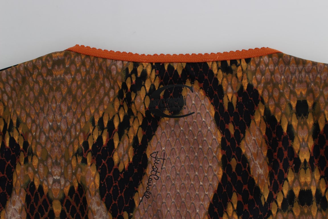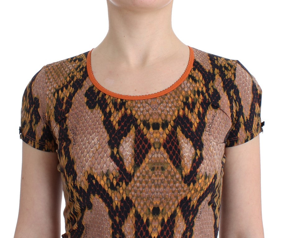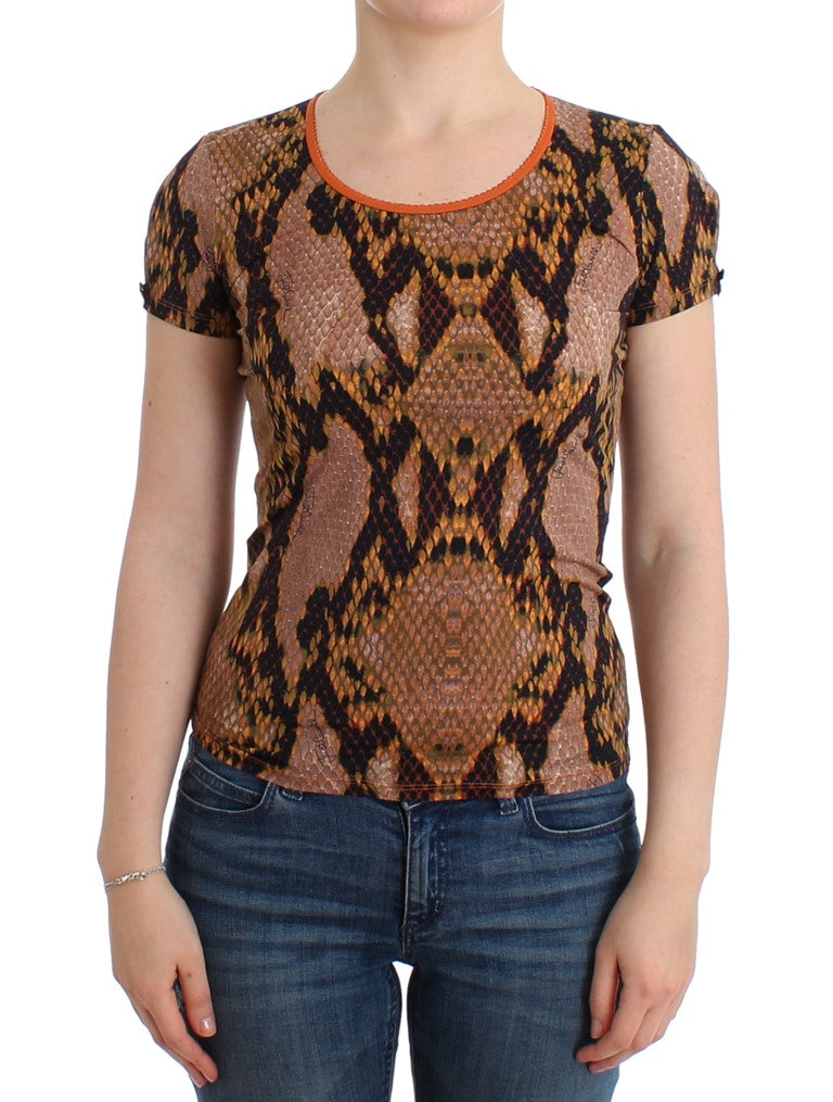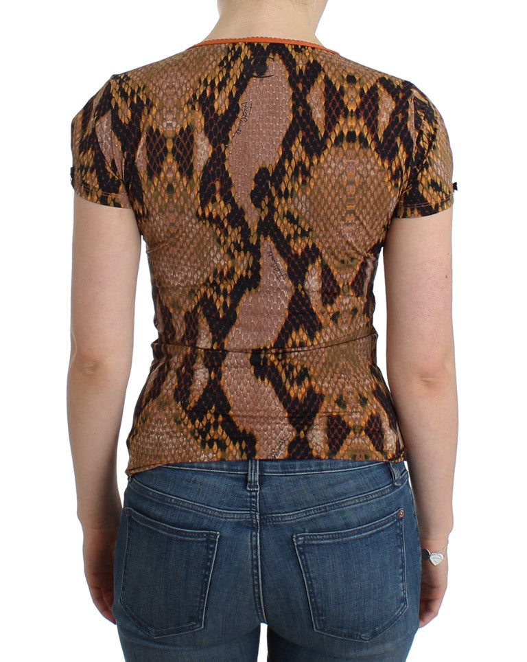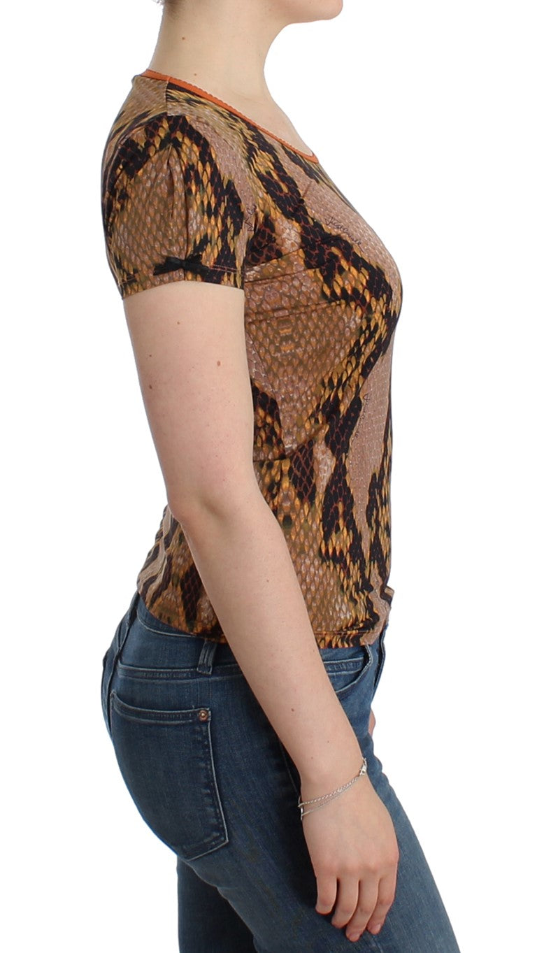 Immerse in the wild elegance with this stunning Snake Print Crewneck T-shirt from Cavalli. With its striking brown and orange snake print design, this top is a statement piece that blends contemporary style with a touch of exotic charm. Crafted with a luxurious blend of polyamide and elastane, it ensures a flattering, comfortable fit that moves with you. Perfect for adding a bold twist to your wardrobe, it comes brand new with tags and packaged in the original store bag, guaranteeing authentic Cavalli excellence.