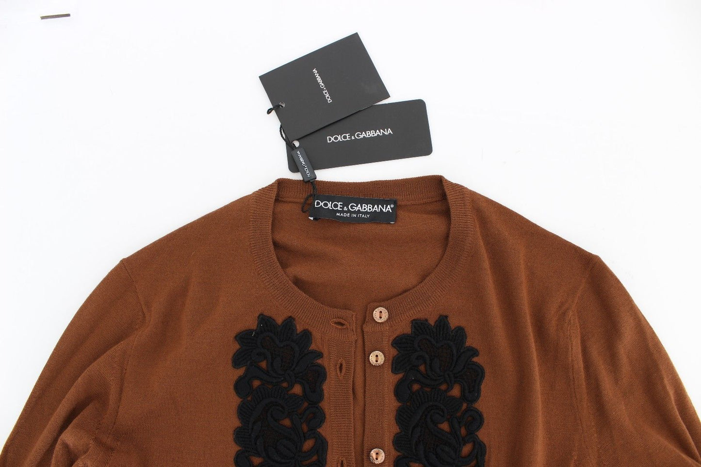 Indulge in the timeless elegance of this luxurious cardigan sweater, a piece that exemplifies the chic craftsmanship of Dolce & Gabbana. A blend of cozy wool and delicate lace, this item proudly aligns with the revered MainLine Collection, inspired by Monica Bellucci’s representation of the SICILY line. It features a harmonious combination of brown and black, adorned with a full front button closure and the subtle yet distinguished logo details. Crafted with passion in Italy, this cardigan is not just a wardrobe essential but a runway catwalk treasure designed to elevate your fashion status.