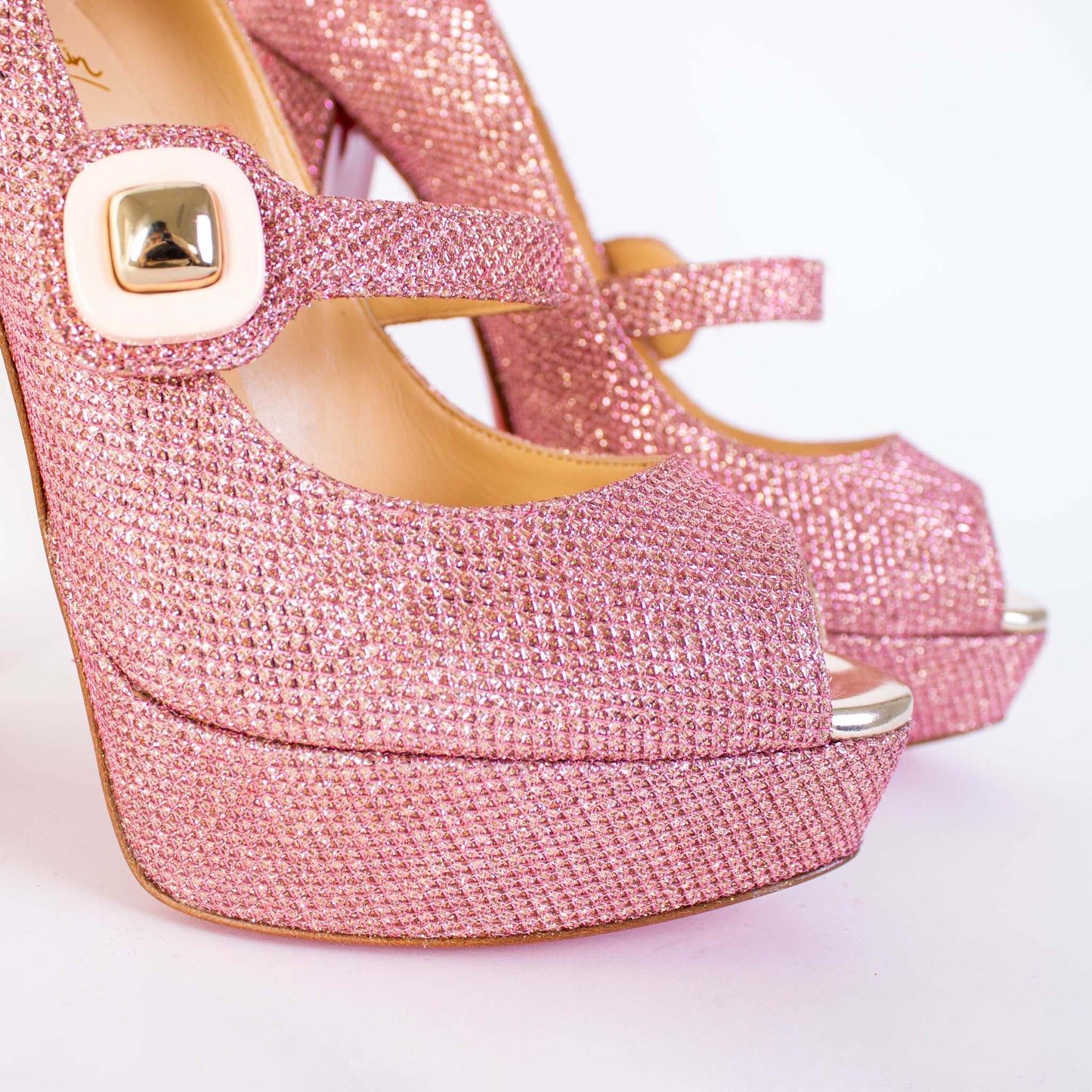Step out in style with these stunning, brand new pink glitter sandals from Christian Louboutin. Perfect for adding a touch of glamour to any ensemble, these sandals feature a chic open toe with a front strap and a decorative, non-openable button detail. The towering 14 cm heel will elevate your look to new heights, literally and fashionably. Crafted with the finest materials, combining both leather and fabric, these heels are a testament to Italian craftsmanship, offering both luxury and comfort.