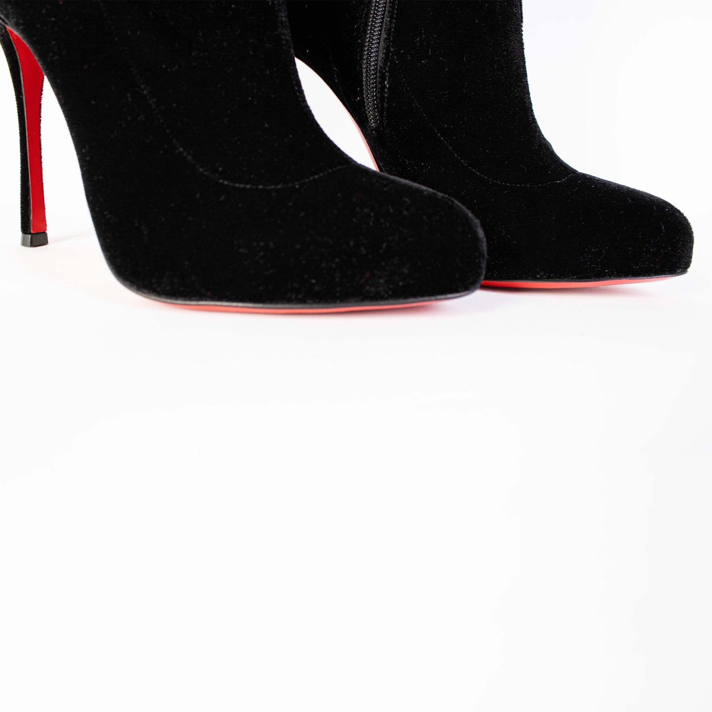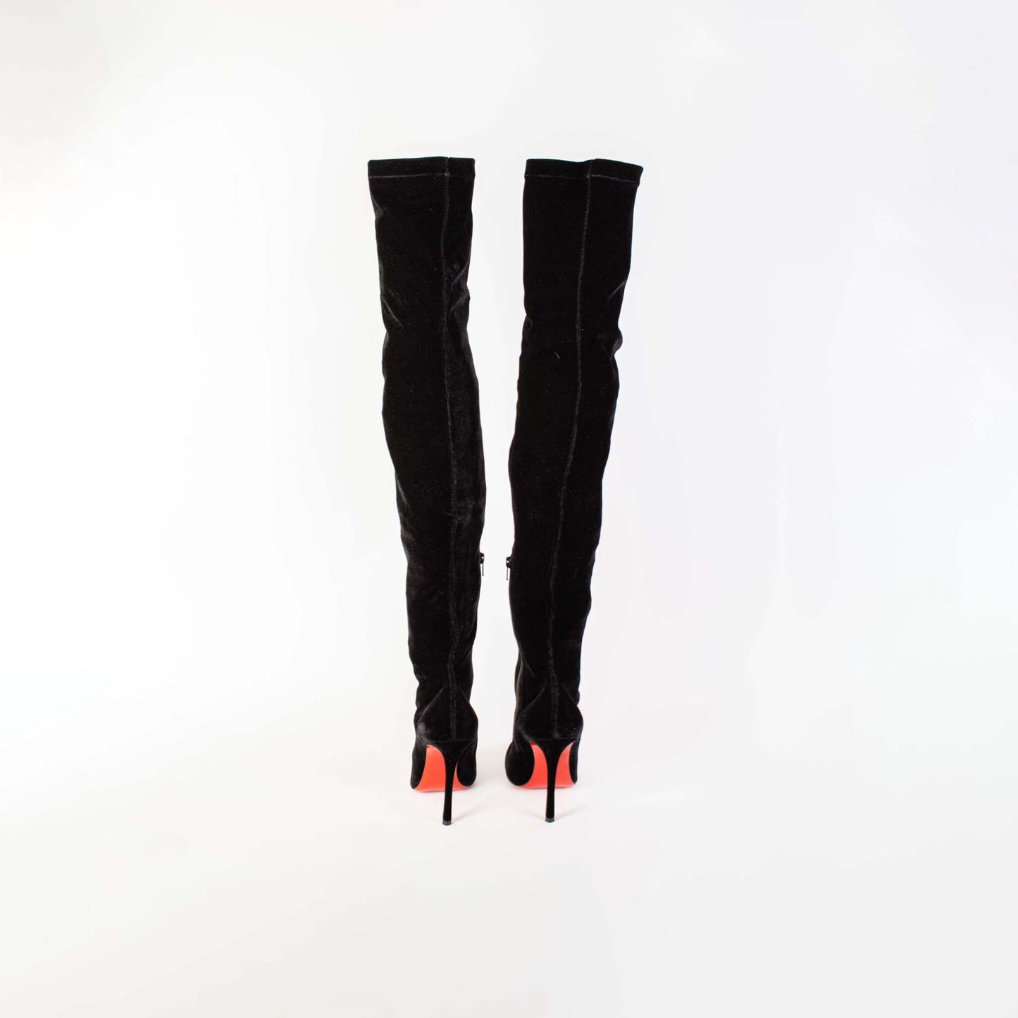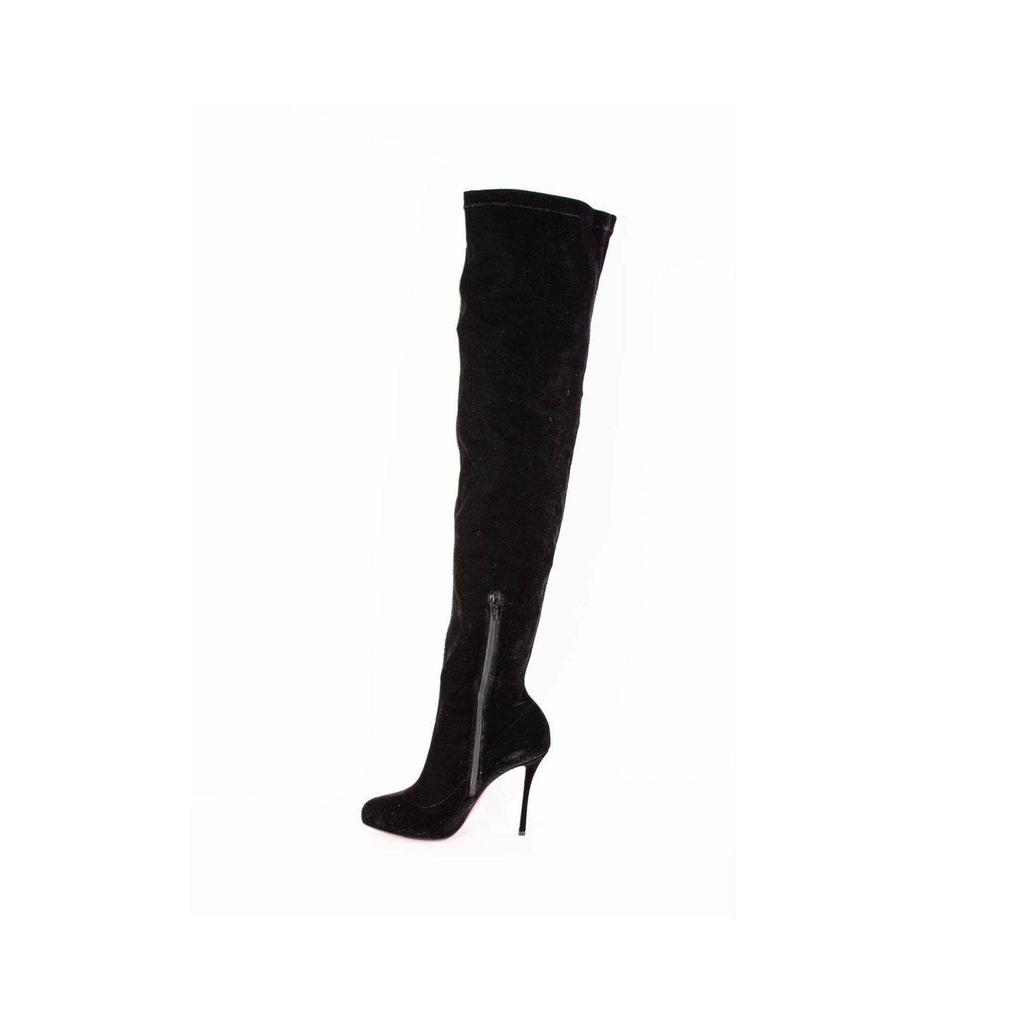 Discover the epitome of luxury and elegance with these stunning high-leg boots, crafted from the finest velvet and leather materials for a sleek and sophisticated look. Designed by the iconic Christian Louboutin, these boots feature a slim, covered heel and a convenient half-zip on the side, ensuring both style and comfort. Their distinctive silhouette, with a slightly rounded toe and an impressive 61 cm leg length (based on size 40.5), is sure to elevate any ensemble. Made in Italy, these boots represent the ultimate in high-fashion footwear.