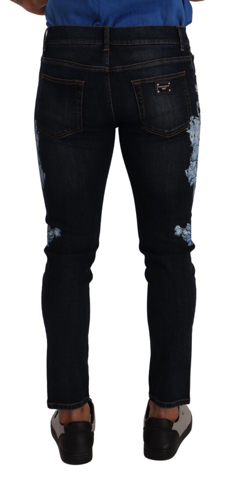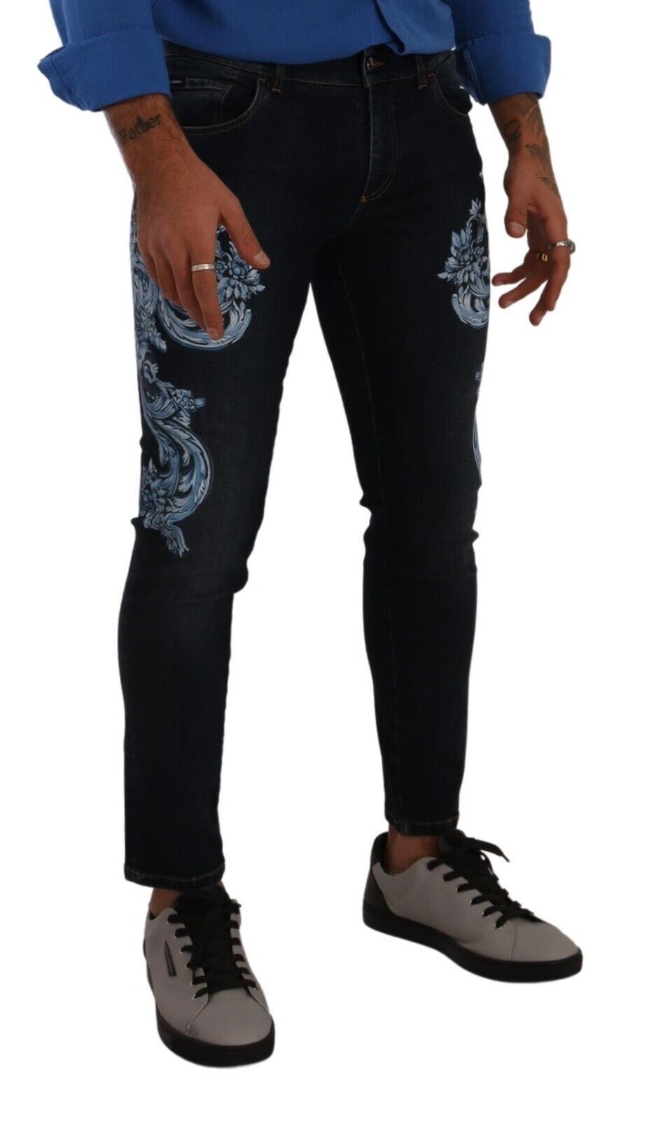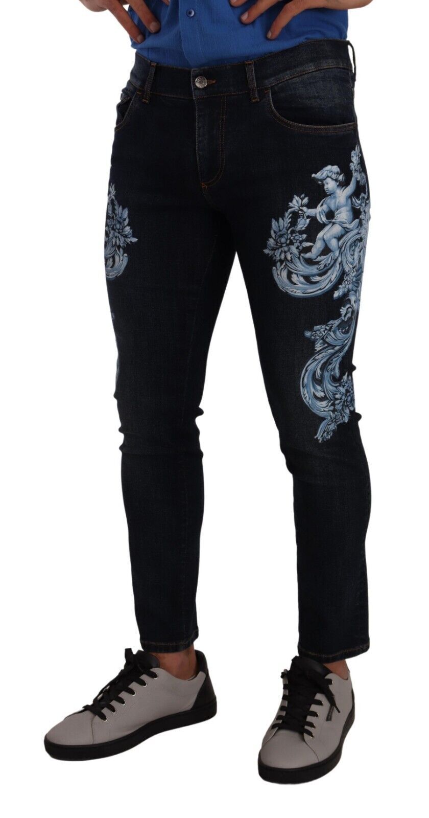 Add a touch of divine style to your wardrobe with these Dolce & Gabbana skinny jeans. Featuring a unique angel print, these dark blue wash jeans are a perfect fusion of high fashion and comfort, tailored for a slim fit with a classic zipper and button closure. Indulge in Italian craftsmanship and logo detail that sets you apart.