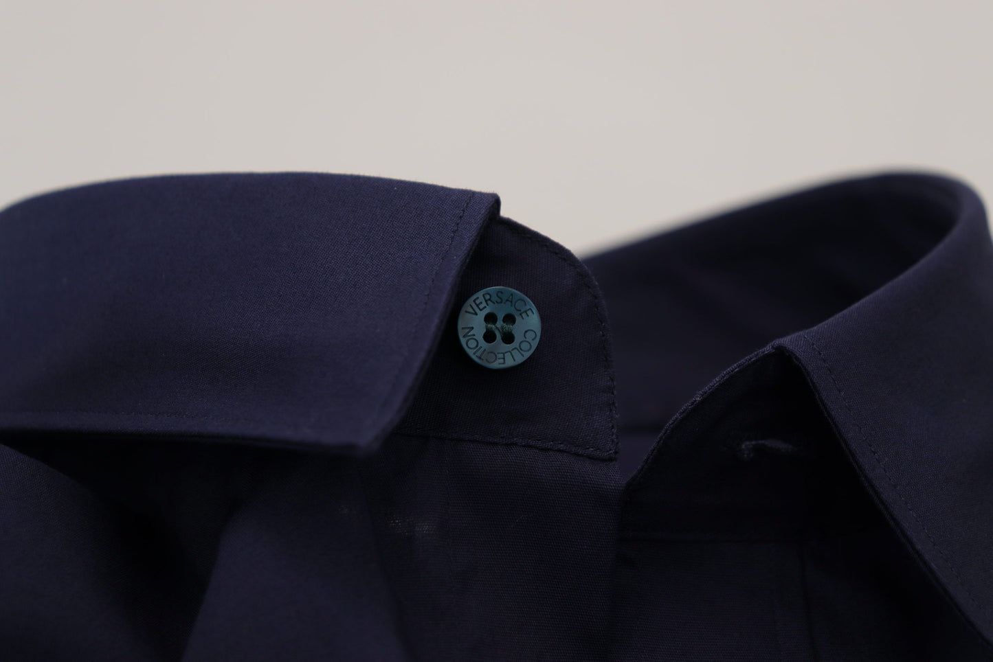 Step into stylish sophistication with the illustrious Versace Collection Dark Blue Dress Shirt. Crafted from a high-quality cotton blend, this shirt ensures both great fitting and comfort, making it an excellent choice for any formal occasion. Featuring a sleek spread collar and full button closure, it’s finished with signature barrel cuffs and subtle logo details that resonate with the luxury of the Versace brand.
